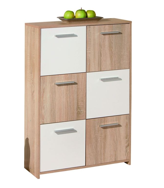 Die Kombination der Trendfarben Sonoma-Eiche Nachbildung und Weiß verleiht der Kommode eine elegante und moderne Optik. Die Melaminbeschichtung sorgt dafür, dass die Oberfläche kratz- und reibungsfest ist und lange schön bleibt.