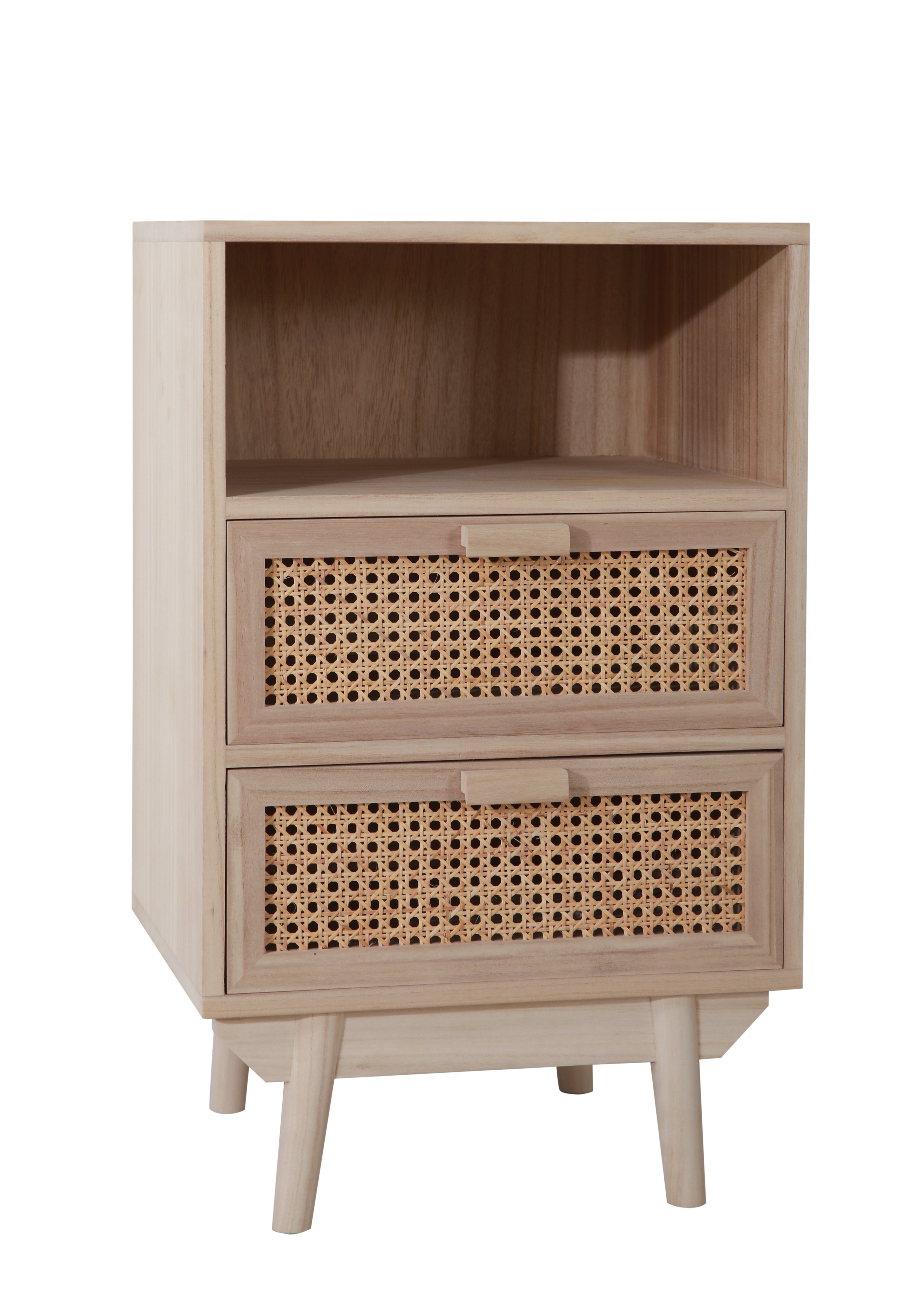 Korpus und Front: MDF (Mitteldichte Holzfaserplatte) mit Paulownia Holzfurnier (China) und Rattanfront