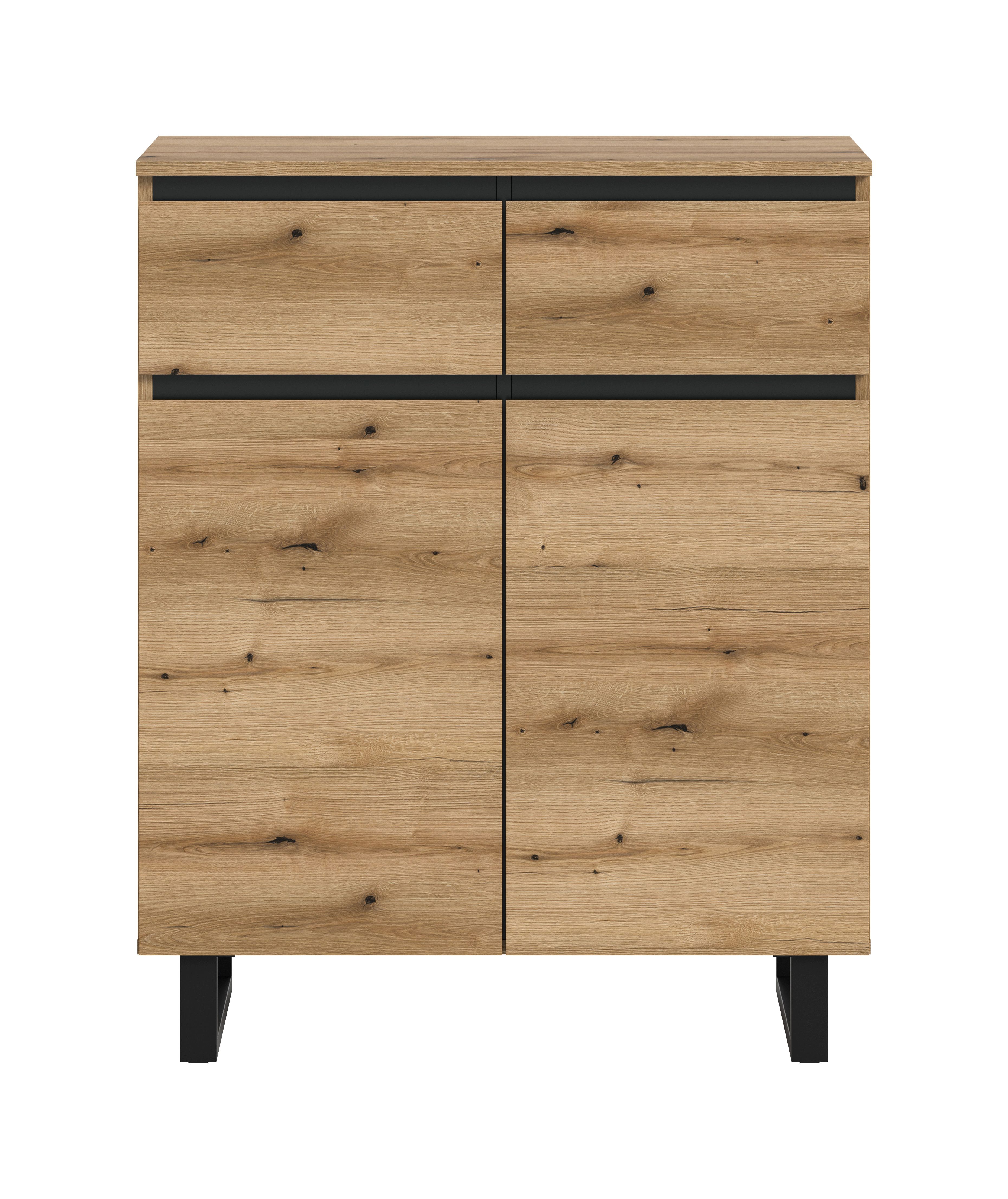 Die Kommode in Evoke Eiche Holznachbildung (80 x 99 x 36 cm) überzeugt durch ihre durchdachte Aufteilung mit zwei Türen, zwei höhenverstellbaren Einlegeböden, vier Fächern und zwei Schubkästen. Die hochwertig verarbeitete, pflegeleichte Oberfläche mit abgesetzer schwarzer Schattenfuge sorgt für eine moderne und elegante Optik. Diese Kommode bietet dir viel Stauraum für Wohnaccessoires, Kleidung oder andere Gegenstände und unterstützt eine ordentliche und stilvolle Raumgestaltung. Die robuste Konstruktion garantiert Langlebigkeit und Stabilität. Die Kommode lässt sich vielseitig kombinieren und ist eine praktische Ergänzung für verschiedene Wohnbereiche. Mit diesem Möbelstück schaffst du Ordnung und Stil in deinem Zuhause.