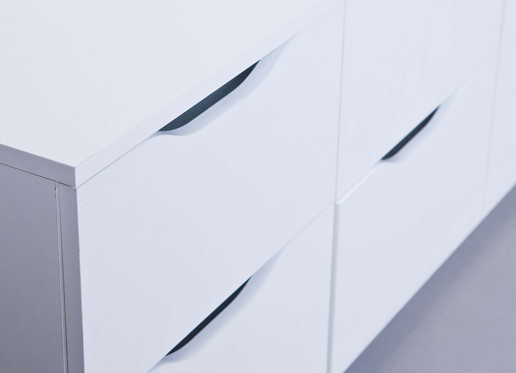 Die weiße, matte Oberfläche der Kommode ist melaminbeschichtet, was sie nicht nur optisch ansprechend, sondern auch besonders kratzfest und pflegeleicht macht.