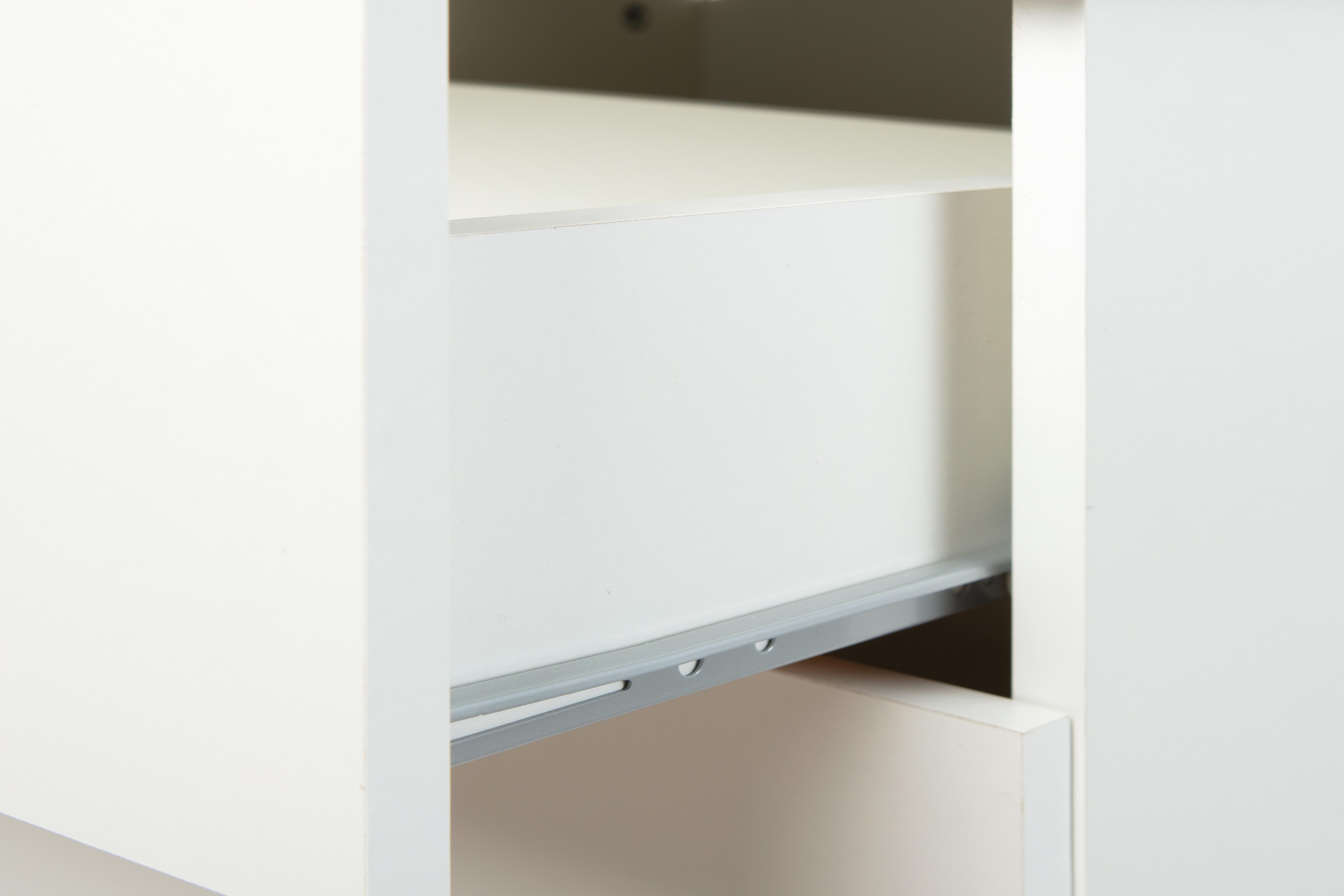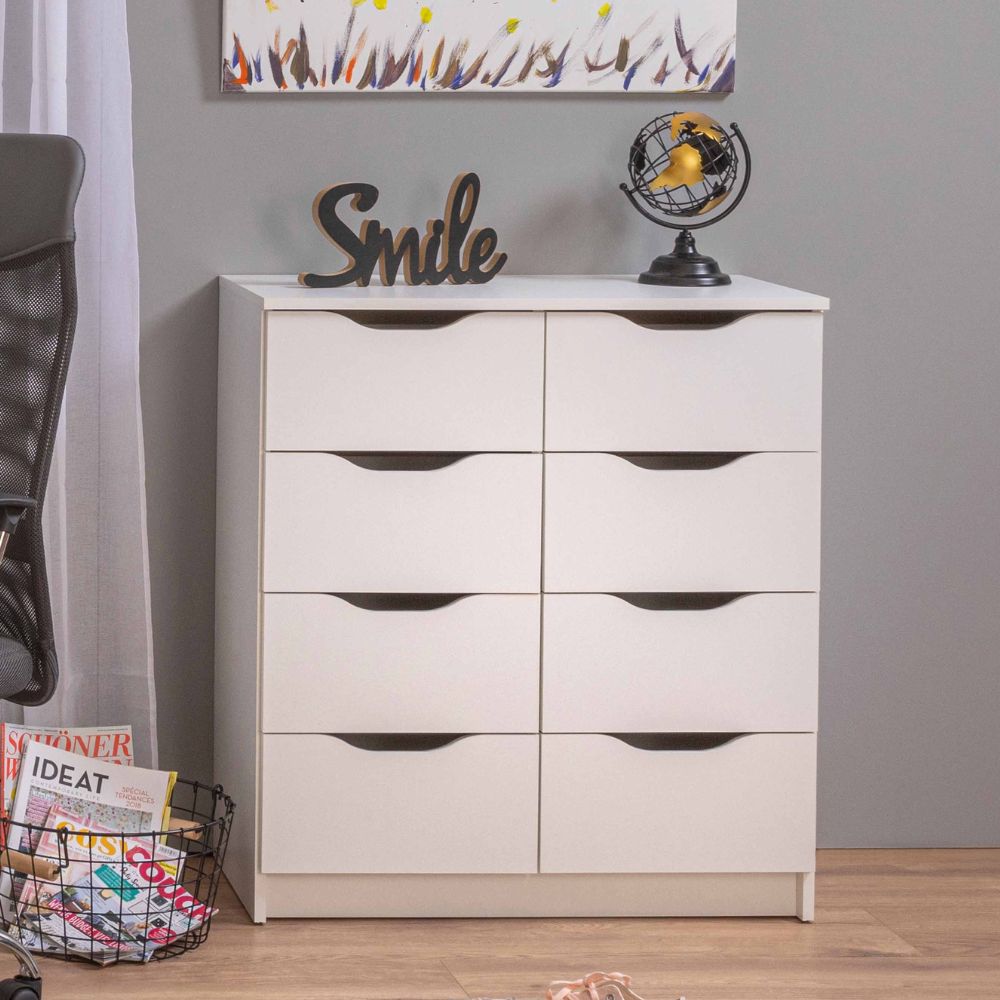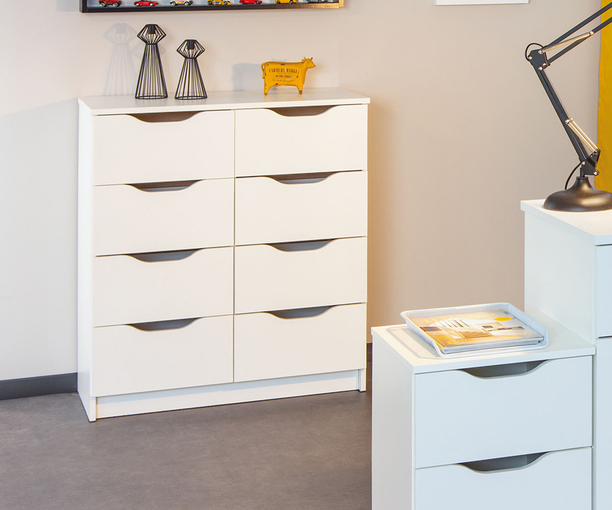 Die weiße, matte Oberfläche der Kommode ist melaminbeschichtet, was sie nicht nur optisch ansprechend, sondern auch besonders kratzfest und pflegeleicht macht.