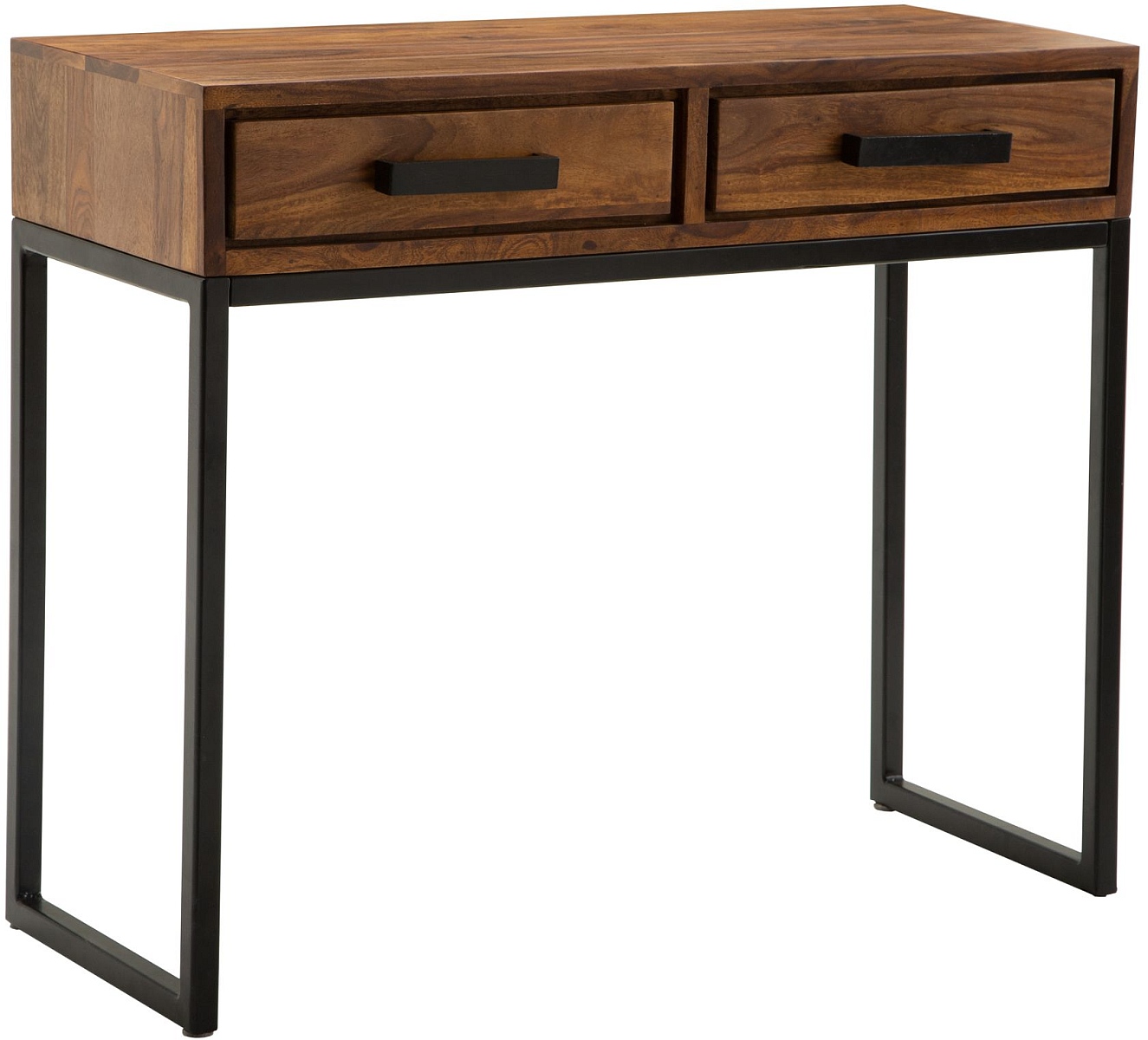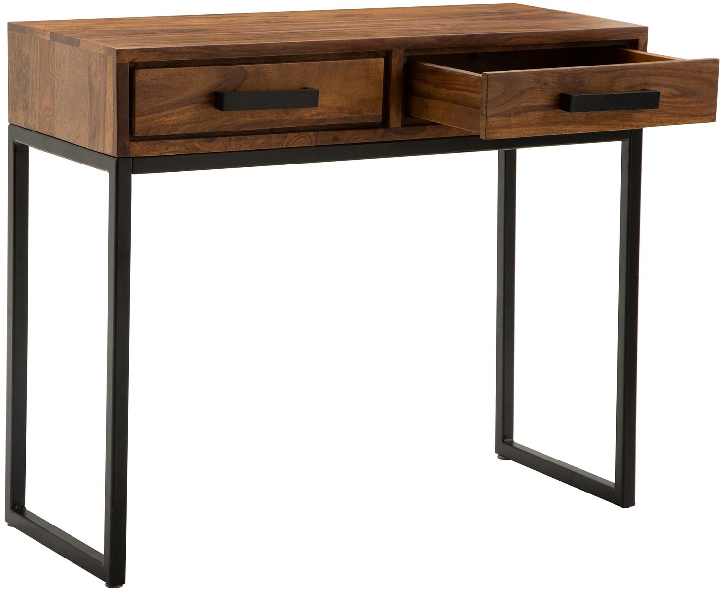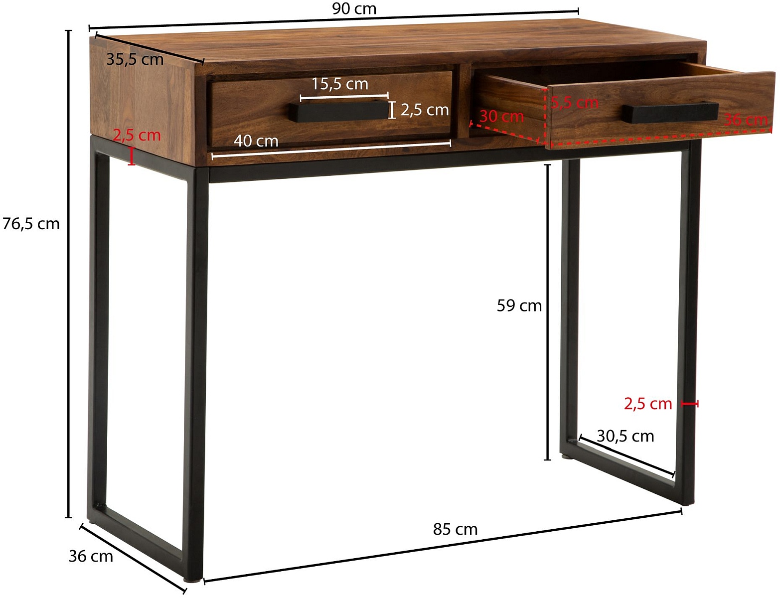 MATERIAL ✔ Die Tischplatte des Konsolentisches wurde aus massivem Sheesham Echtholz gefertigt. Die Beine und Griffe bestehen aus pulverbeschichtetem Edelstahl.