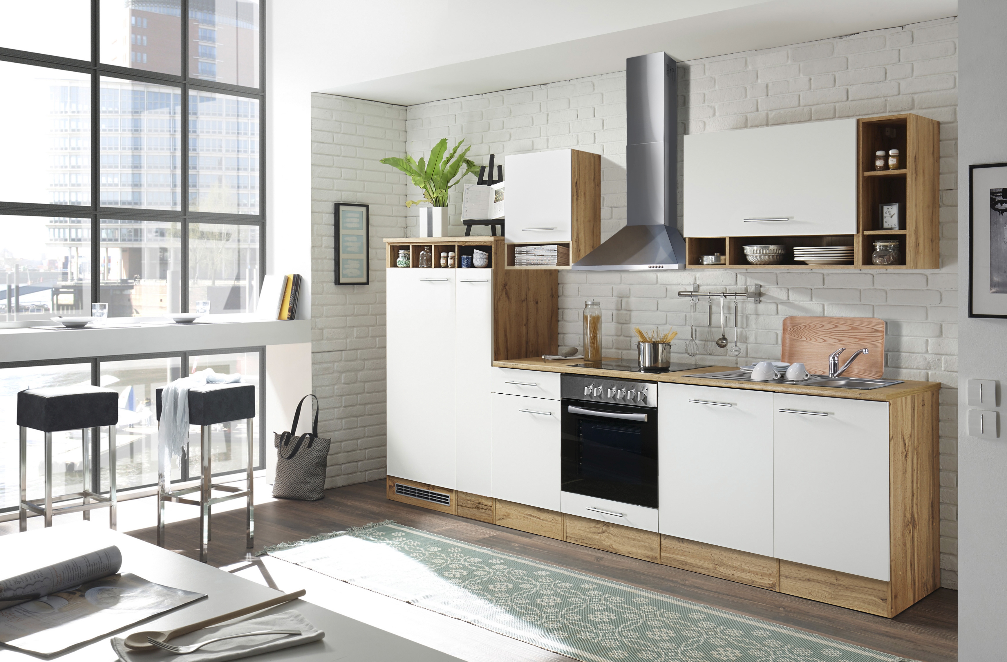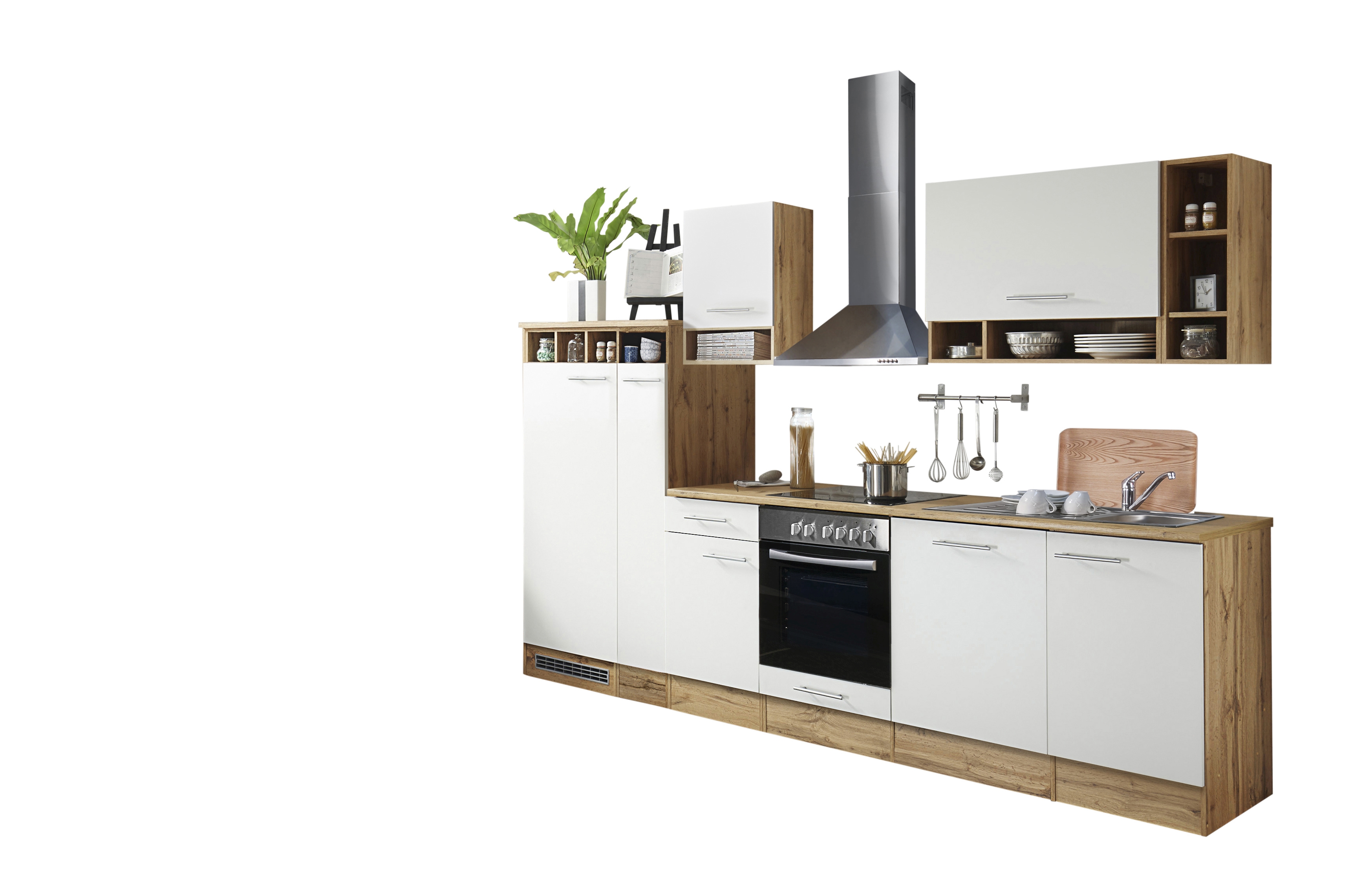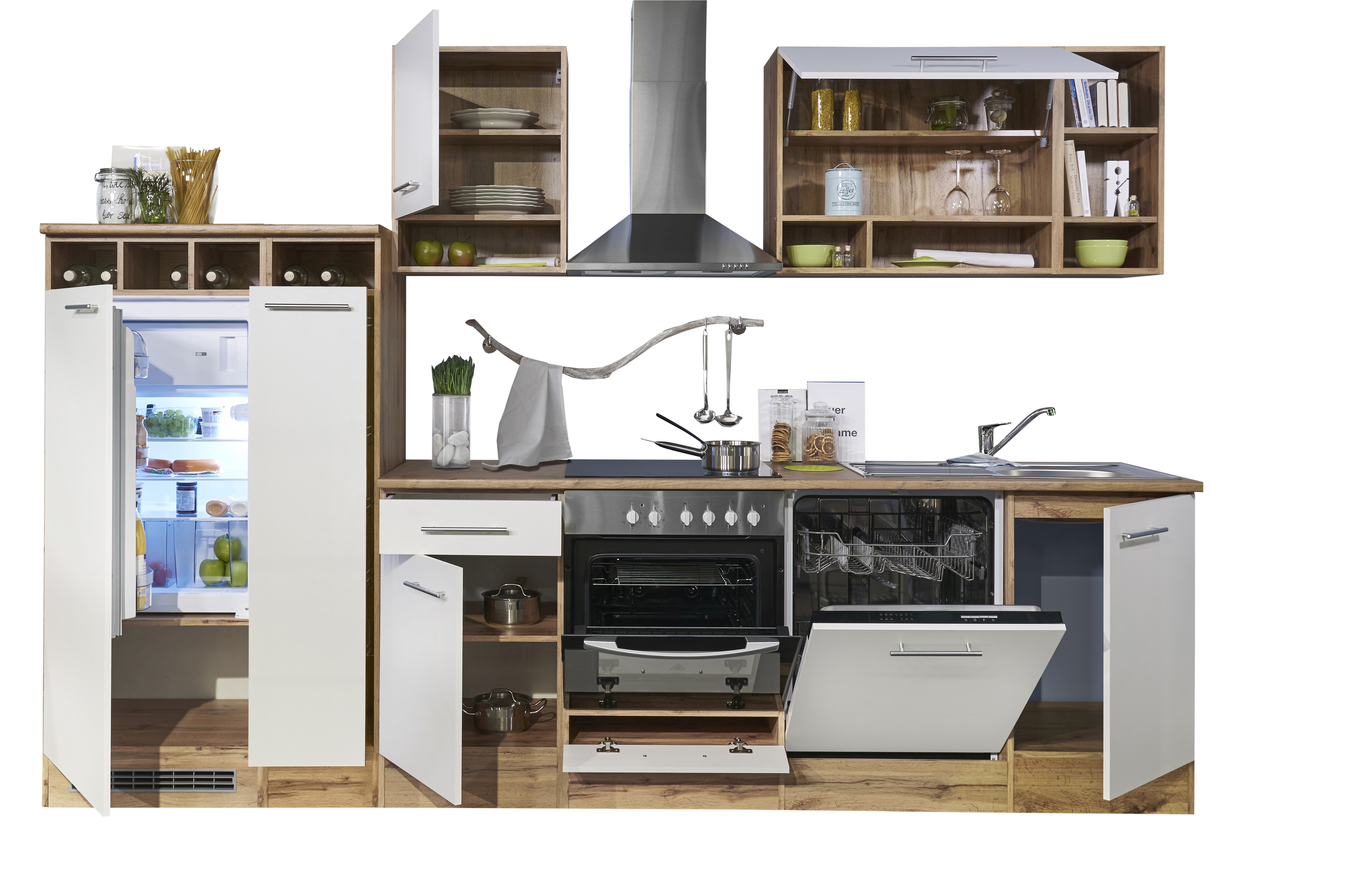 1 großer Hängeschrank mit 1 Klappe mit Liftfunktion, 2 offenen Fächern und 1 Einlegeboden
