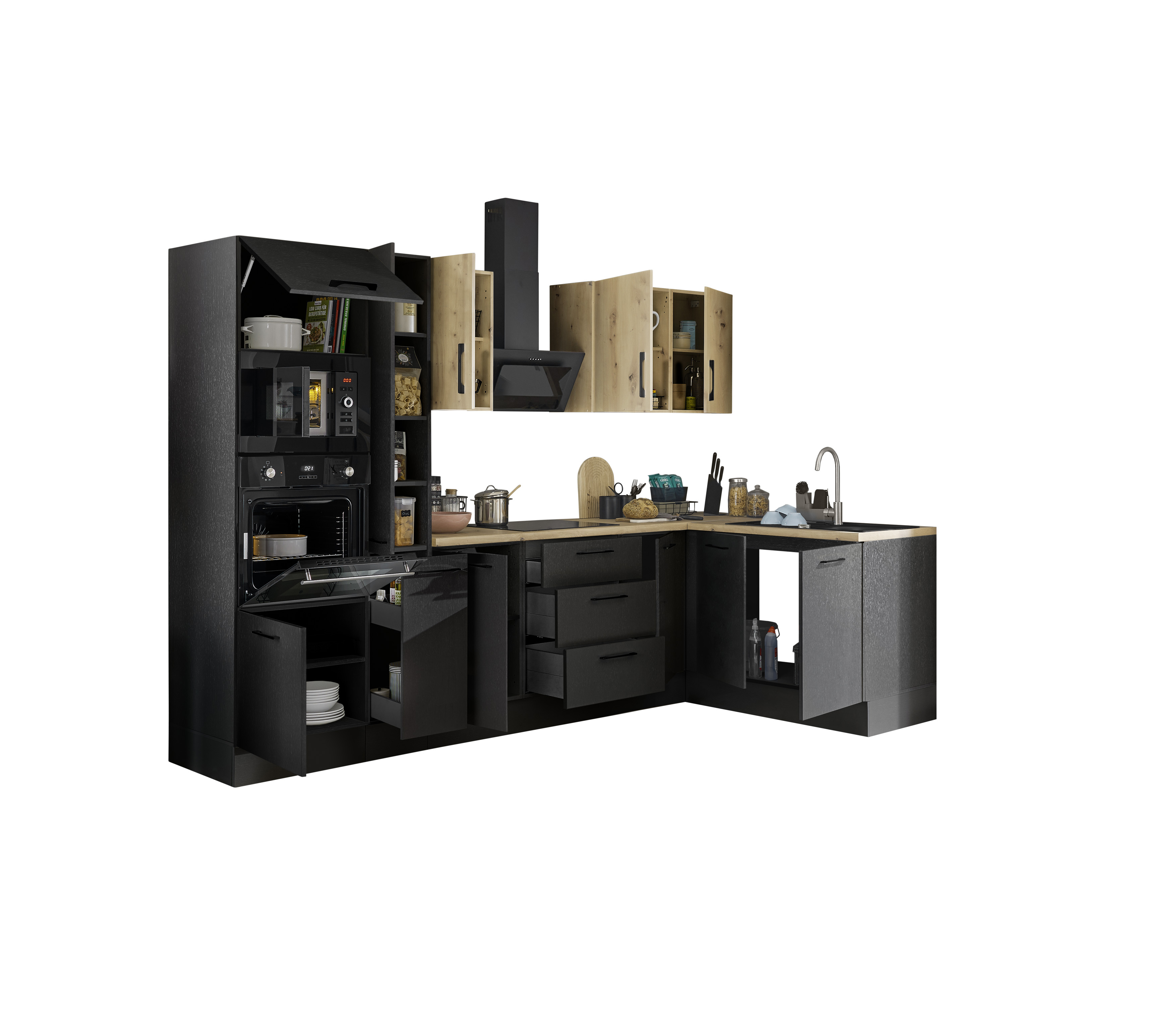 Front und Korpus: schwarz matt woodprint kombiniert mit Spanplatte Artisan Eiche Holznachbildung melaminbeschichtet