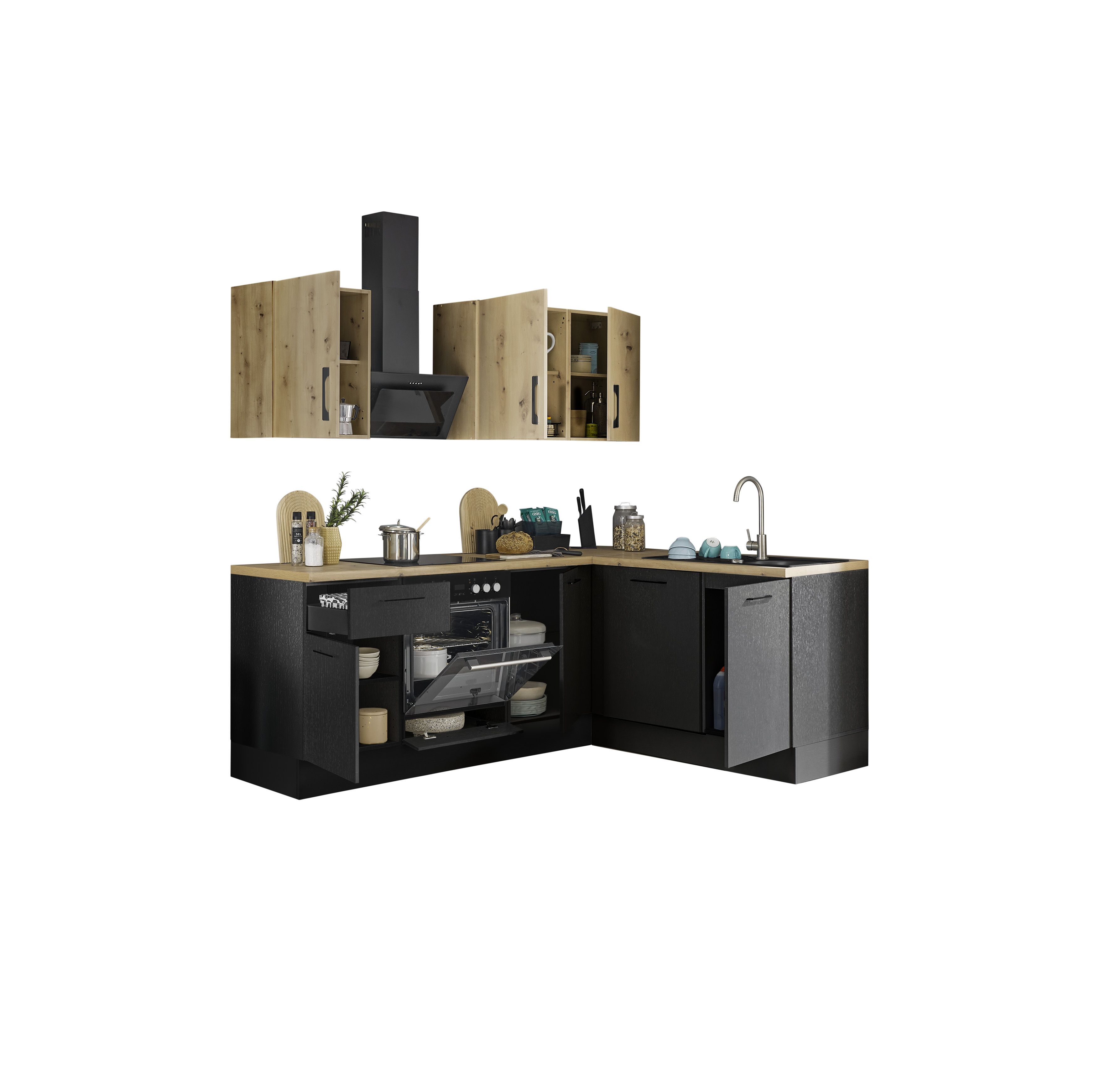 Front und Korpus: schwarz matt woodprint kombiniert mit Spanplatte Artisan Eiche Holznachbildung melaminbeschichtet