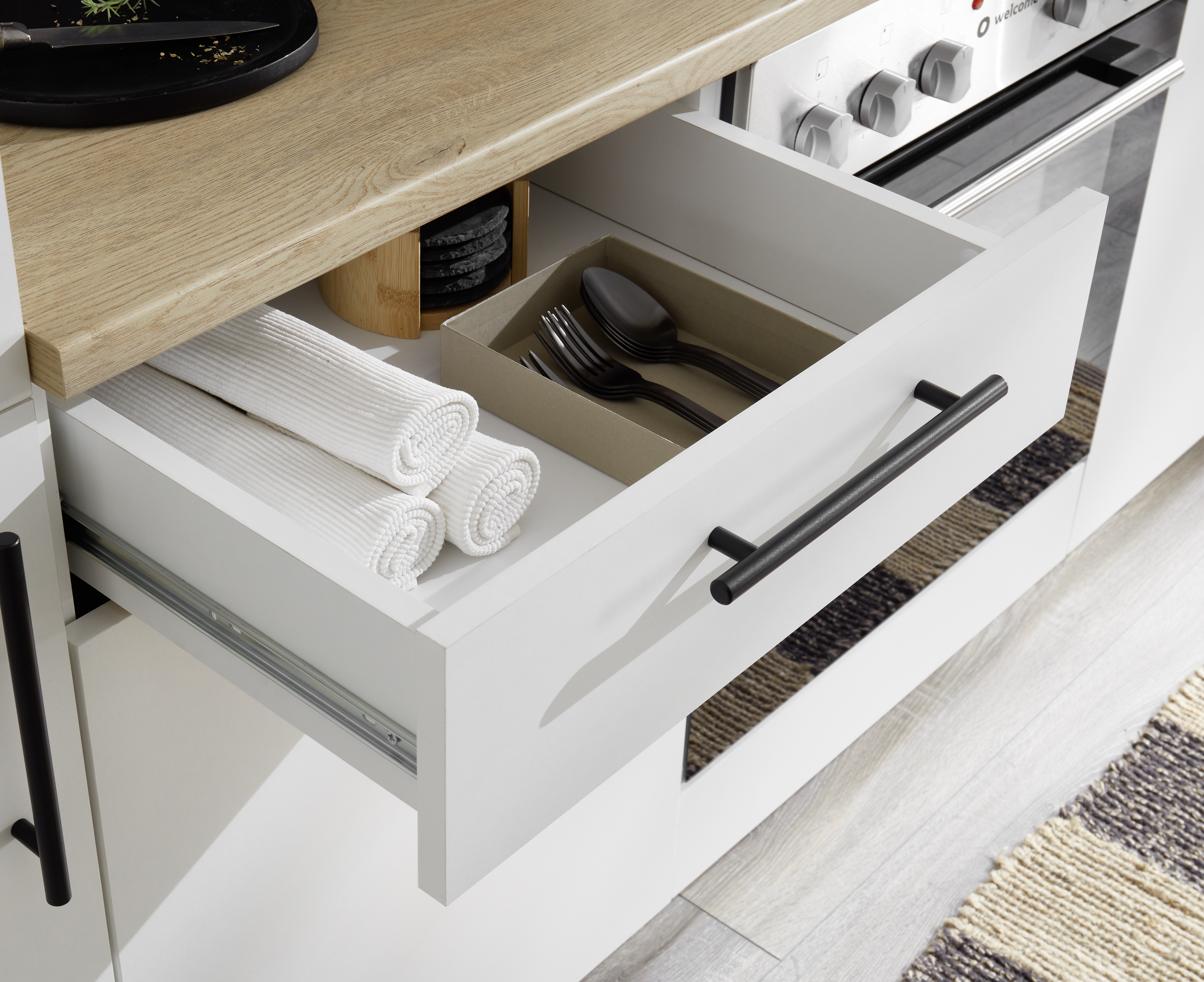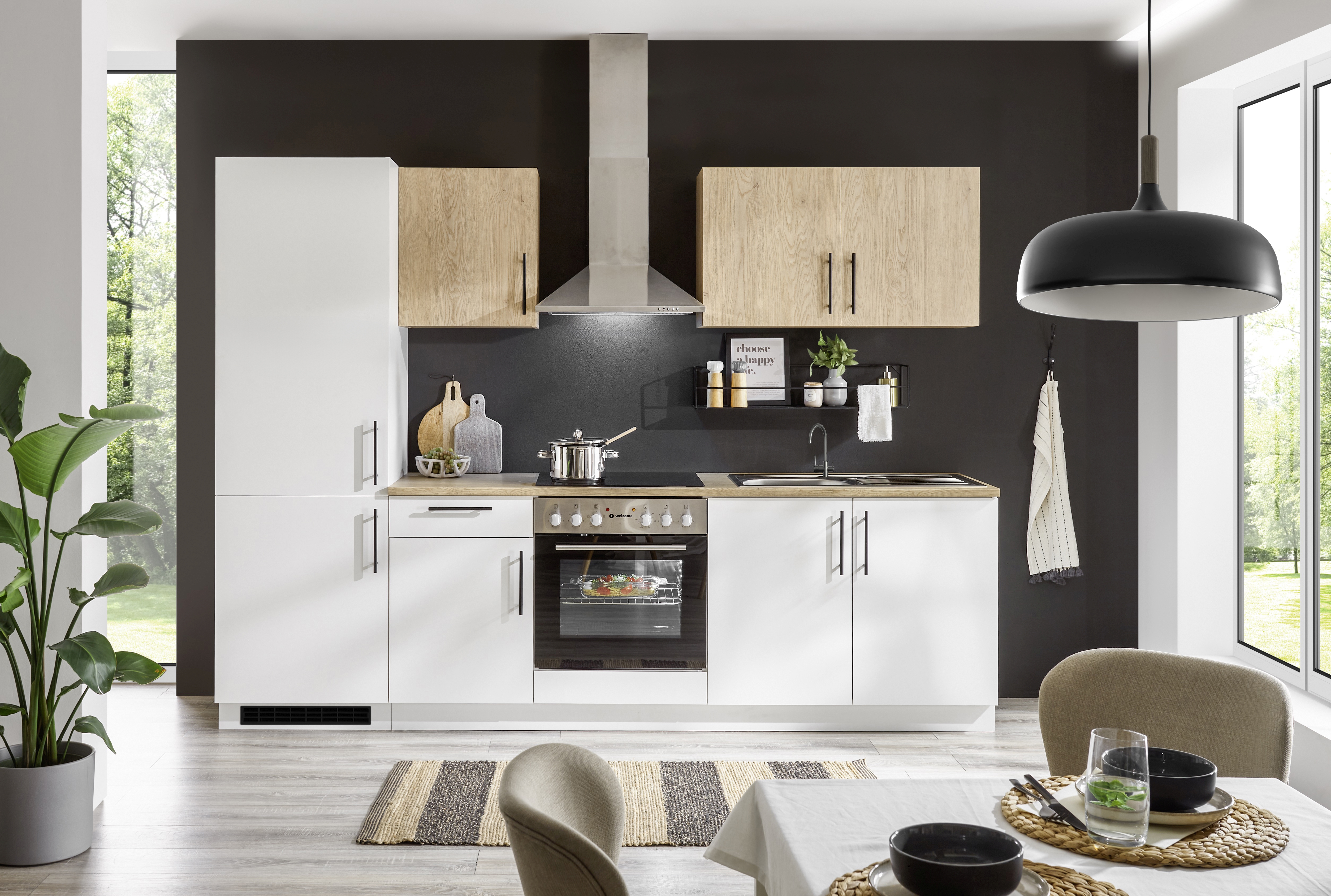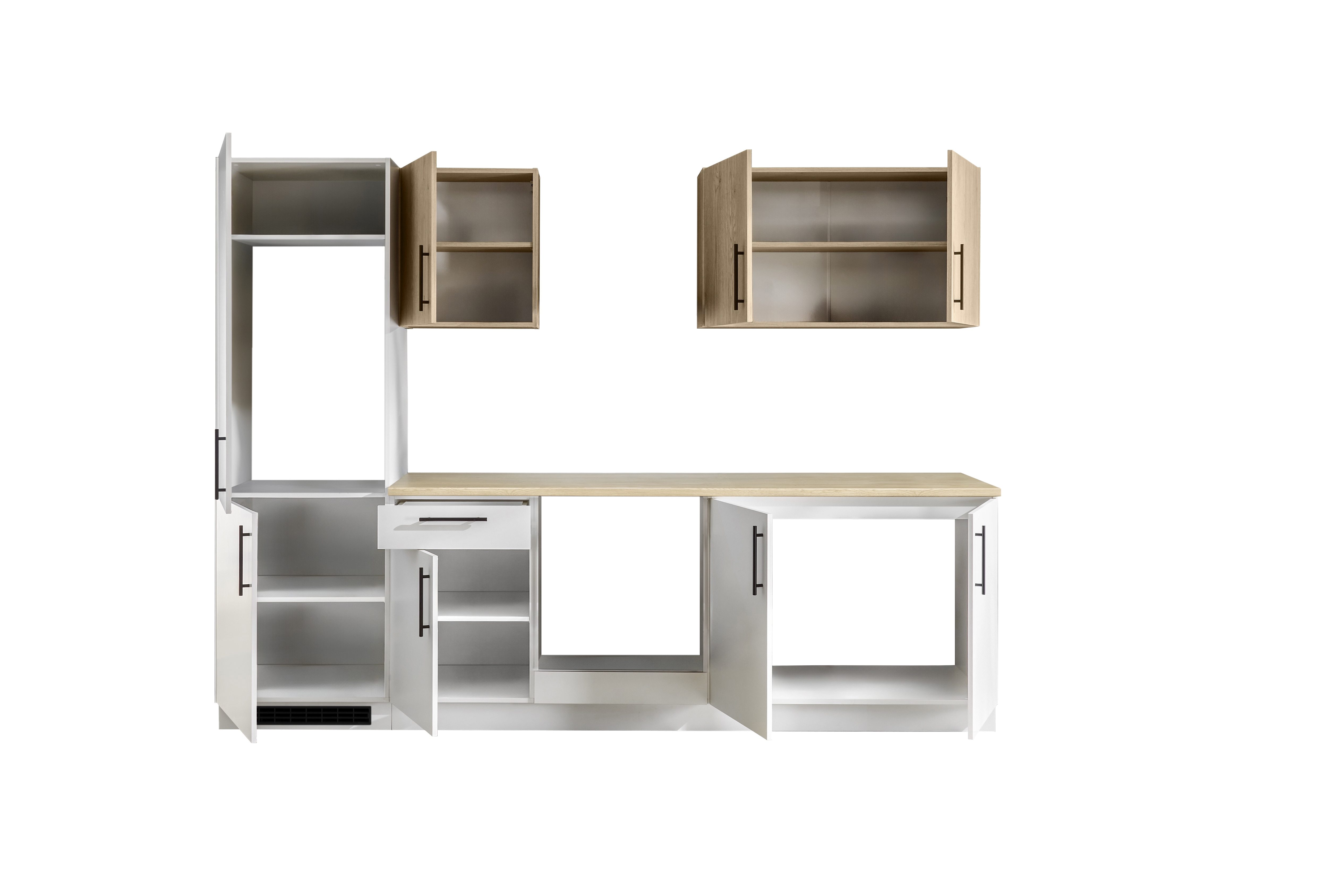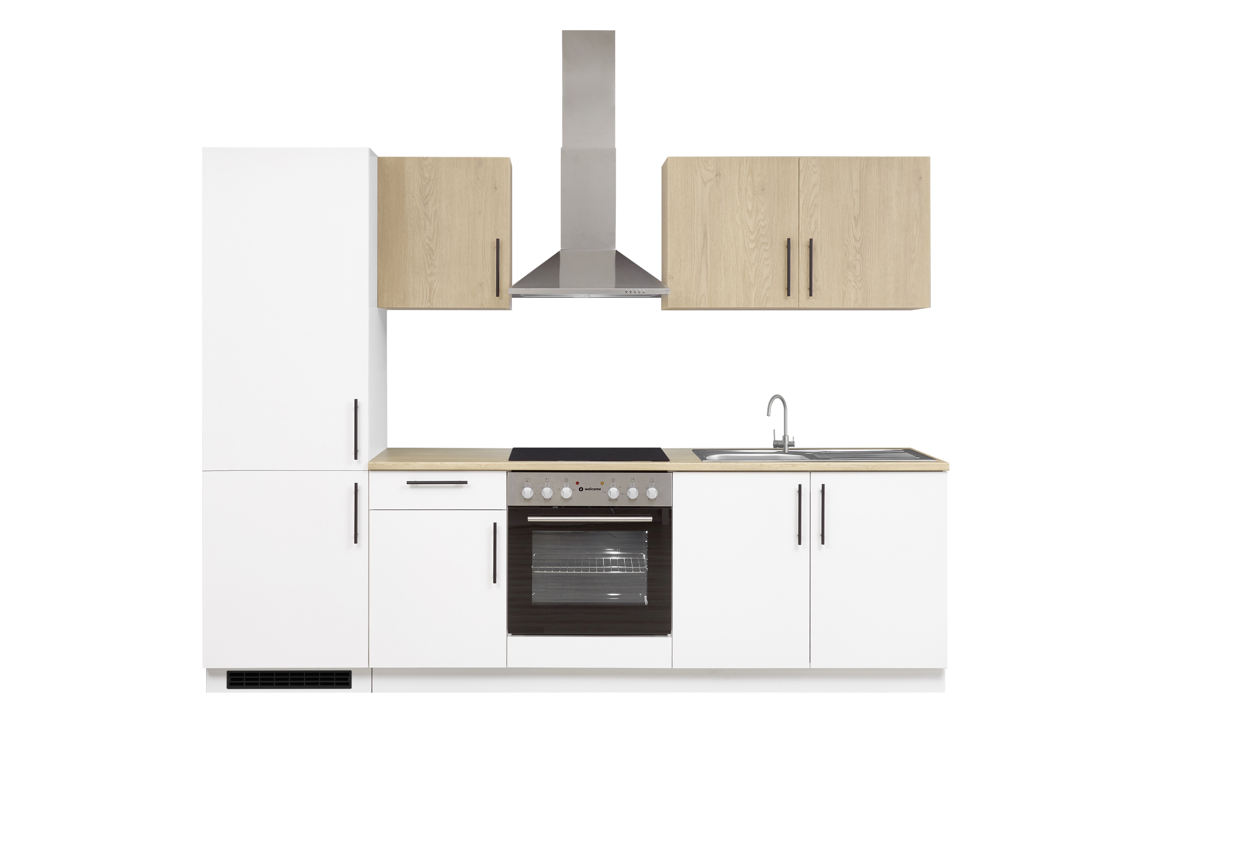 Dieser kompakte Küchenblock kombiniert praktische Ausstattung mit modernem Look. Die Fronten in Weiß treffen auf warme Cremona Eiche Holznachbildung und schaffen eine schlichte, wohnliche Optik. Die schwarzen Stangengriffe sorgen für einen dezenten Kontrast. Der Küchenblock bietet funktionale Stauraummöglichkeiten mit verschiedenen Unter- und Hängeschränken und ist ideal für kleinere Räume oder als Zweitküche geeignet. Durch die robuste Melaminbeschichtung ist die Oberfläche pflegeleicht und widerstandsfähig. Geliefert wird die Küche als kompletter Block – ohne Dekoration und Elektrogeräte. Eine preisbewusste Lösung für alle, die auf Funktionalität und ein modernes Erscheinungsbild setzen.