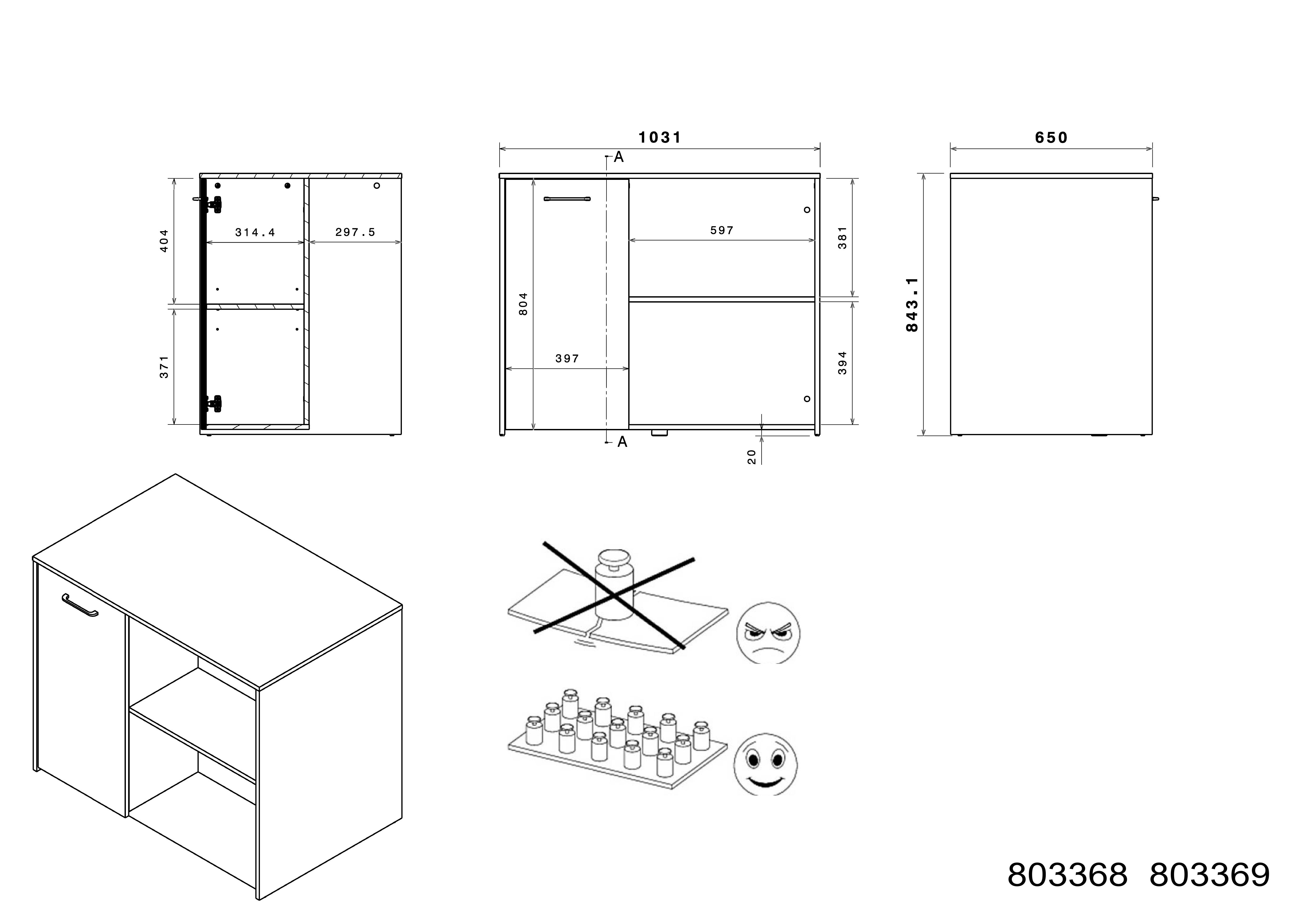 unten: 1 Schubkasten, darunter 2 Türen, dahinter 2 Fächer