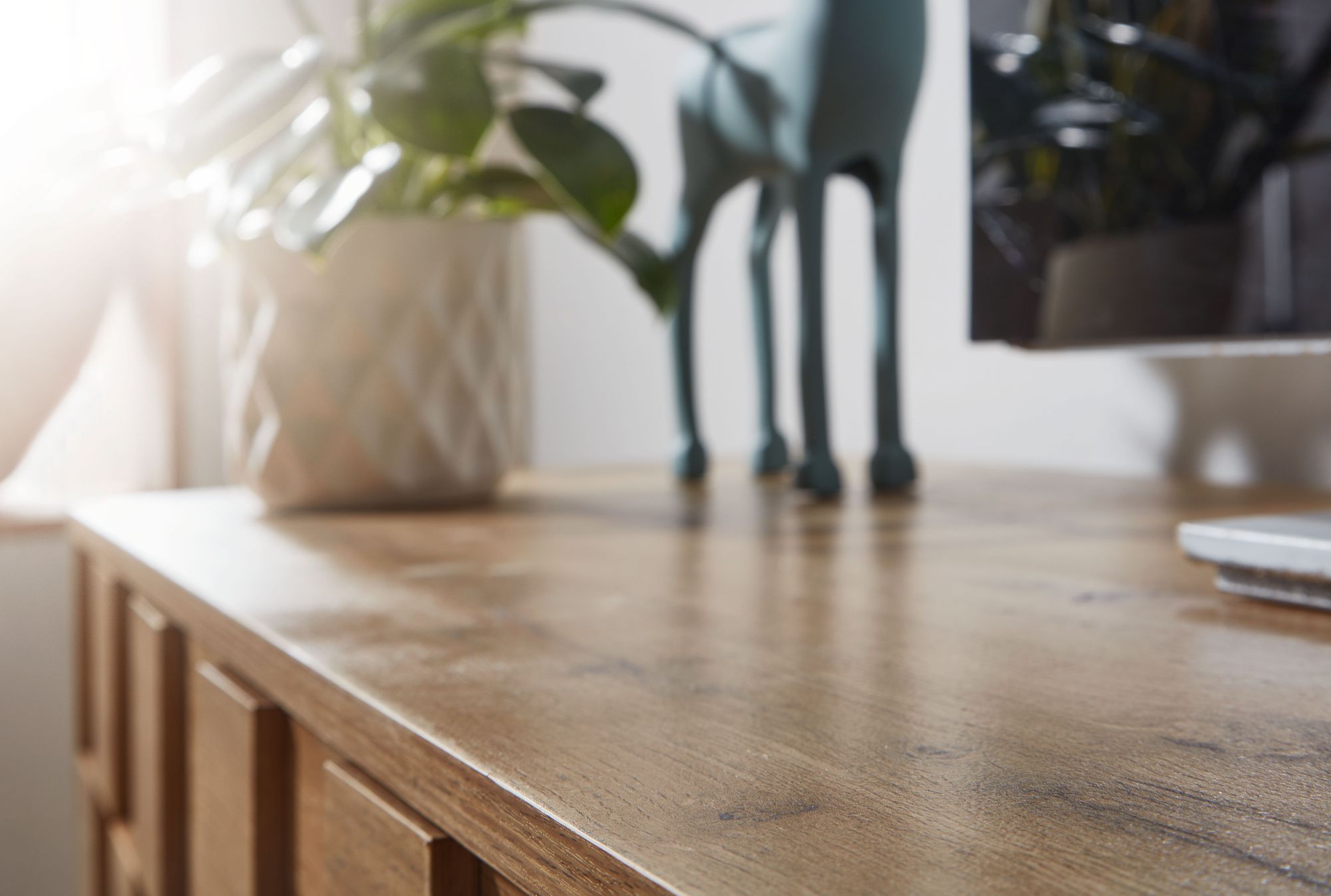 MATERIAL ✔ Der Korpus besteht aus folierter Spanplatte in Eichenoptik. Die Beine sind aus massivem Eichenholz.