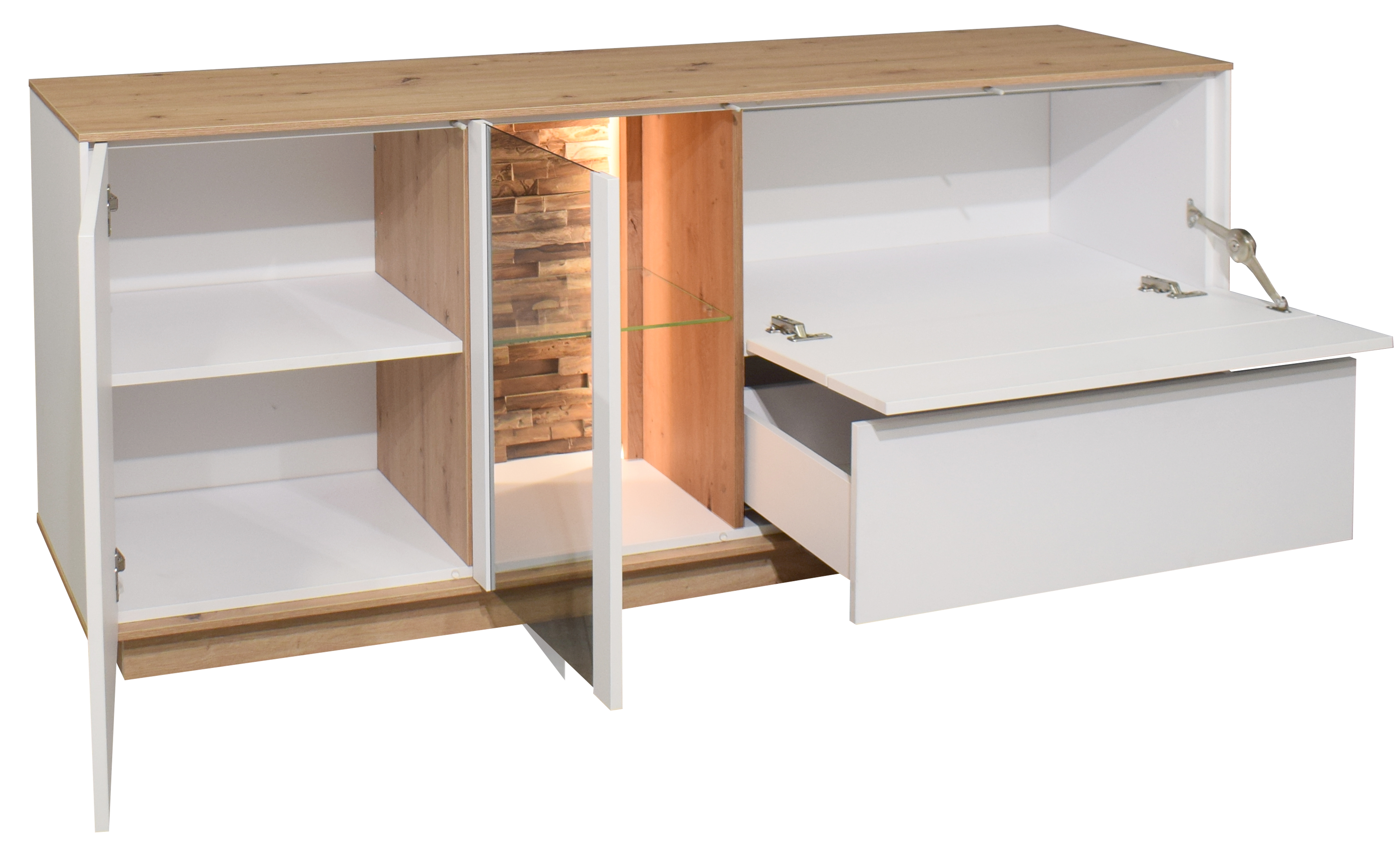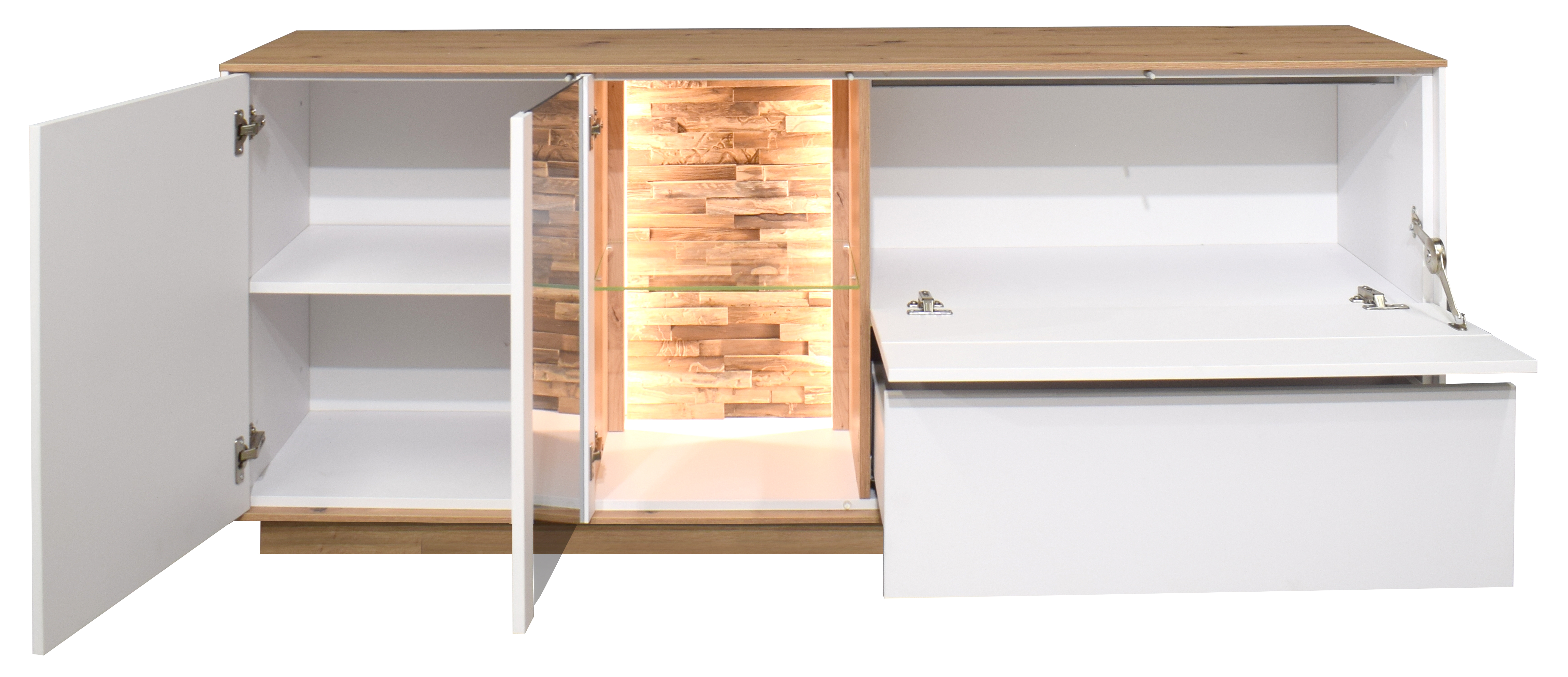 | Ausstattung Kommoden Phono Büro Regal: | Klappe(n), Schublade(n), Türe(n), inkl. Beleuchtung | ||