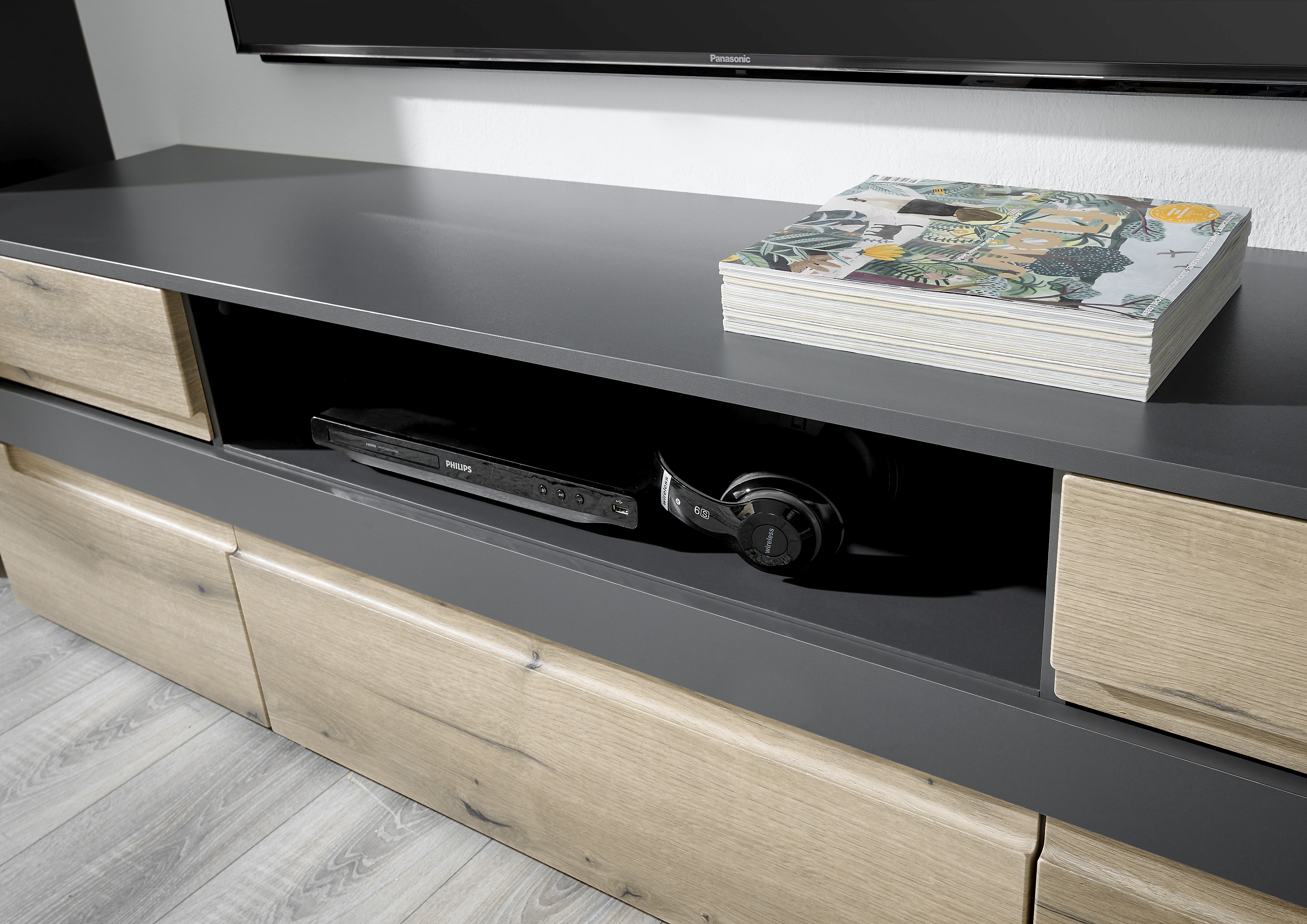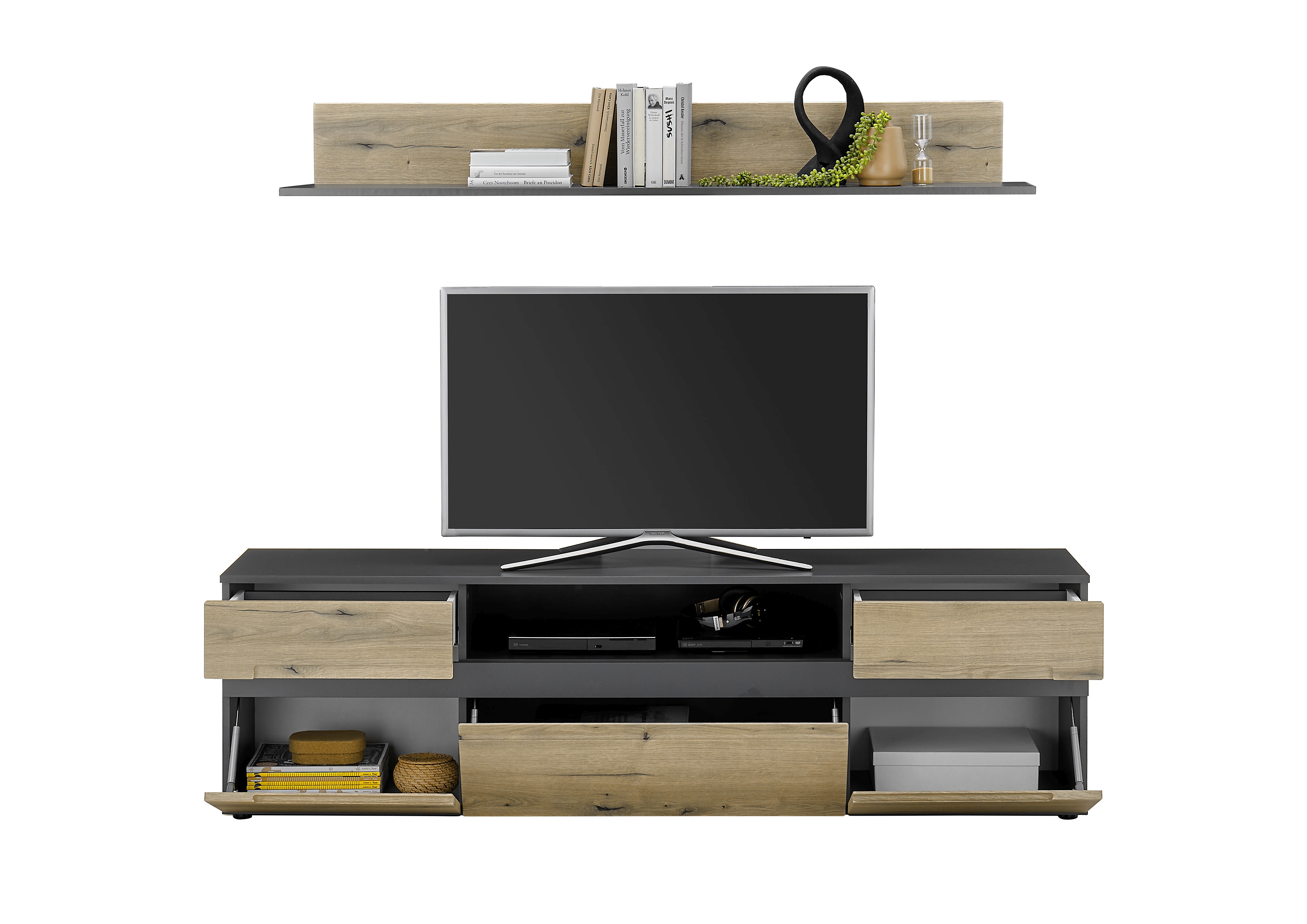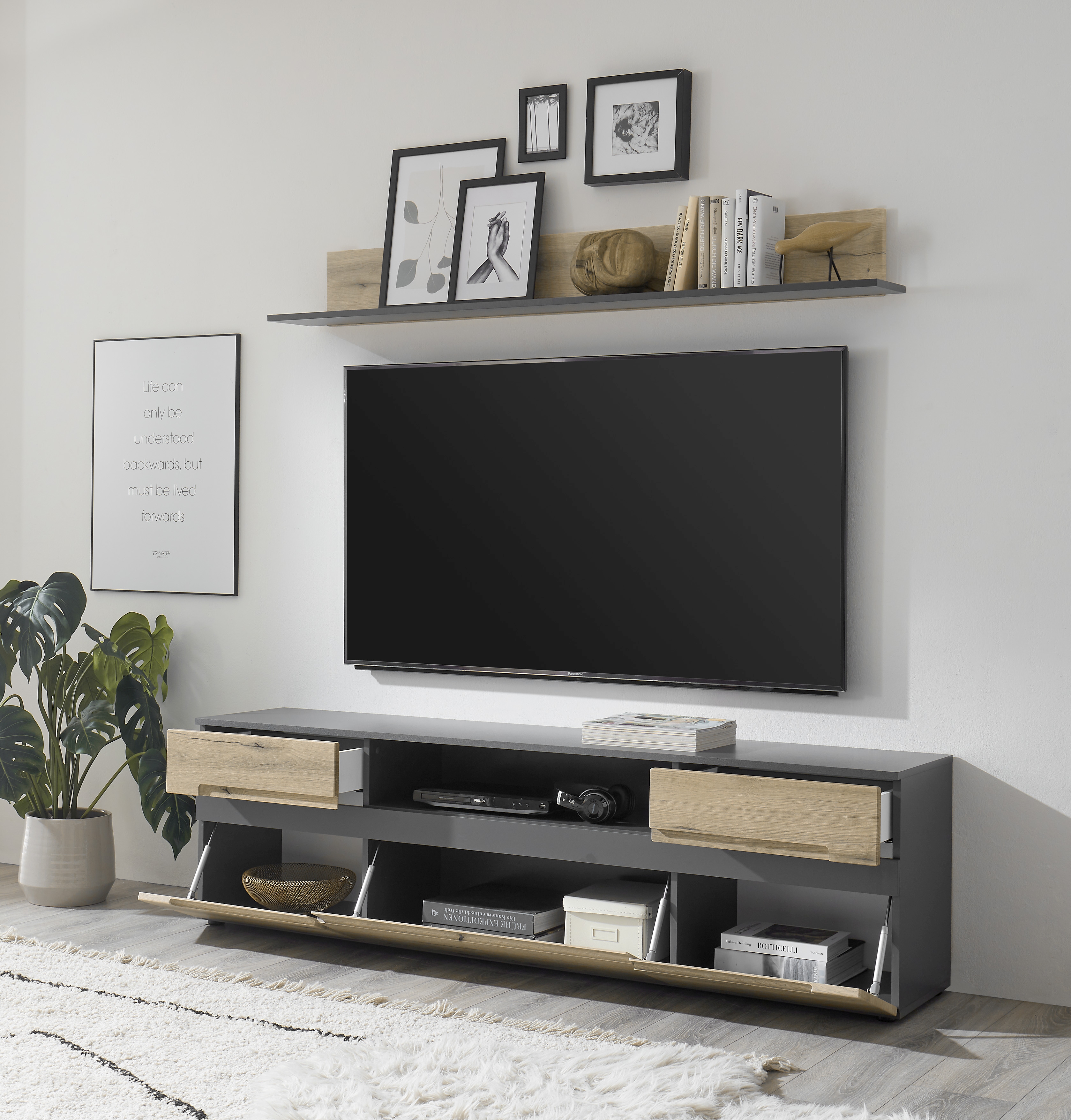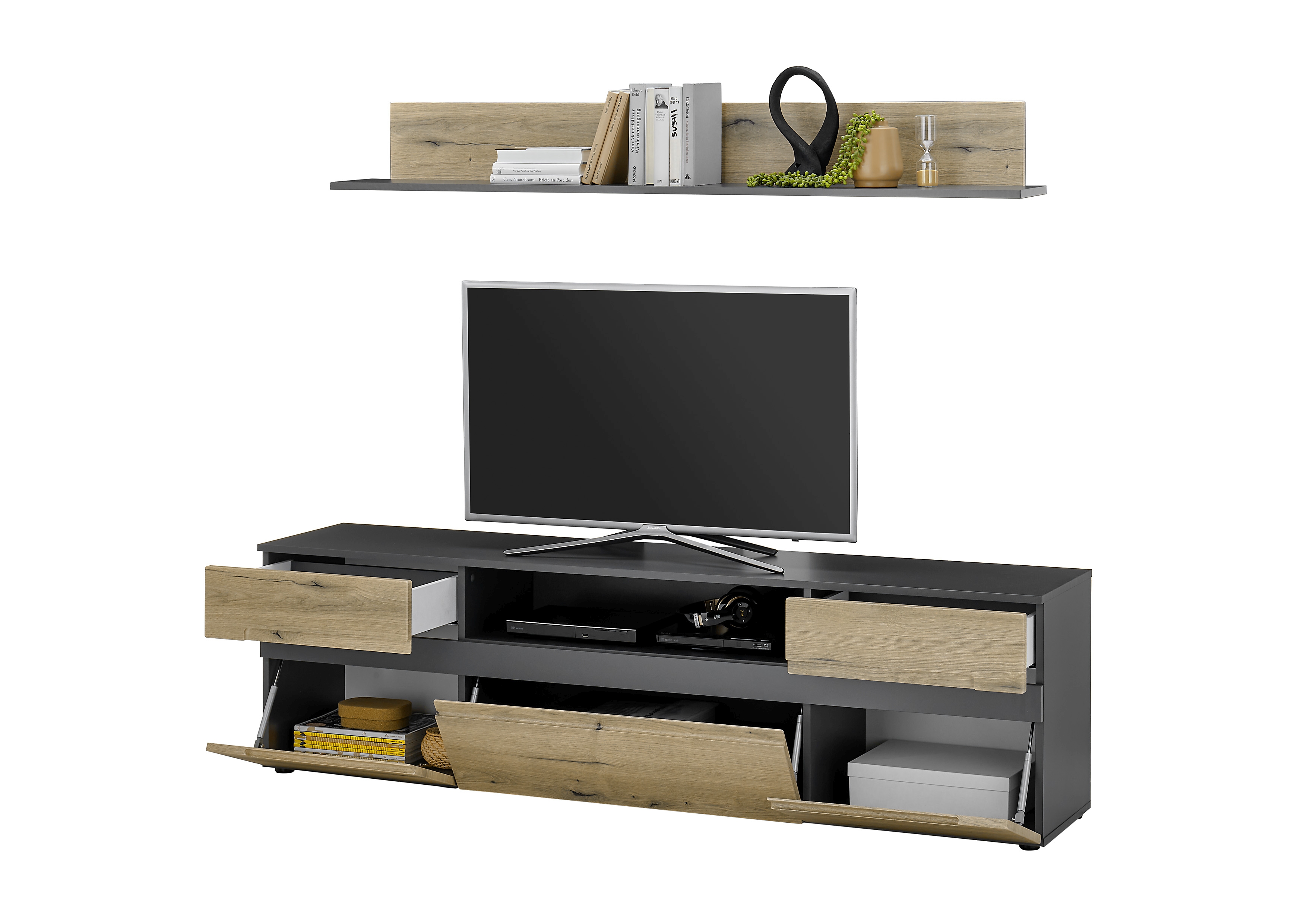 1 Lowboard mit 2 Türen, 1 Klappe, 1 offenem Fach und 2 Schubkästen mit Unterflurauszügen