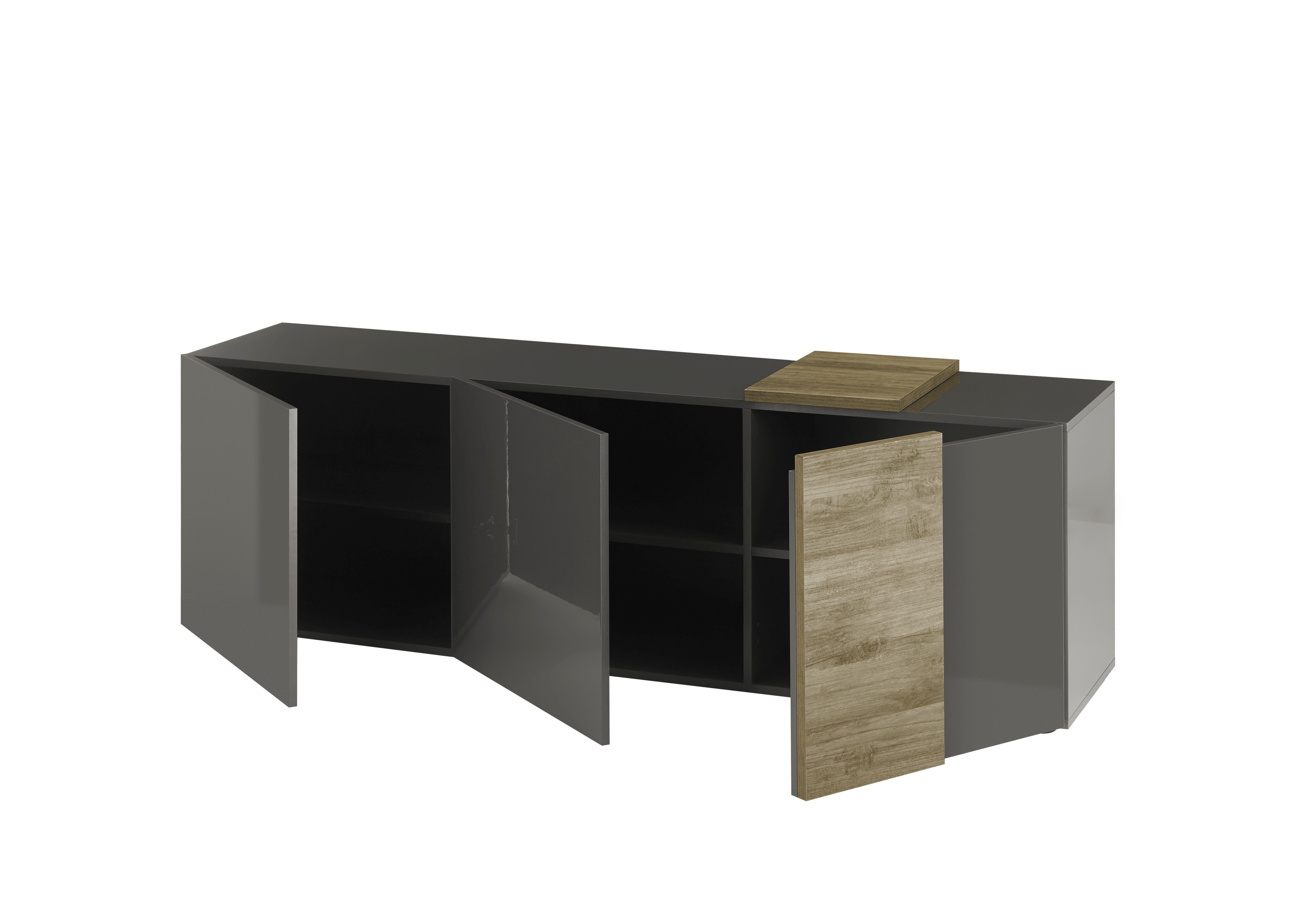 Front und Korpus: Hochglanz Dunkelgrau mit Absetzungen in Mercure Holznachbildung