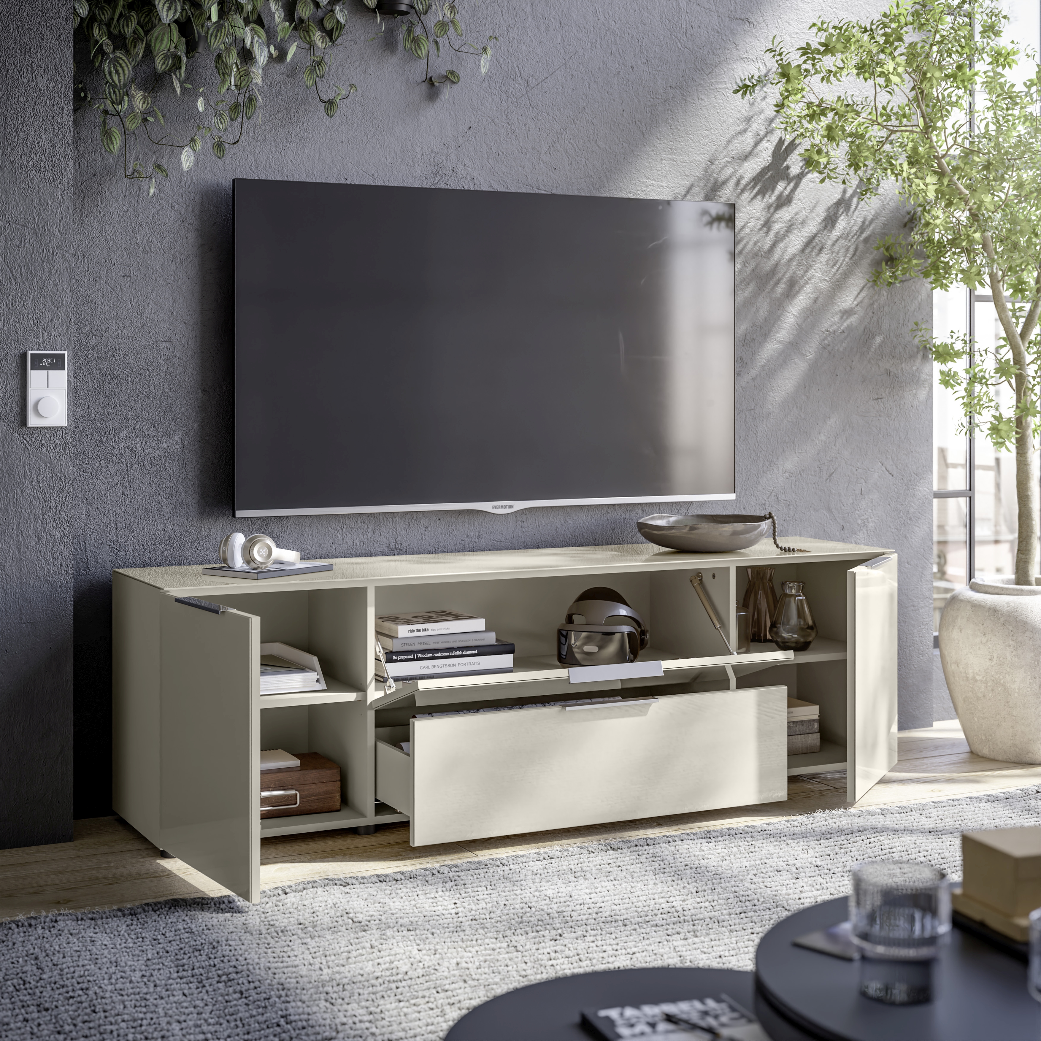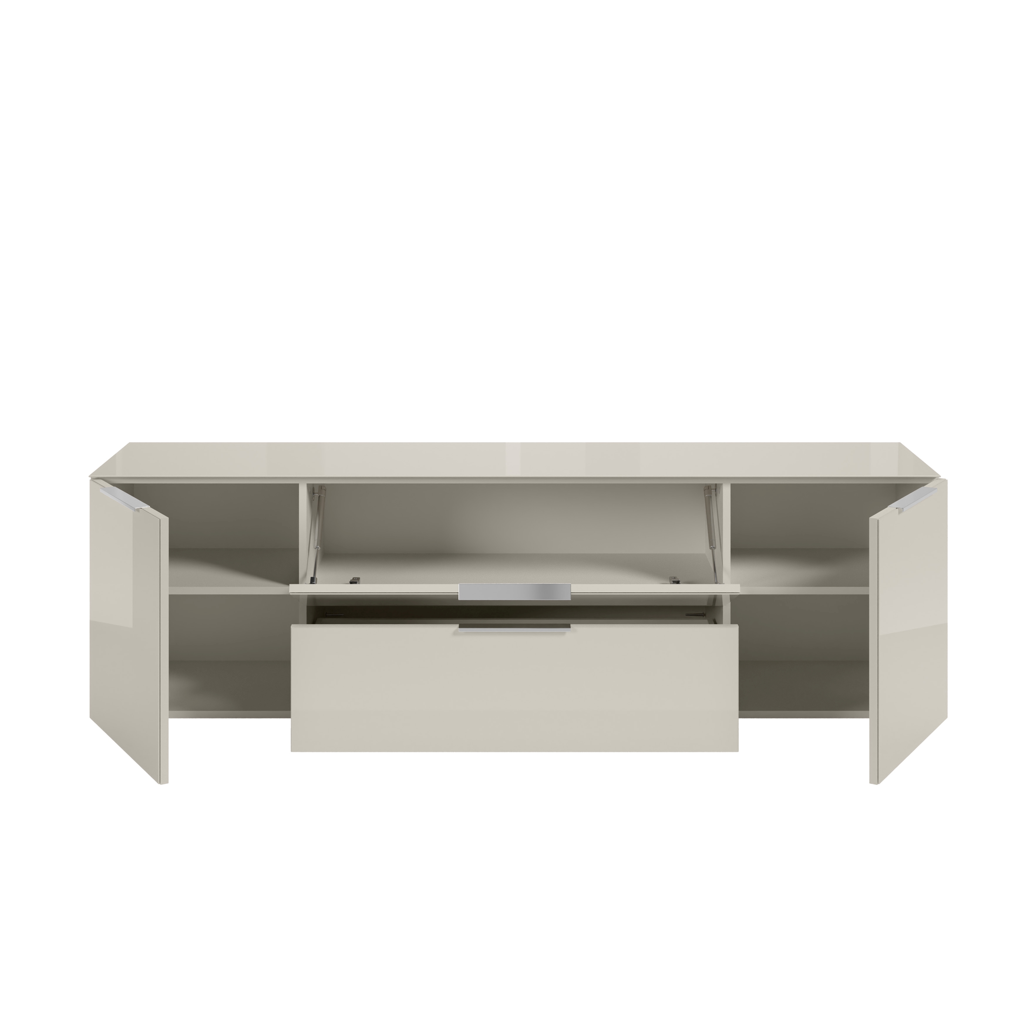 Front: Kaschmir, Spanplatte Melaminbeschichtung, Glasfronten glatt