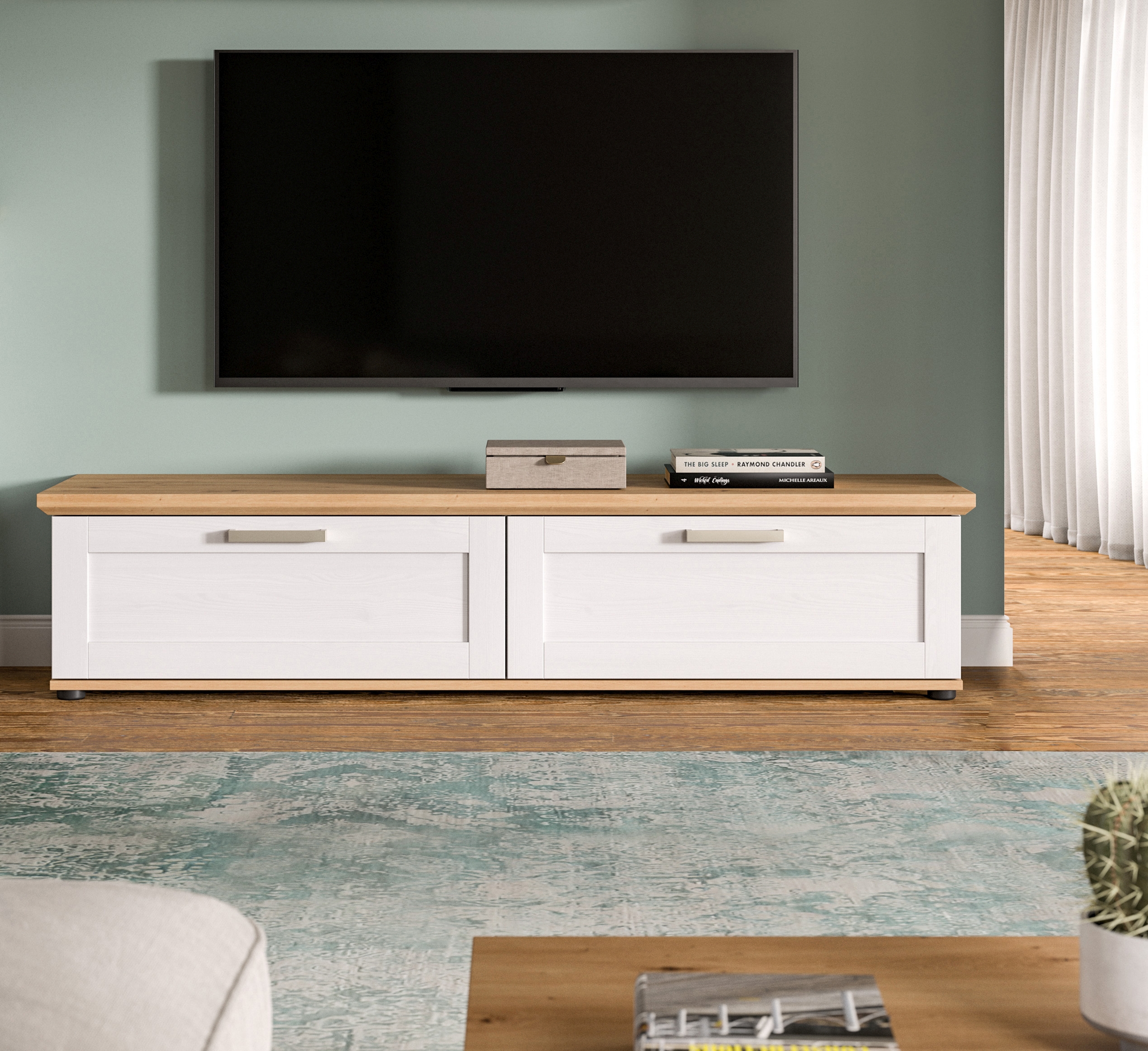 Setzen Sie stilvolle Akzente in Ihrem Wohnraum mit unserem modernen Lowboard im Landhaus-Look! Mit zwei Klappen und zwei Fächern bietet es ausreichend Stauraum und verleiht Ihrem Raum gleichzeitig eine elegante Atmosphäre. Der farblich abgesetzte Ober- und Unterboden sorgt für einen zusätzlichen Blickfang.