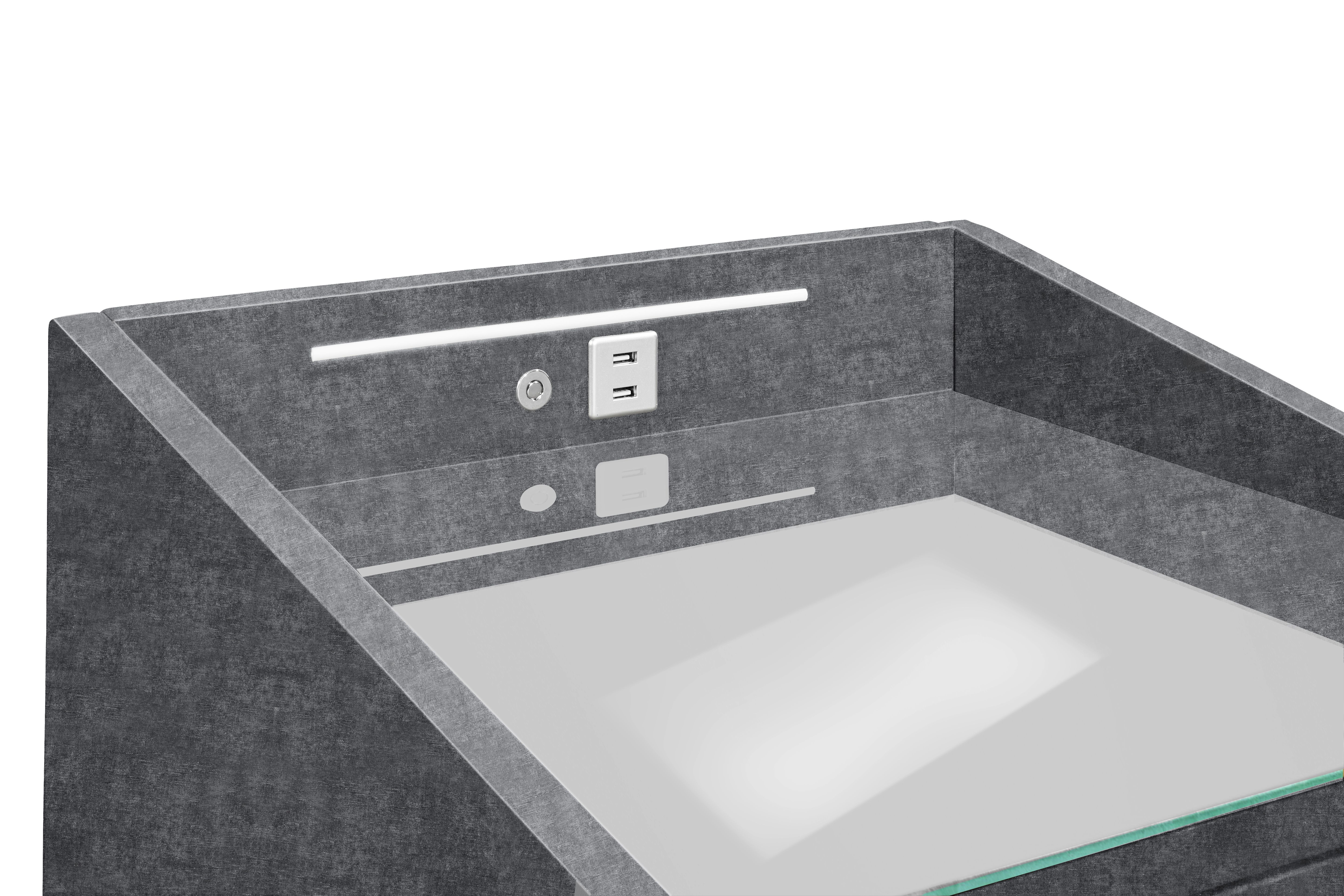| Ausstattung Kommoden Phono Büro Regal: | Glasplatte, Schublade(n), inkl. Beleuchtung, inkl. USB-Anschluss | ||
