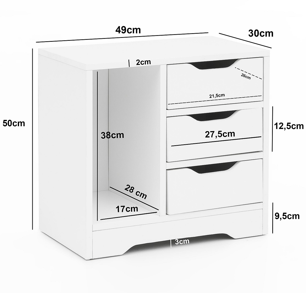 - Viel Stauraum in drei Schubladen und einem Regalfach