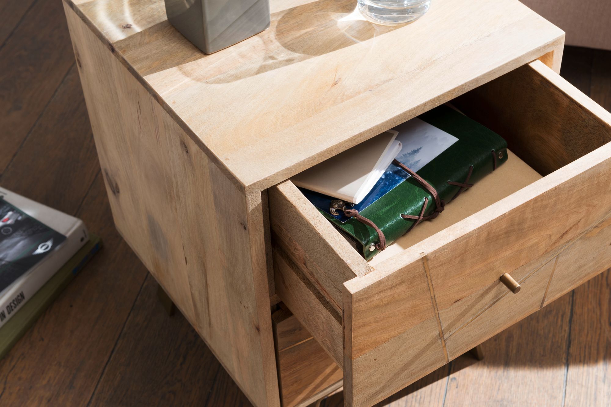 - RUSTIKALE NOTE ✔ Bringen Sie ein Stück Natur in Ihr Schlafzimmer! Die im rustikalen Landhausstil gehaltene Nachtkonsole aus Mangoholz versprüht einen ganz besonderen Charme in Ihrem Zuhause. Feine Metallstreifen zieren die beiden Schubladenfronten und harmonieren mit der natürlichen Maserung des Holzes. Getragen wird der Nachttisch von vier widerstandsfähigen Beinen aus Eisen.