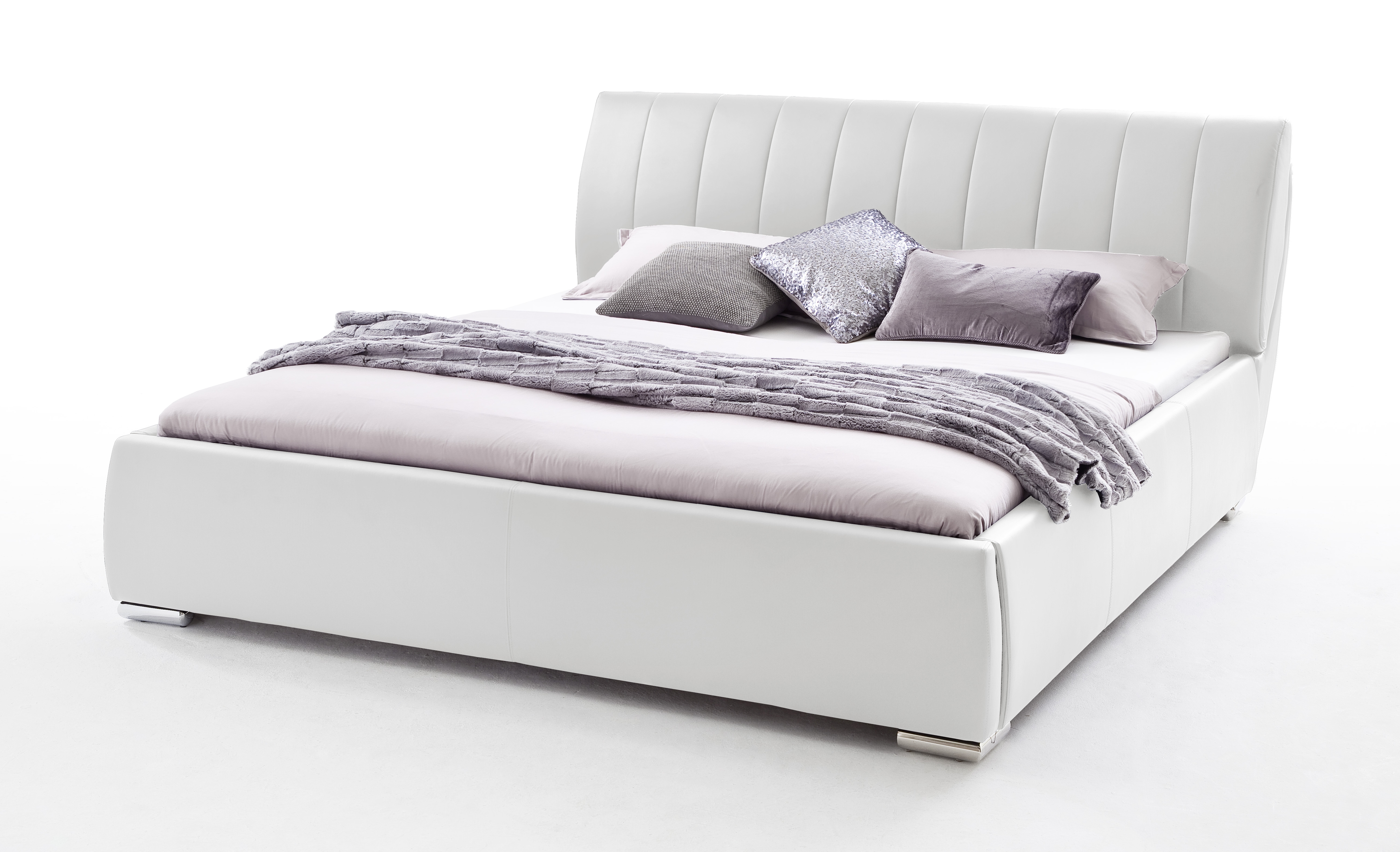 Polsterbett in der Farbe weiß in einem Kunstlederbezug: Vorderseite 100% Polyurethan, Rückseite: 50% Baumwolle, 50% Polyester
