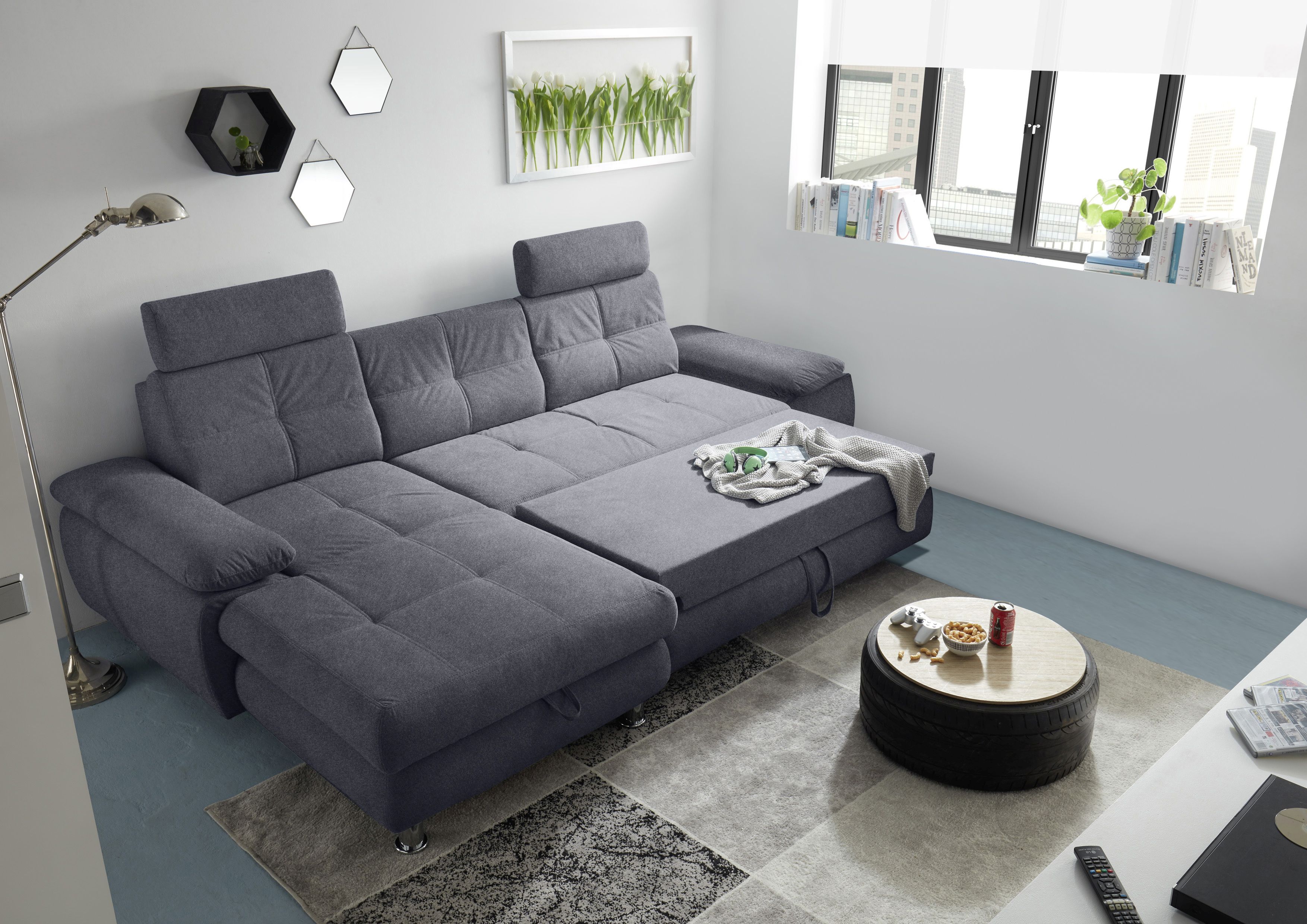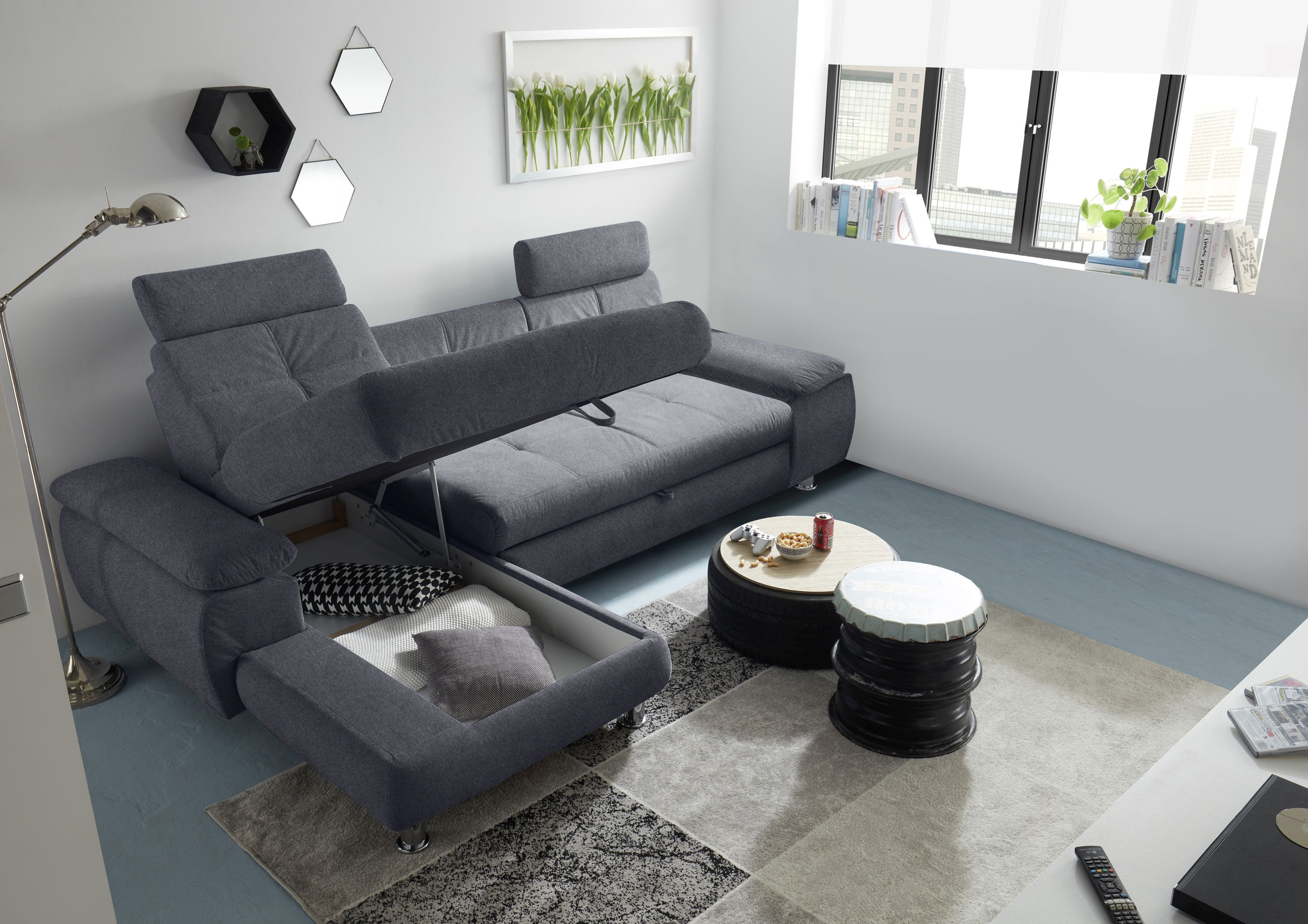 | Ausstattung Polster: | Kopfstützen, Ottomane links, Rücken echt, inkl. Bettkasten | ||