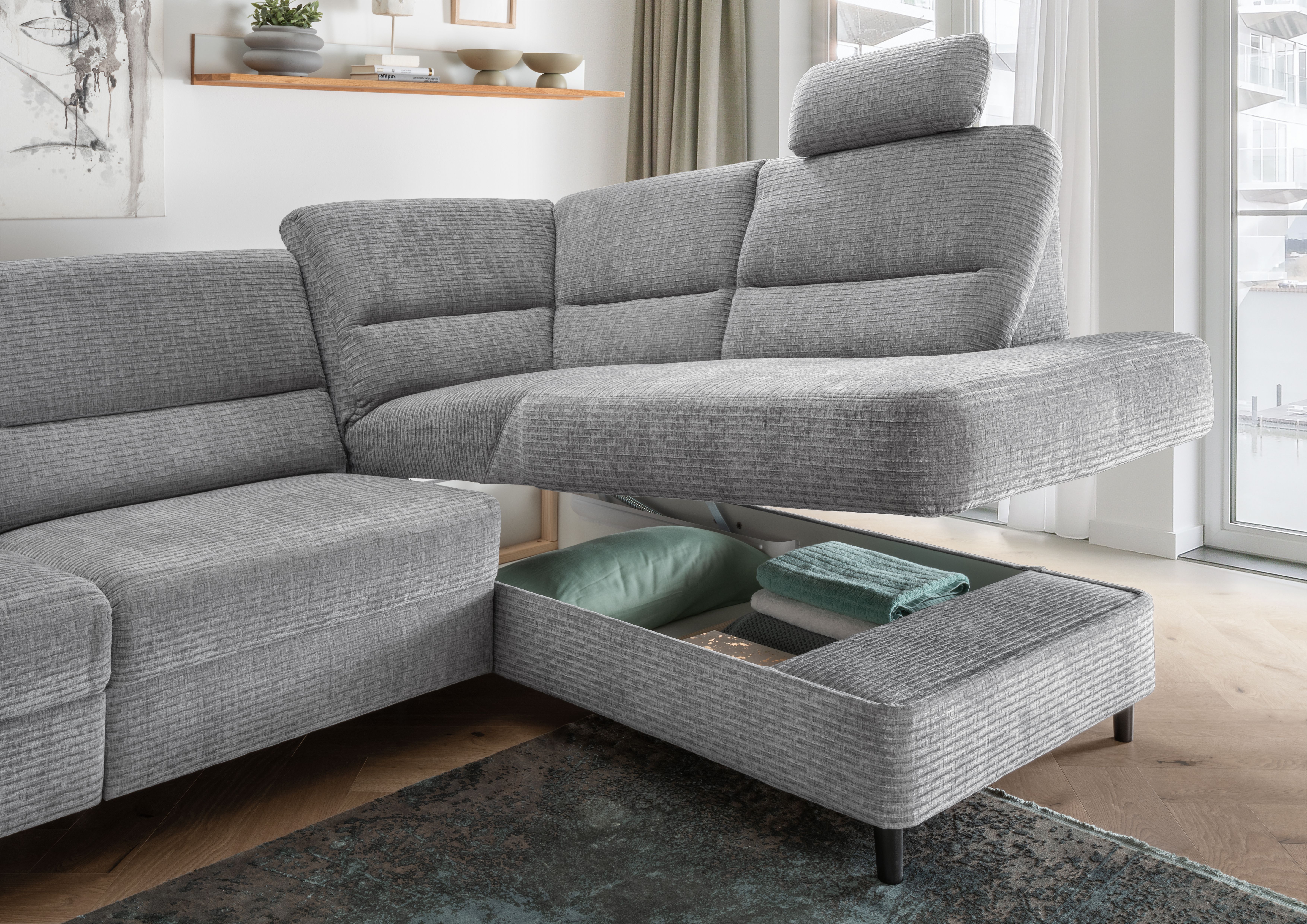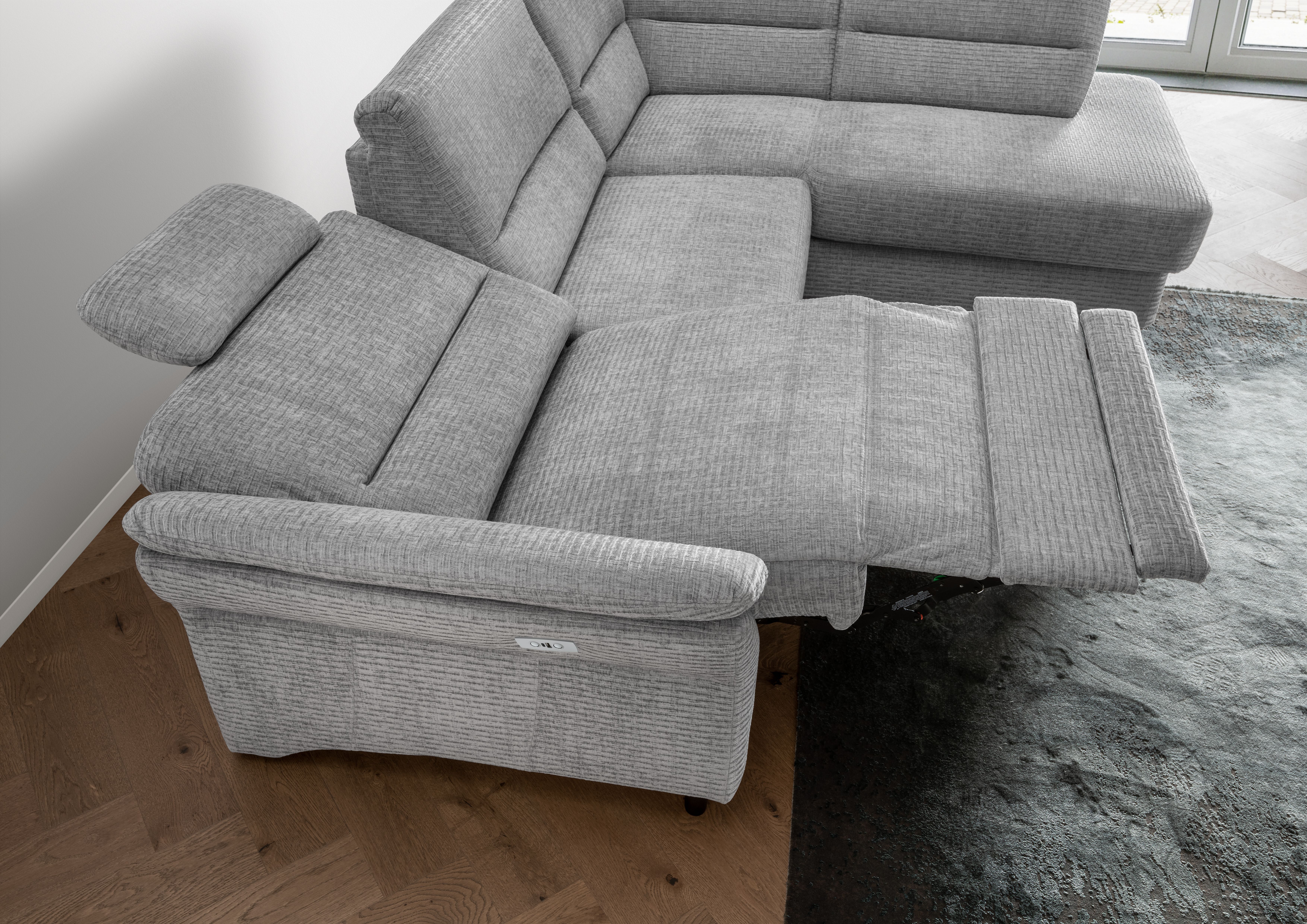 | Ausstattung Polster: | Kopfstützen, Ottomane rechts, Rücken echt, Sitzvorzug motorisch, USB Anschluss, inkl. Bettkasten | ||