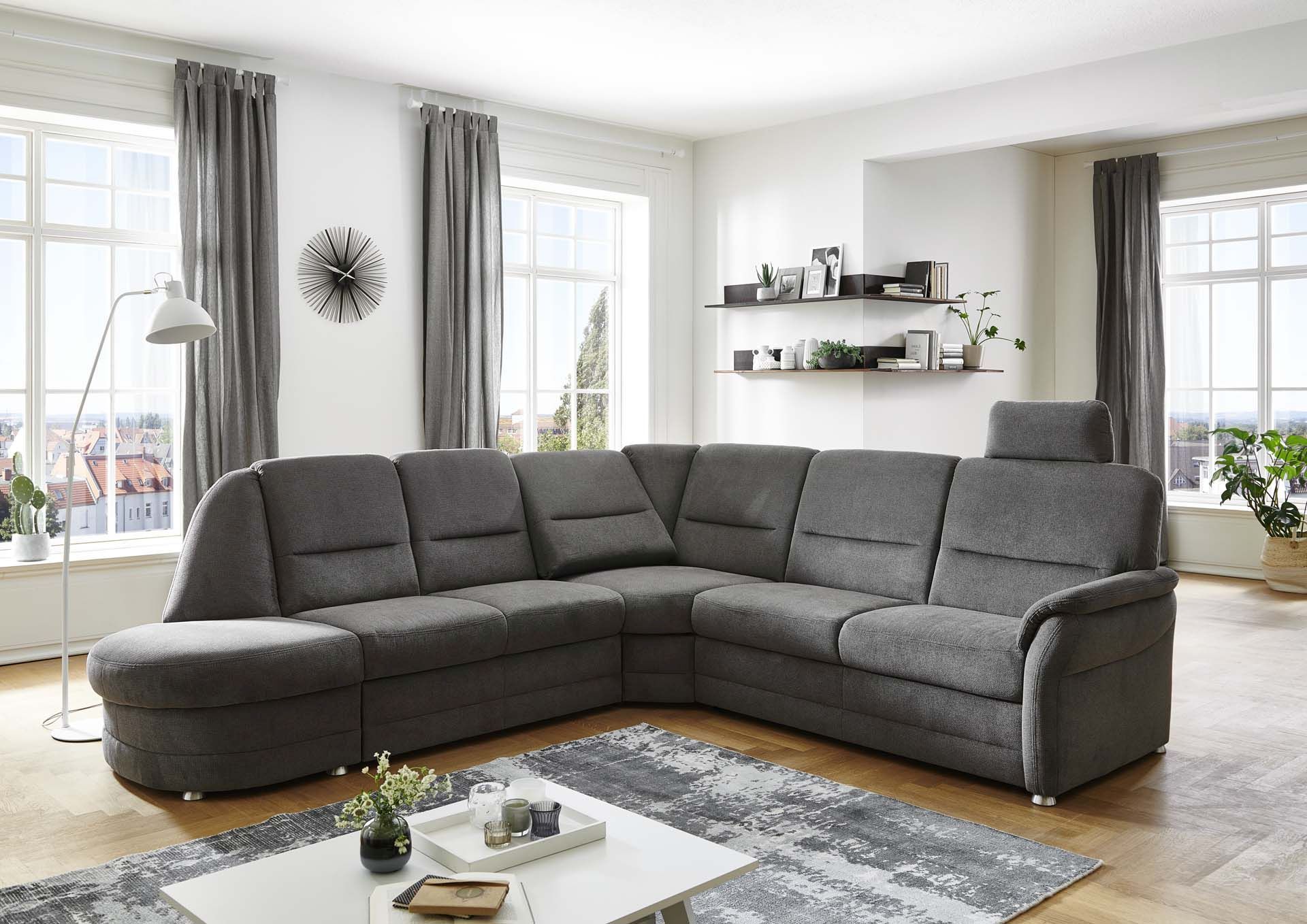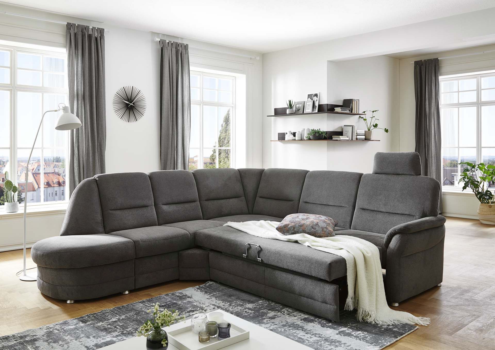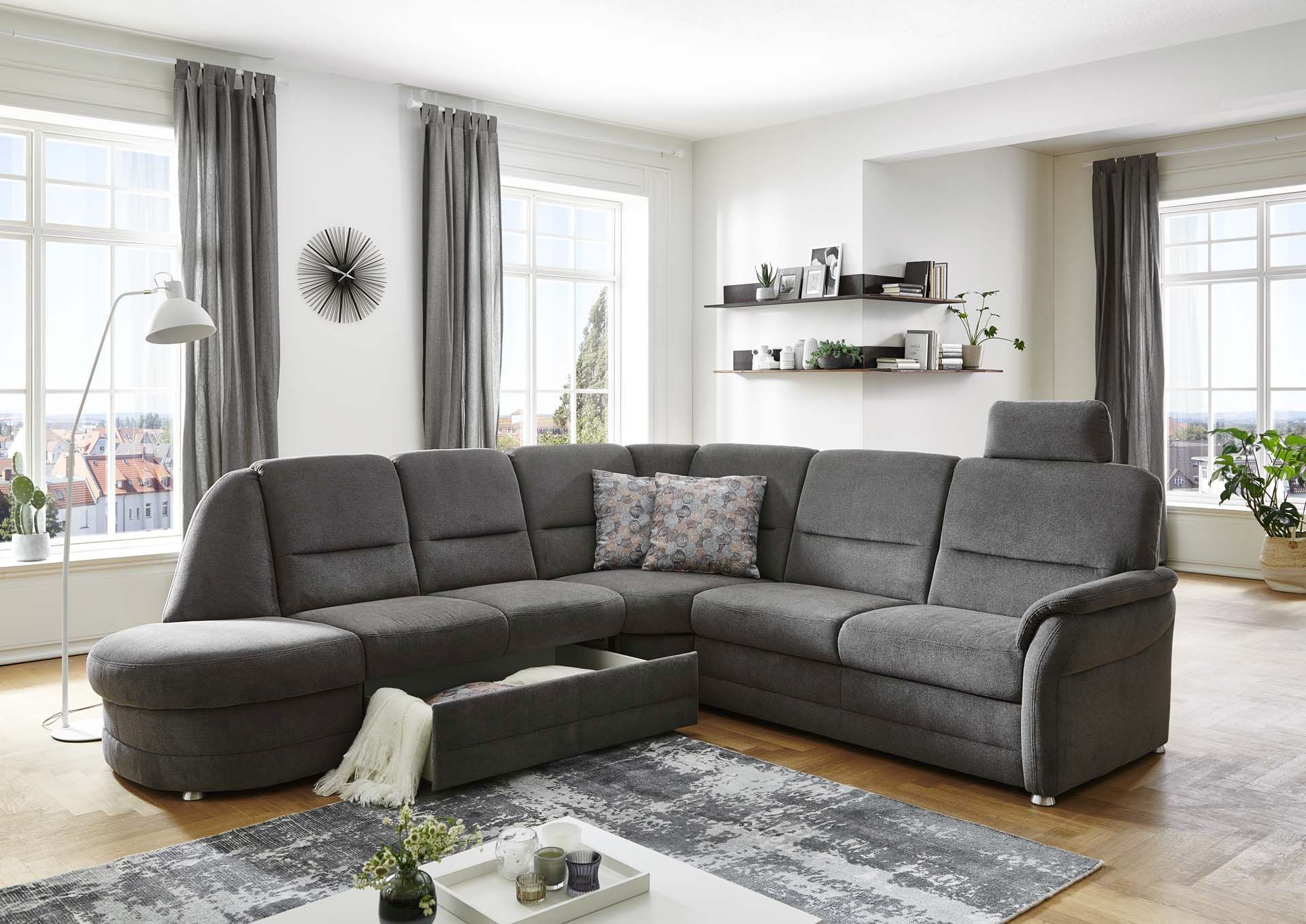 | Ausstattung Polster: | Kopfstützen, Ottomane links, Rücken echt, inkl. Bettkasten | ||