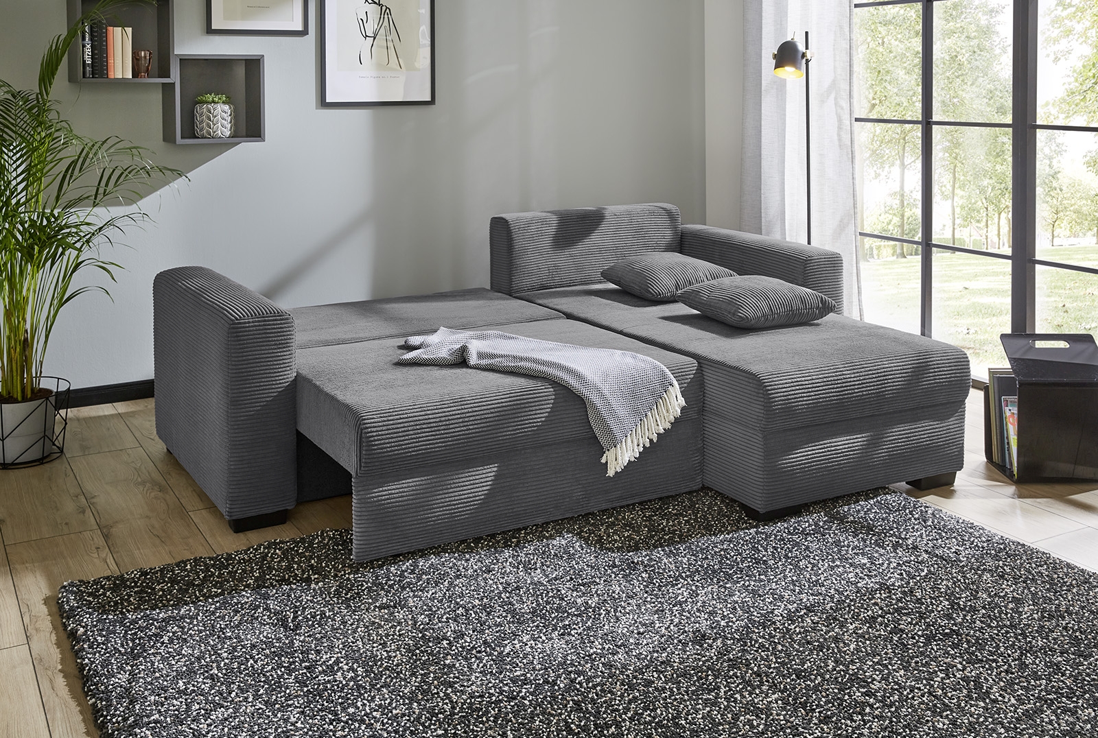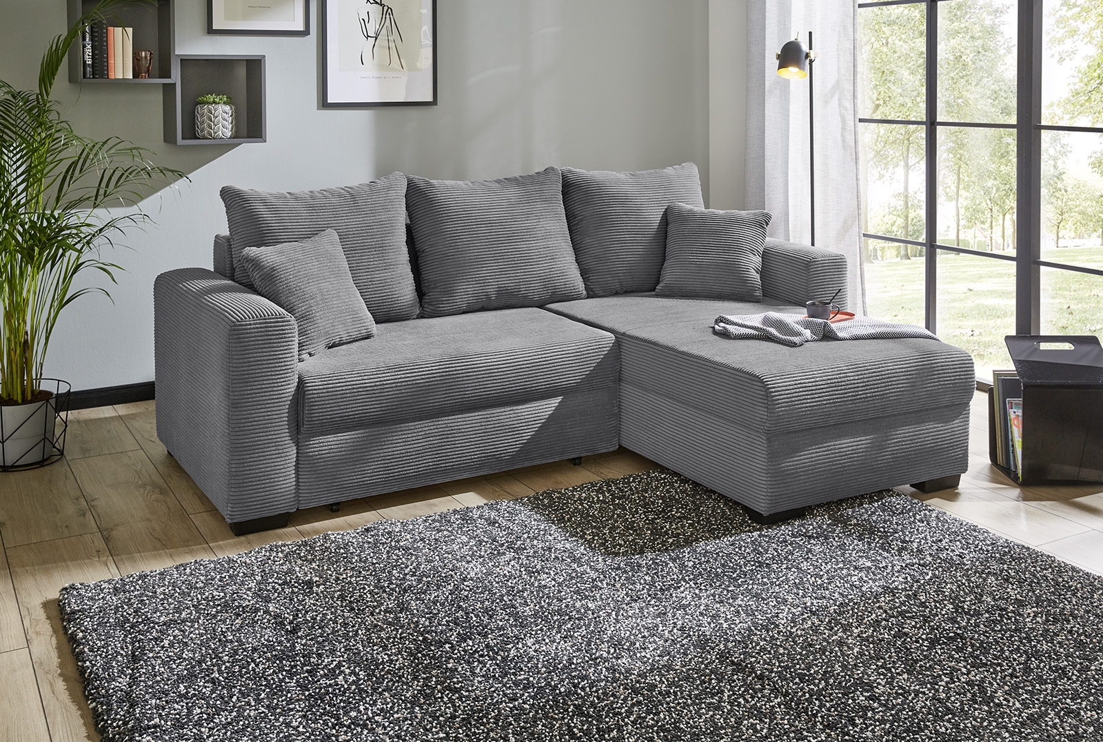 | Ausstattung Polster: | Ottomane rechts links wählbar, Rücken echt, inkl. Bettkasten, inkl. Kissen | ||