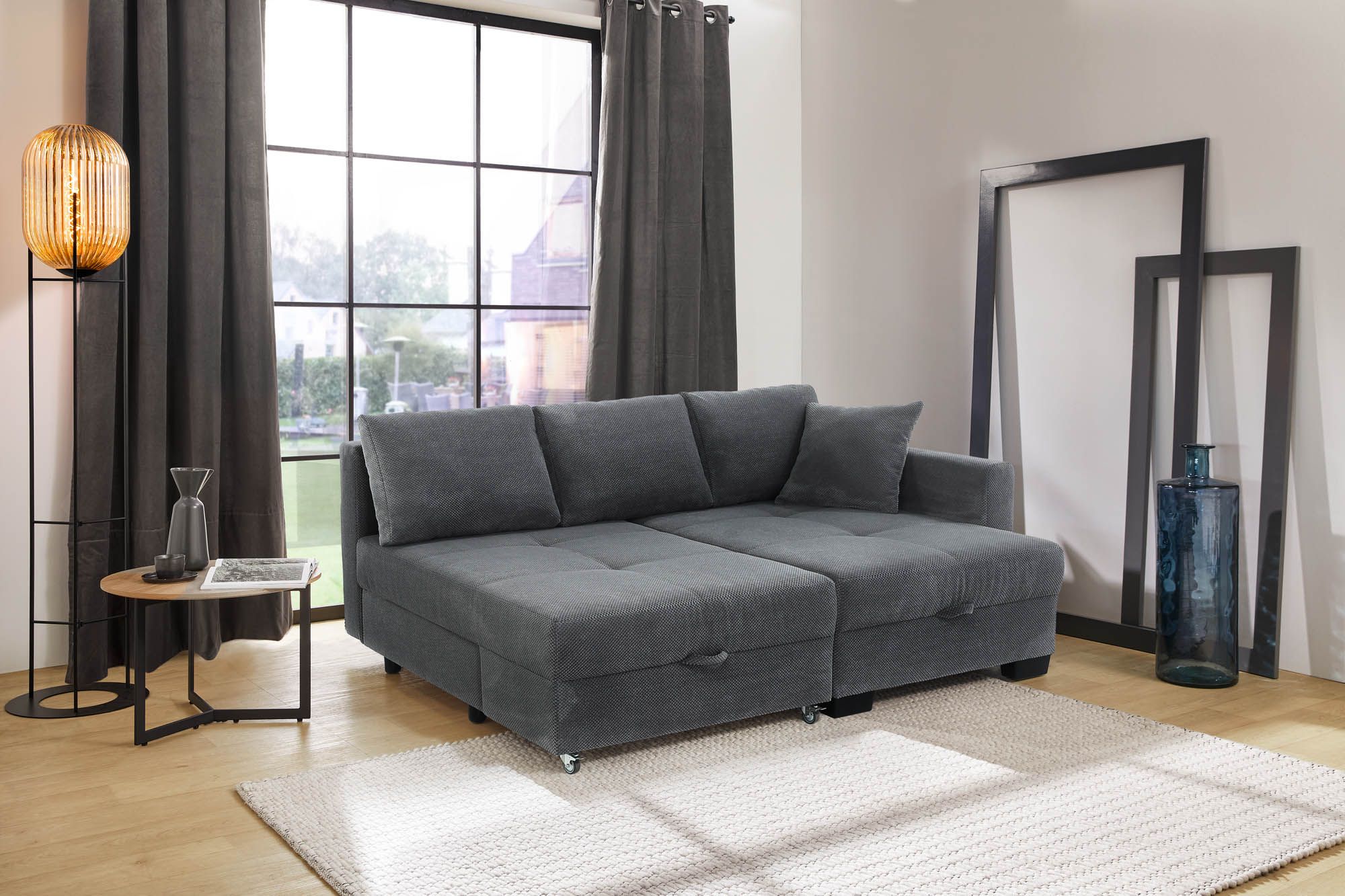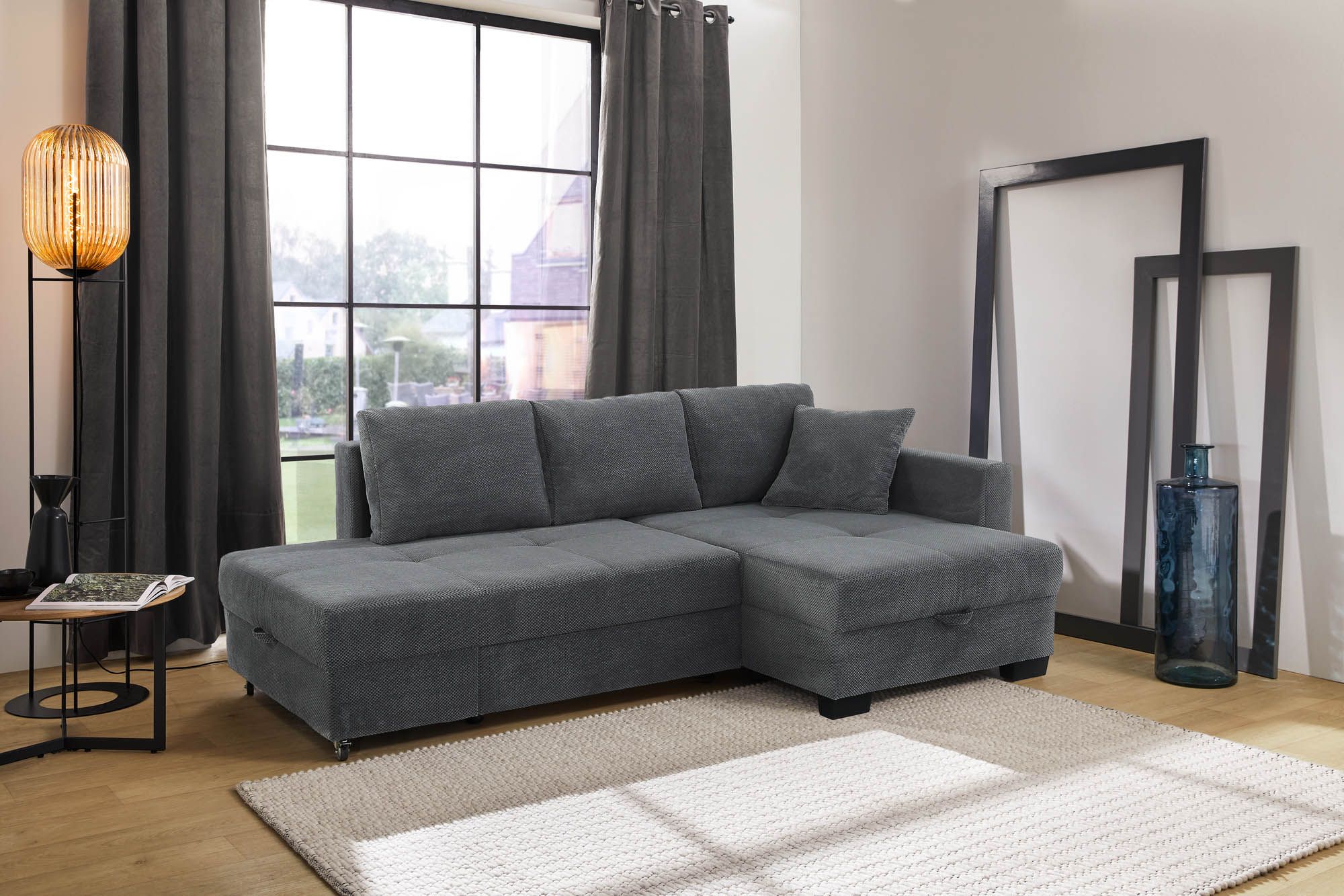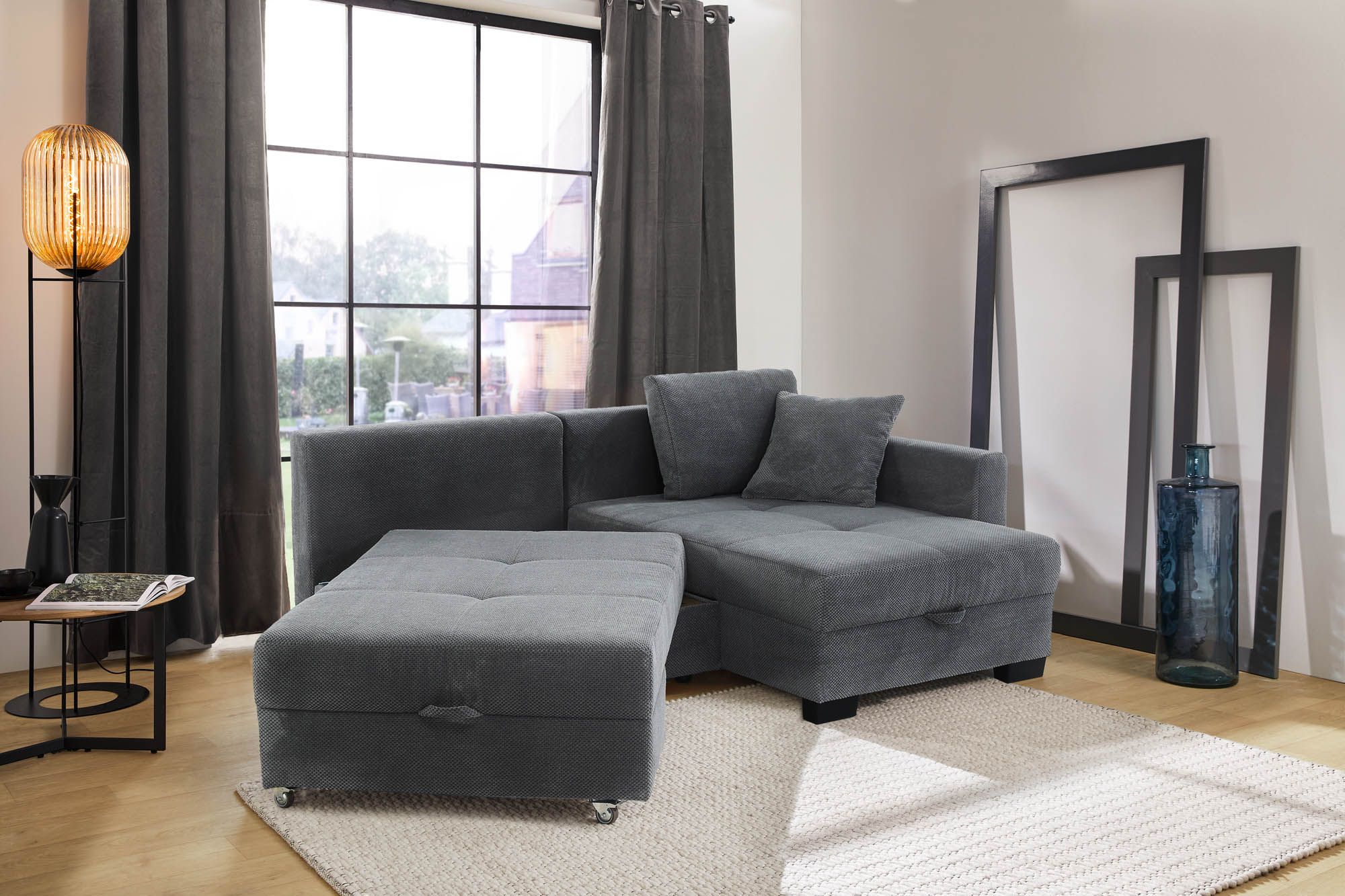 | Ausstattung Polster: | Ottomane rechts links wählbar, Rücken echt, inkl. Bettkasten, inkl. Kissen | ||