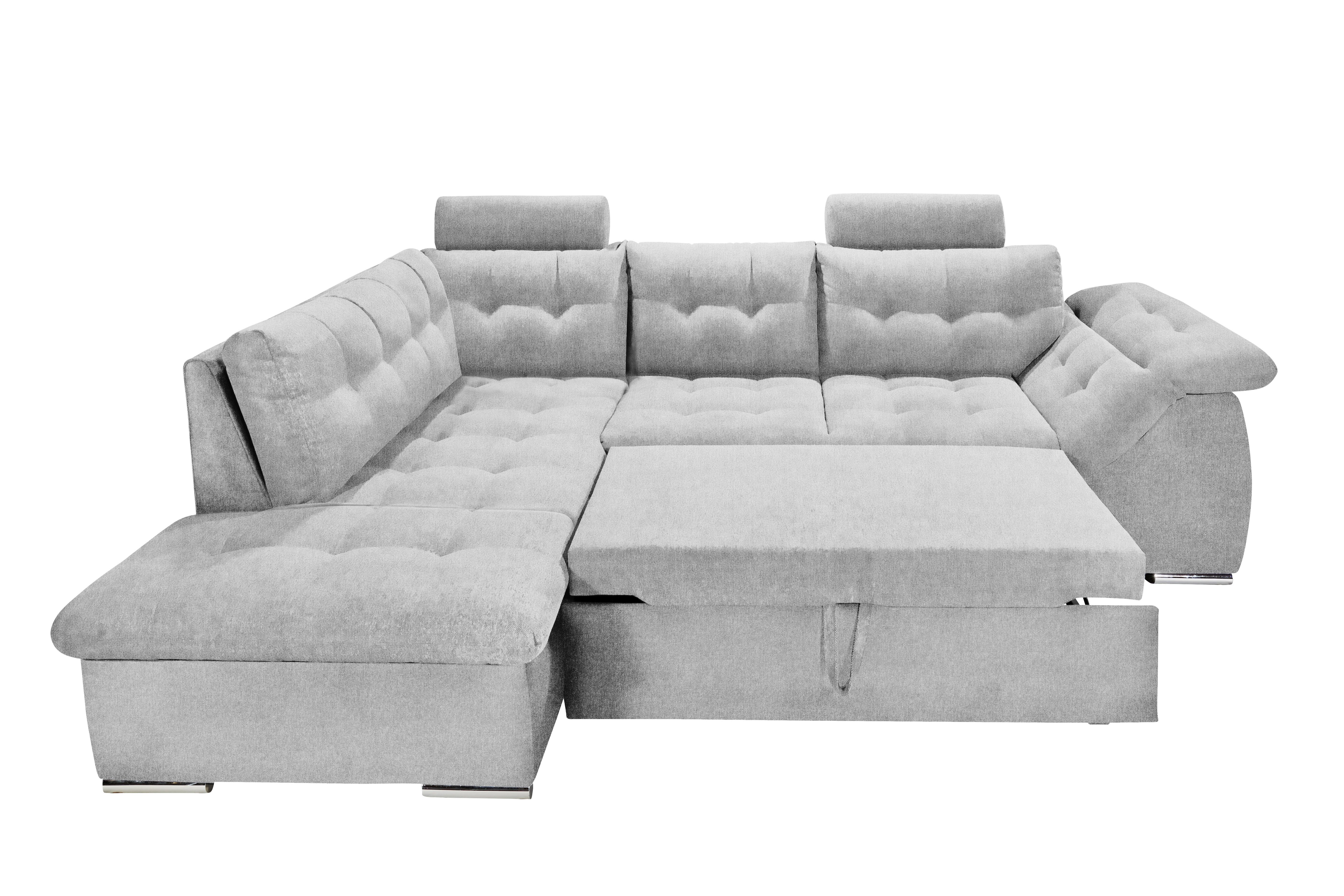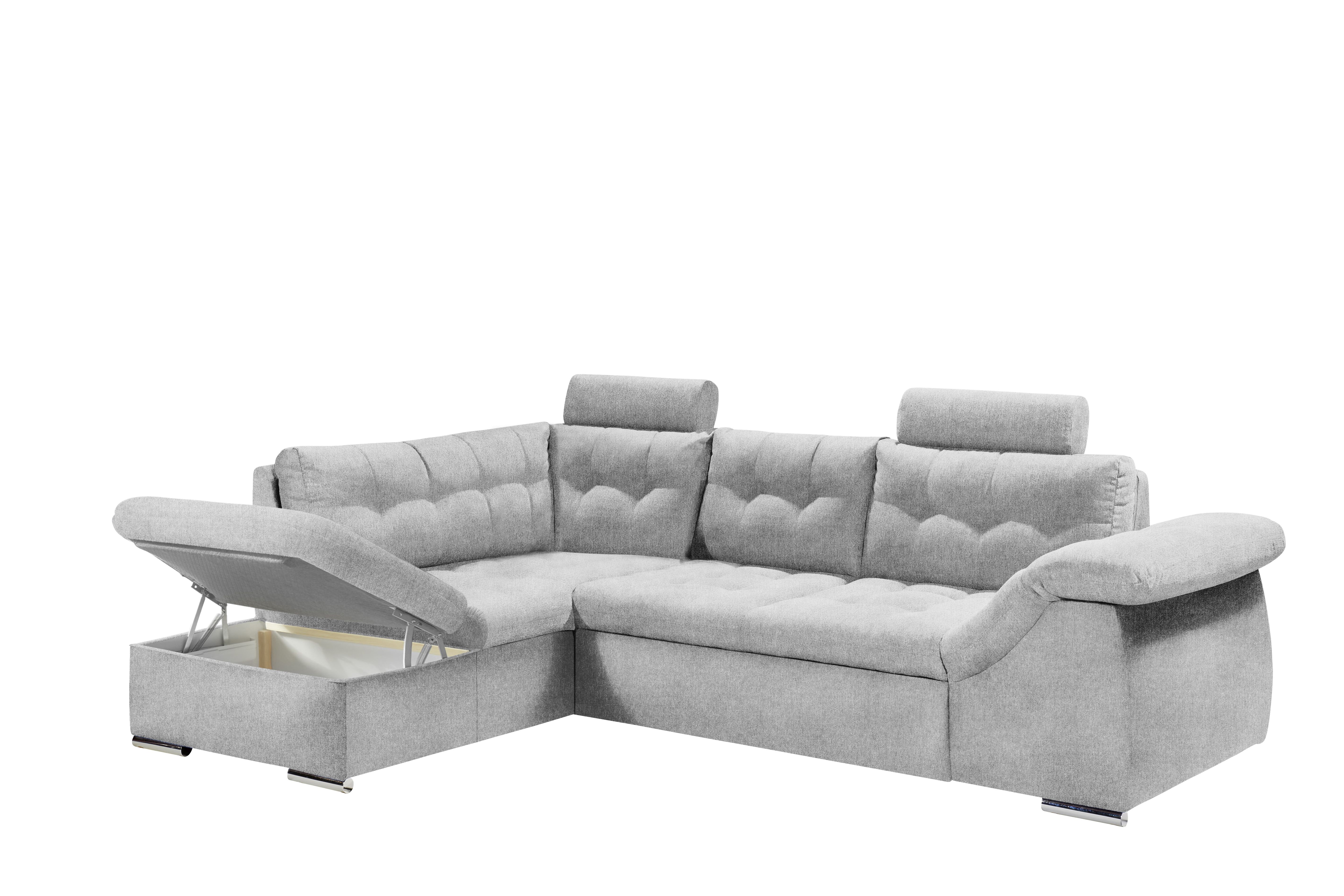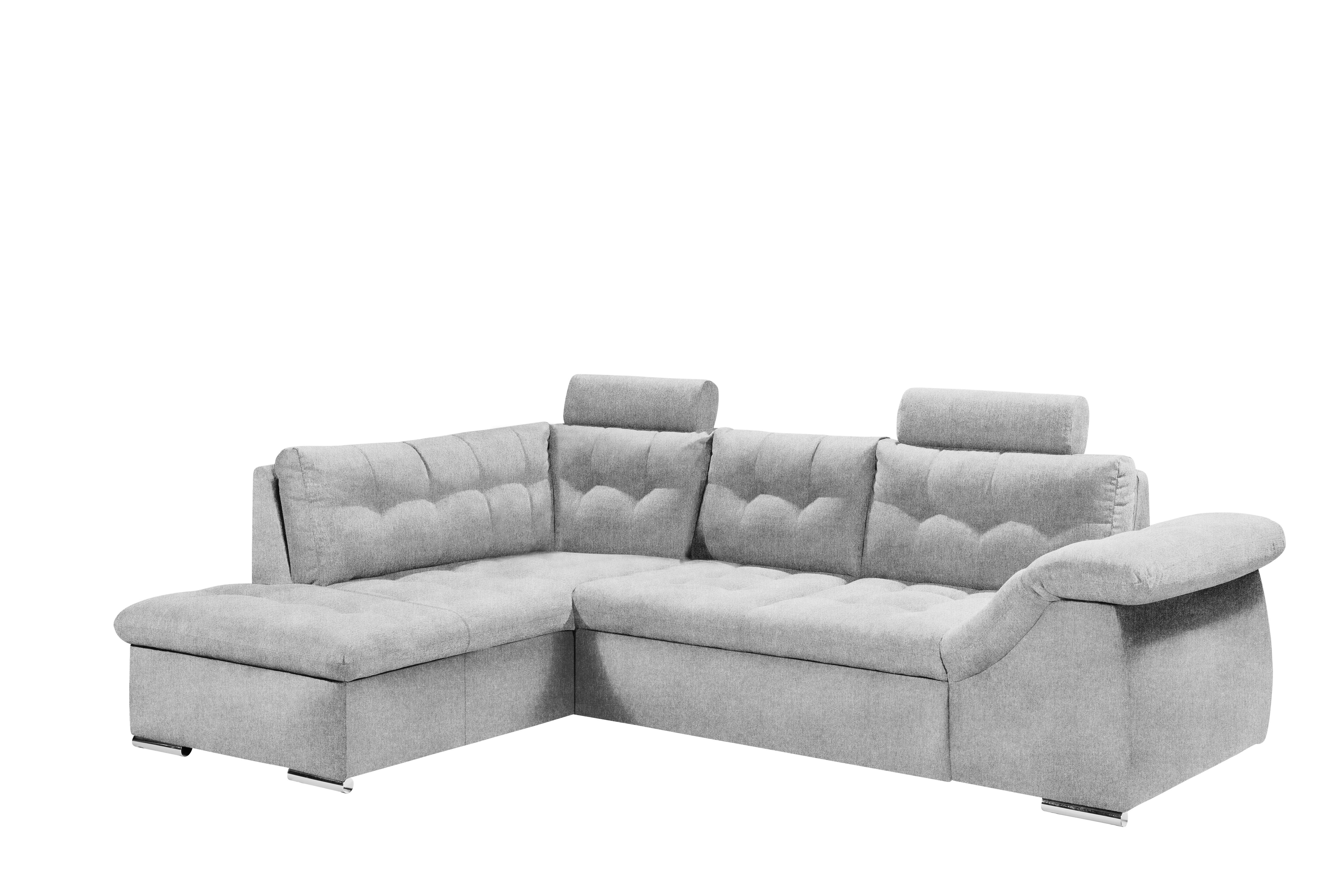 | Ausstattung Polster: | Kopfstützen, Ottomane links, Rücken echt, inkl. Bettkasten | ||