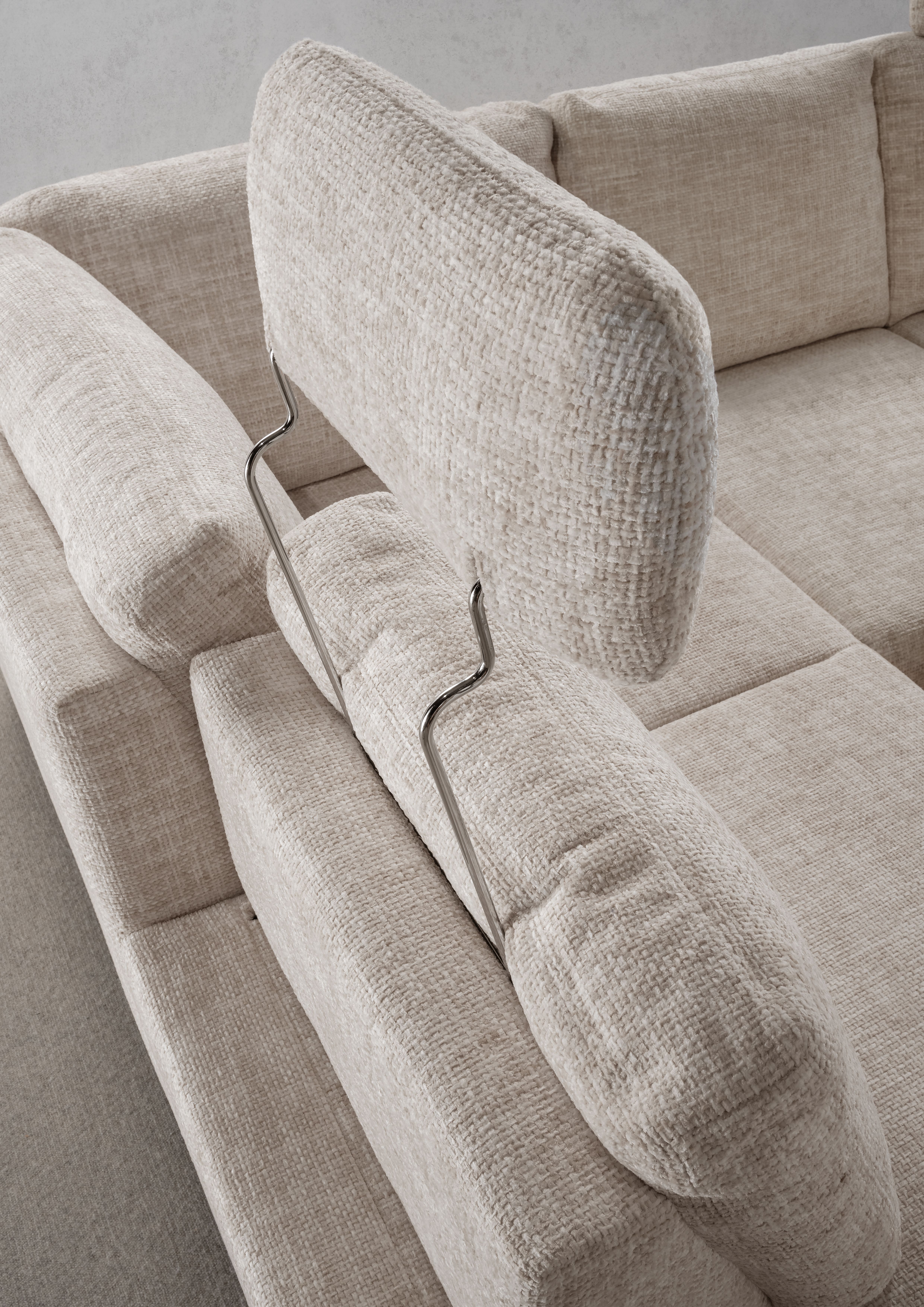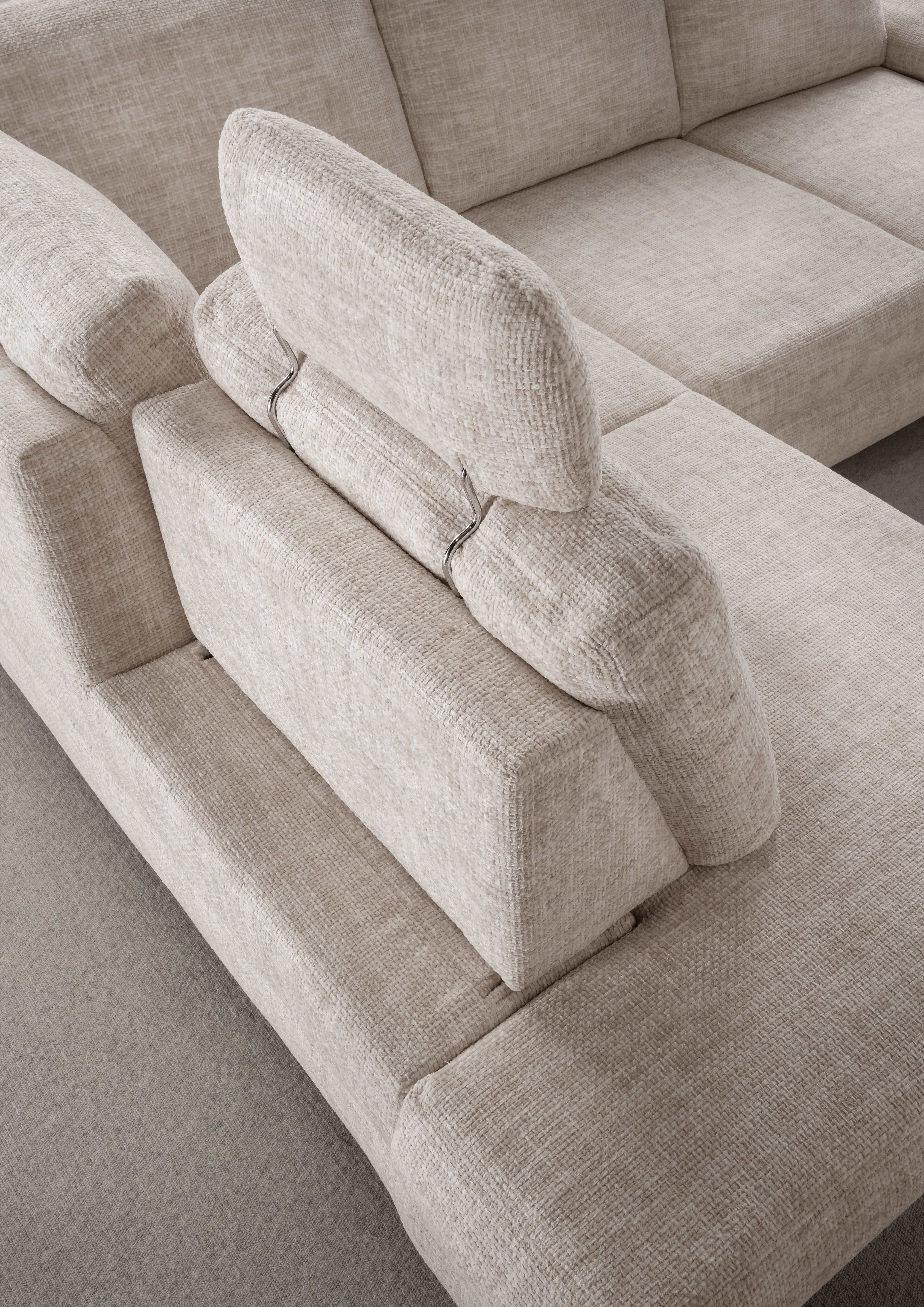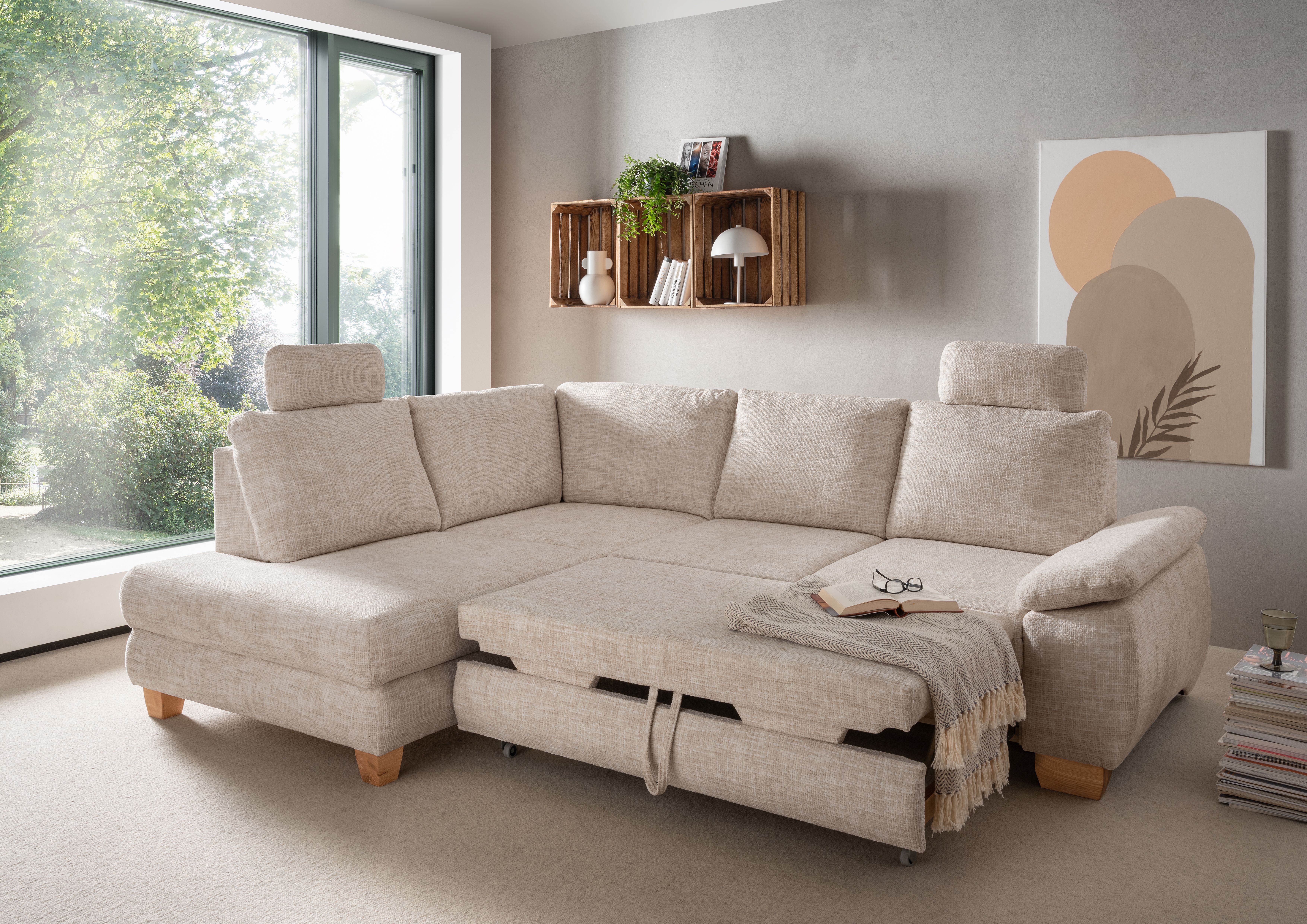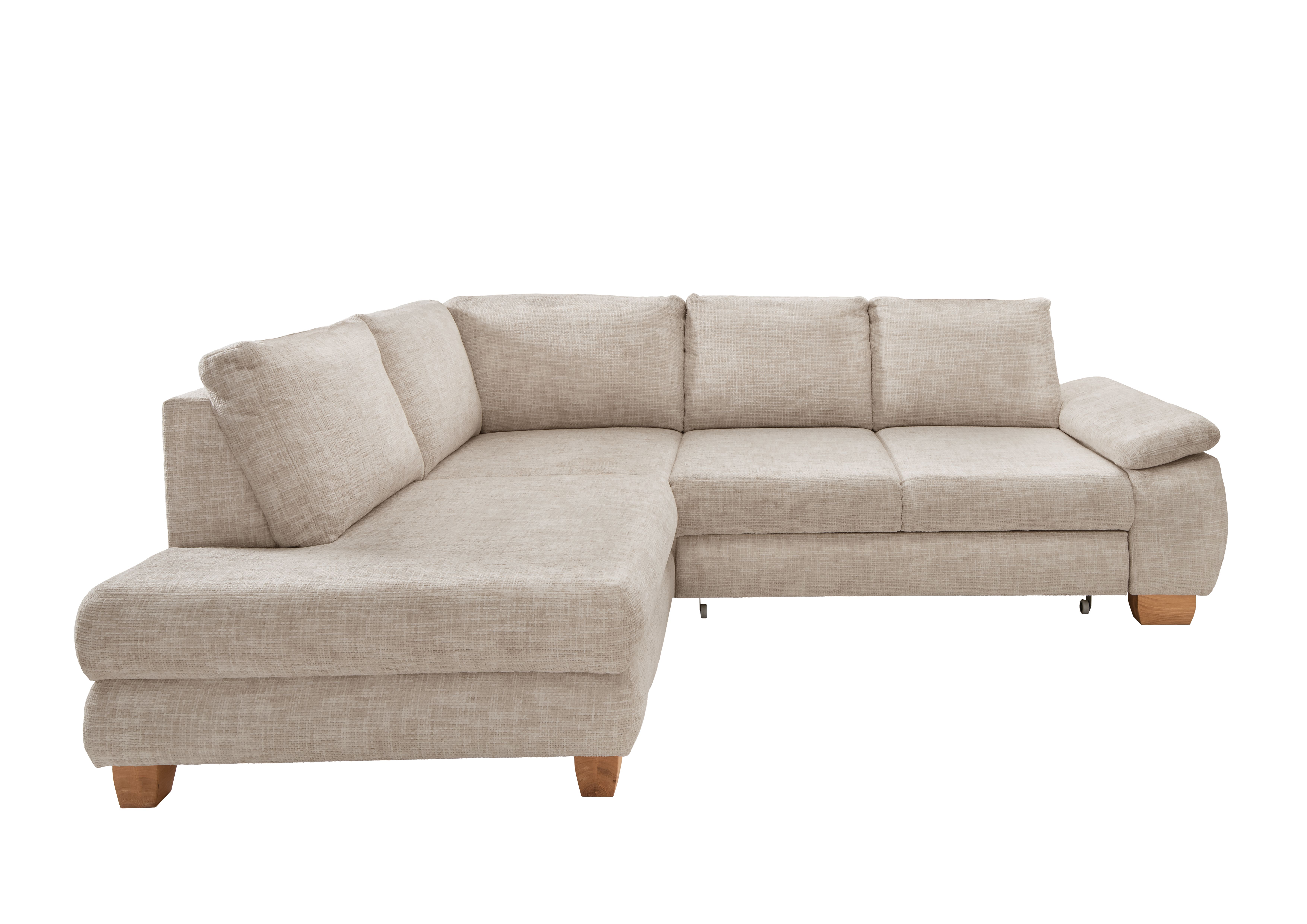| Ausstattung Polster: | Kopfstützen, Ottomane links, Rücken echt, Sitzvorzug manuell, inkl. Bettkasten | ||