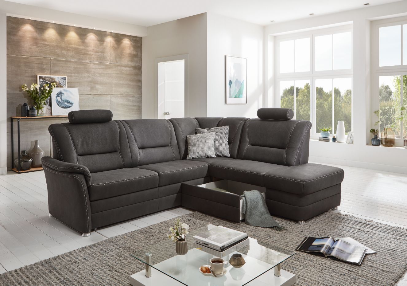 | Ausstattung Polster: | Kopfstützen, Ottomane rechts, Rücken echt, Stauraum | ||