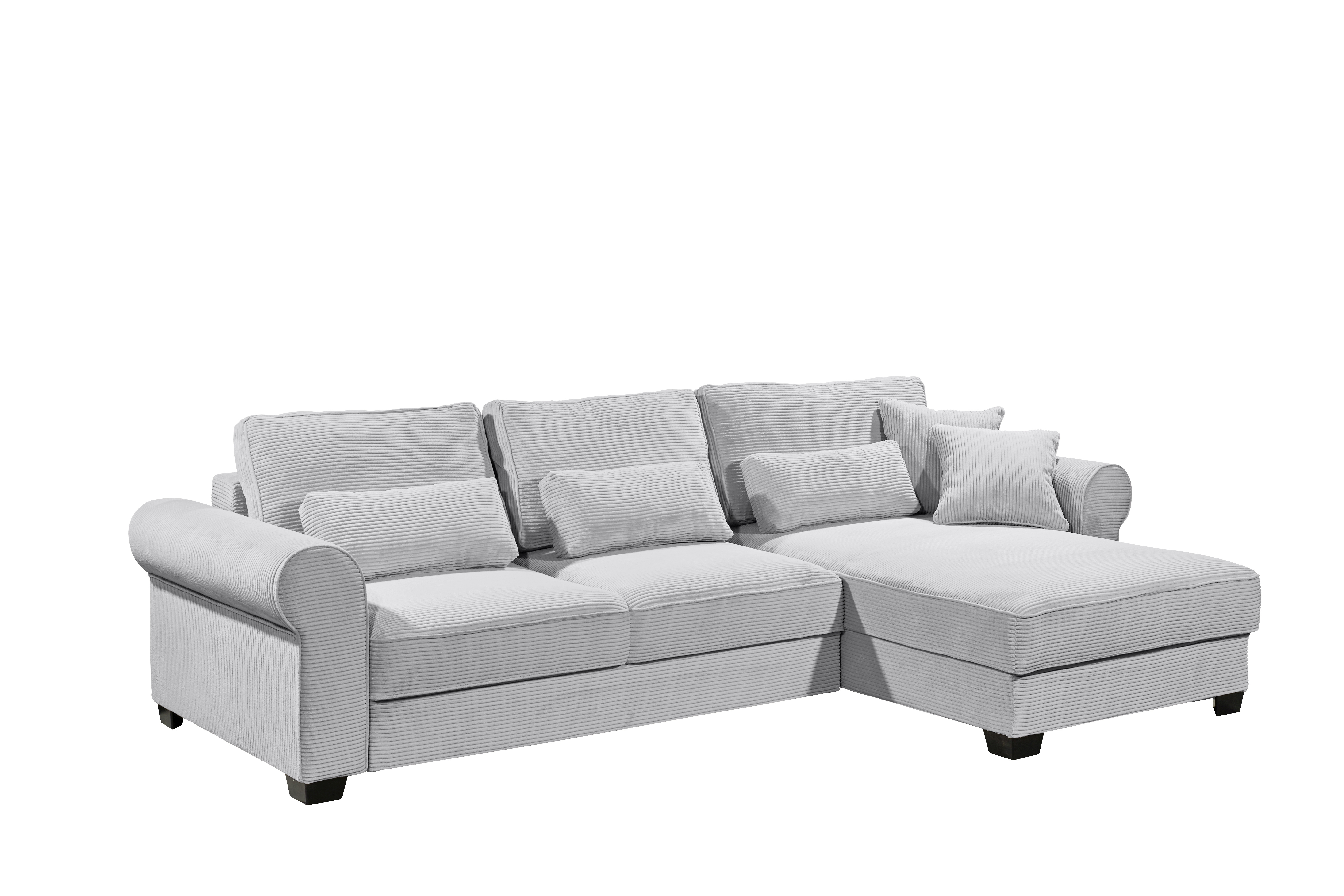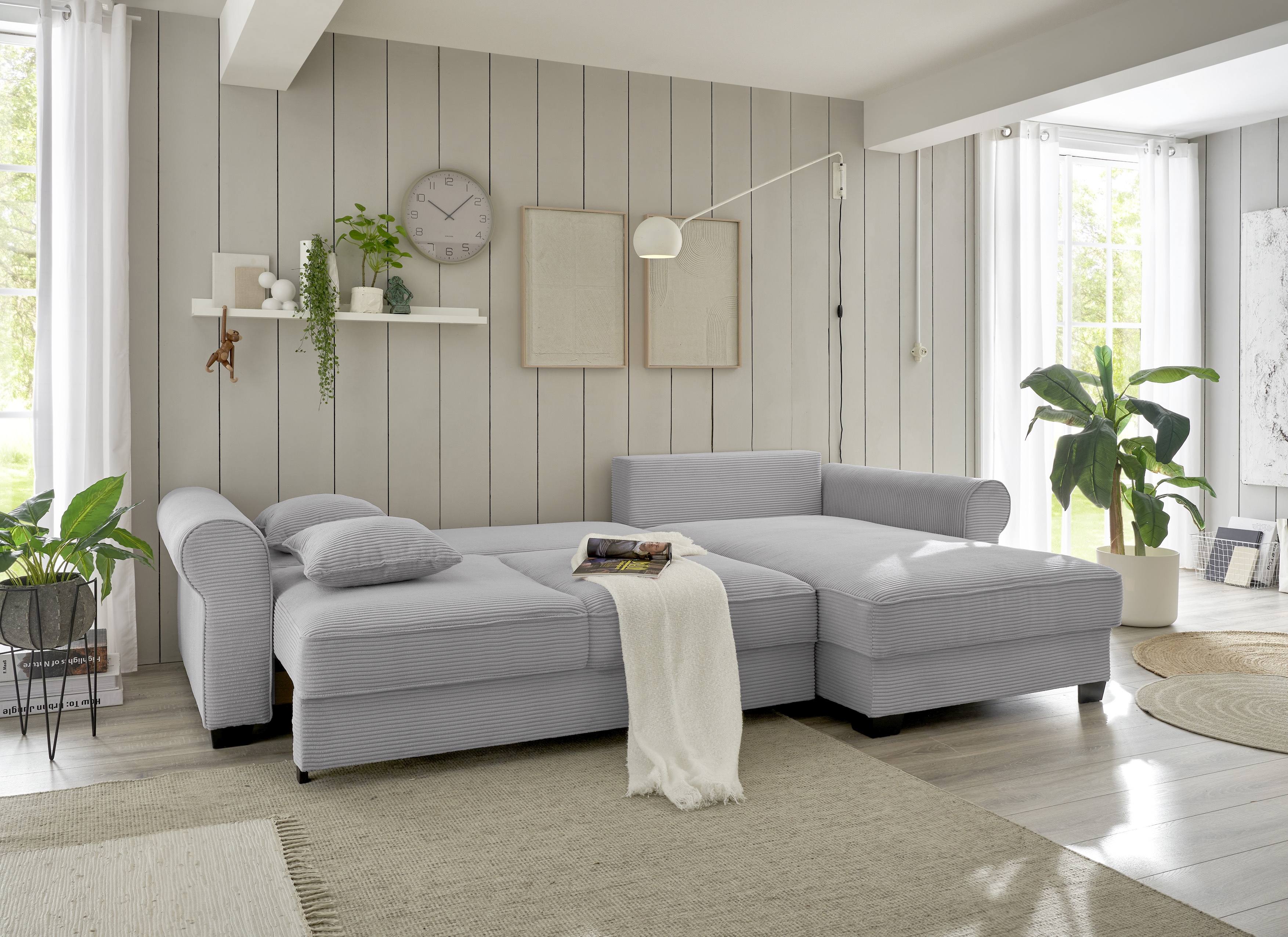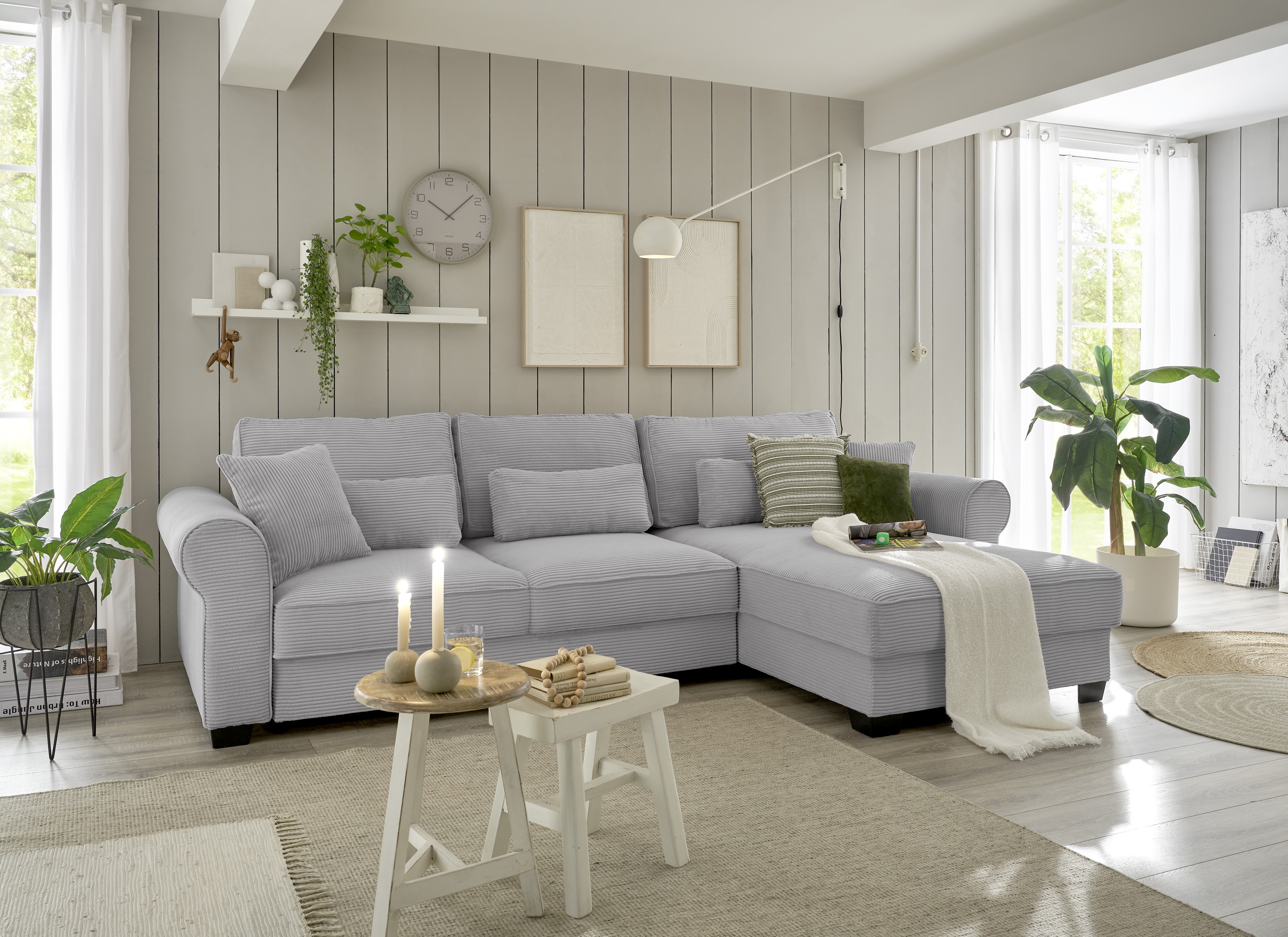 | Ausstattung Polster: | Ottomane rechts links wählbar, Rücken echt, inkl. Bettkasten, inkl. Kissen | ||