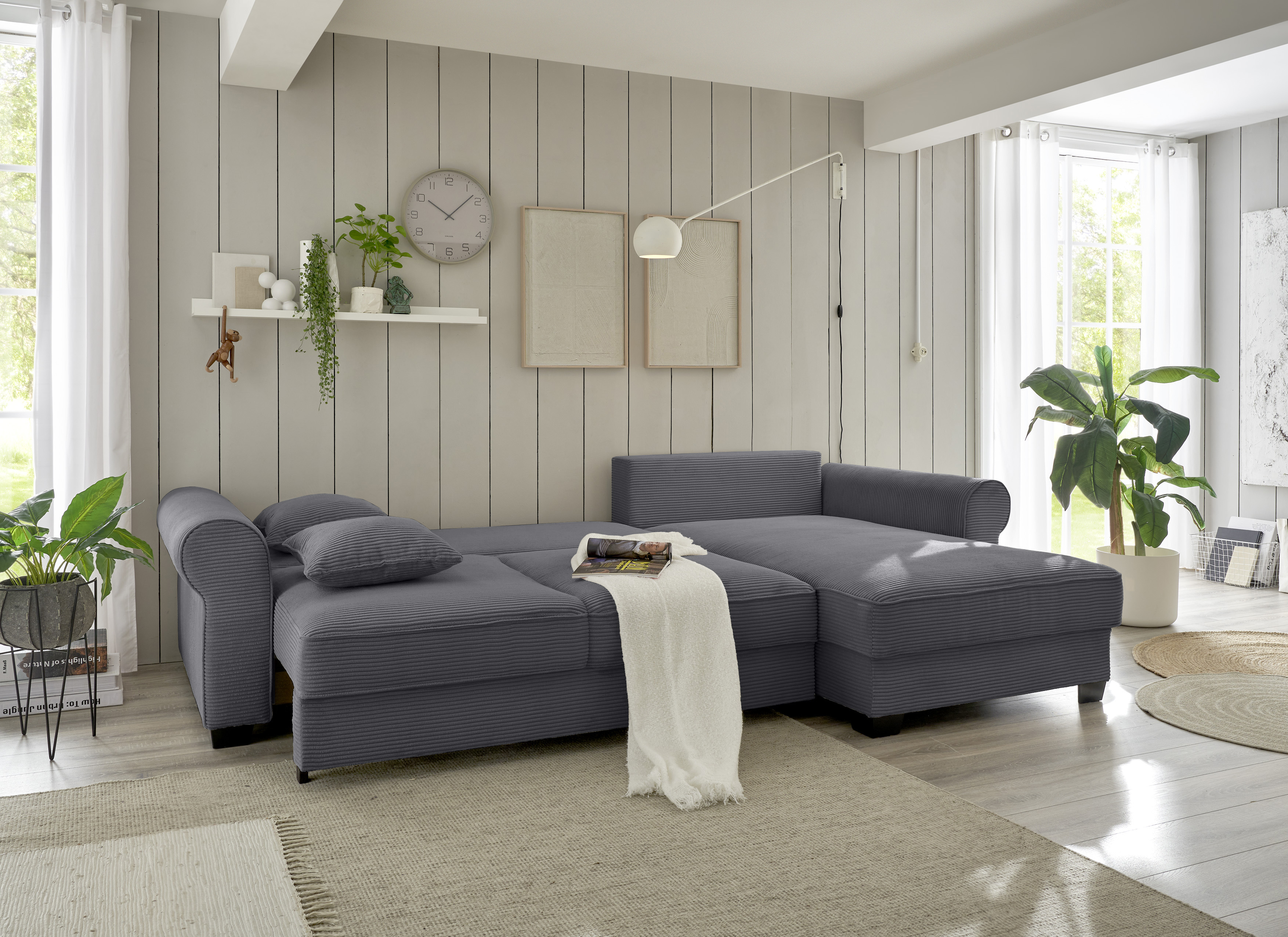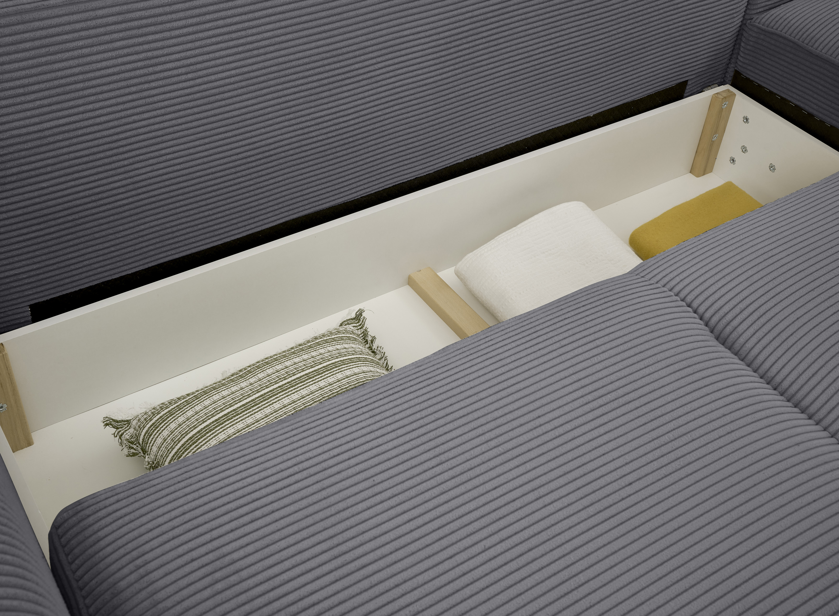 | Ausstattung Polster: | Ottomane rechts links wählbar, Rücken echt, inkl. Bettkasten, inkl. Kissen | ||
