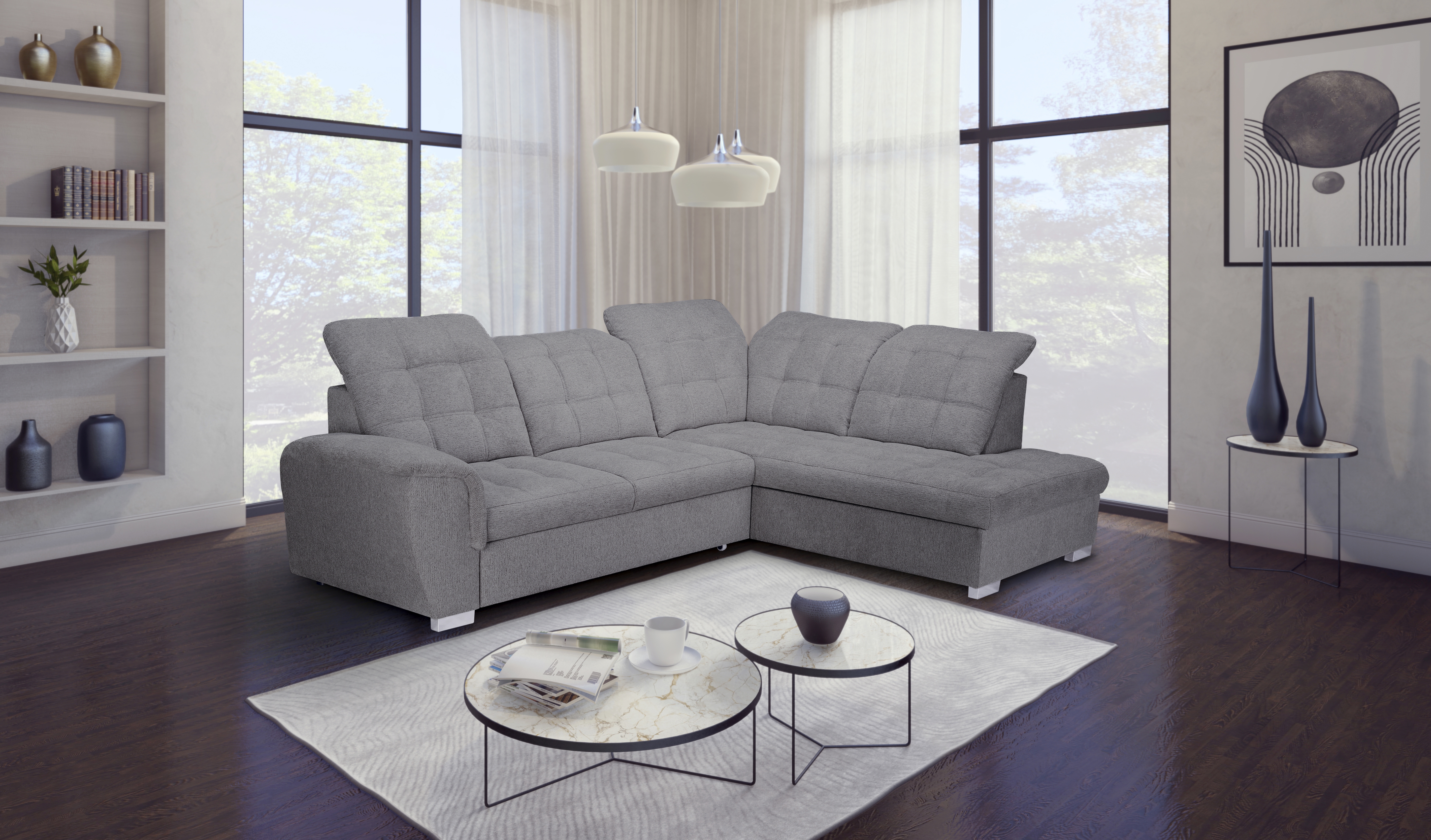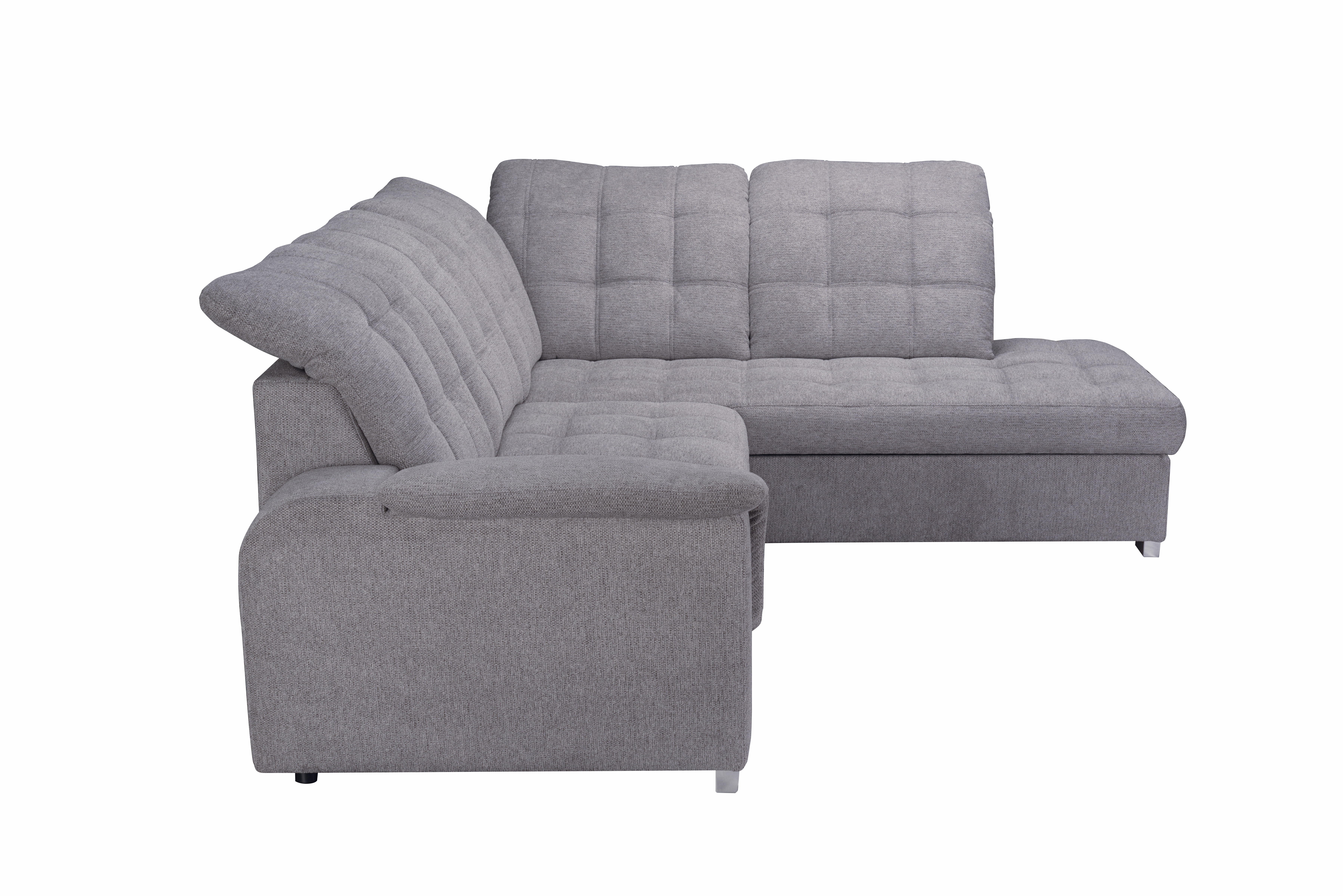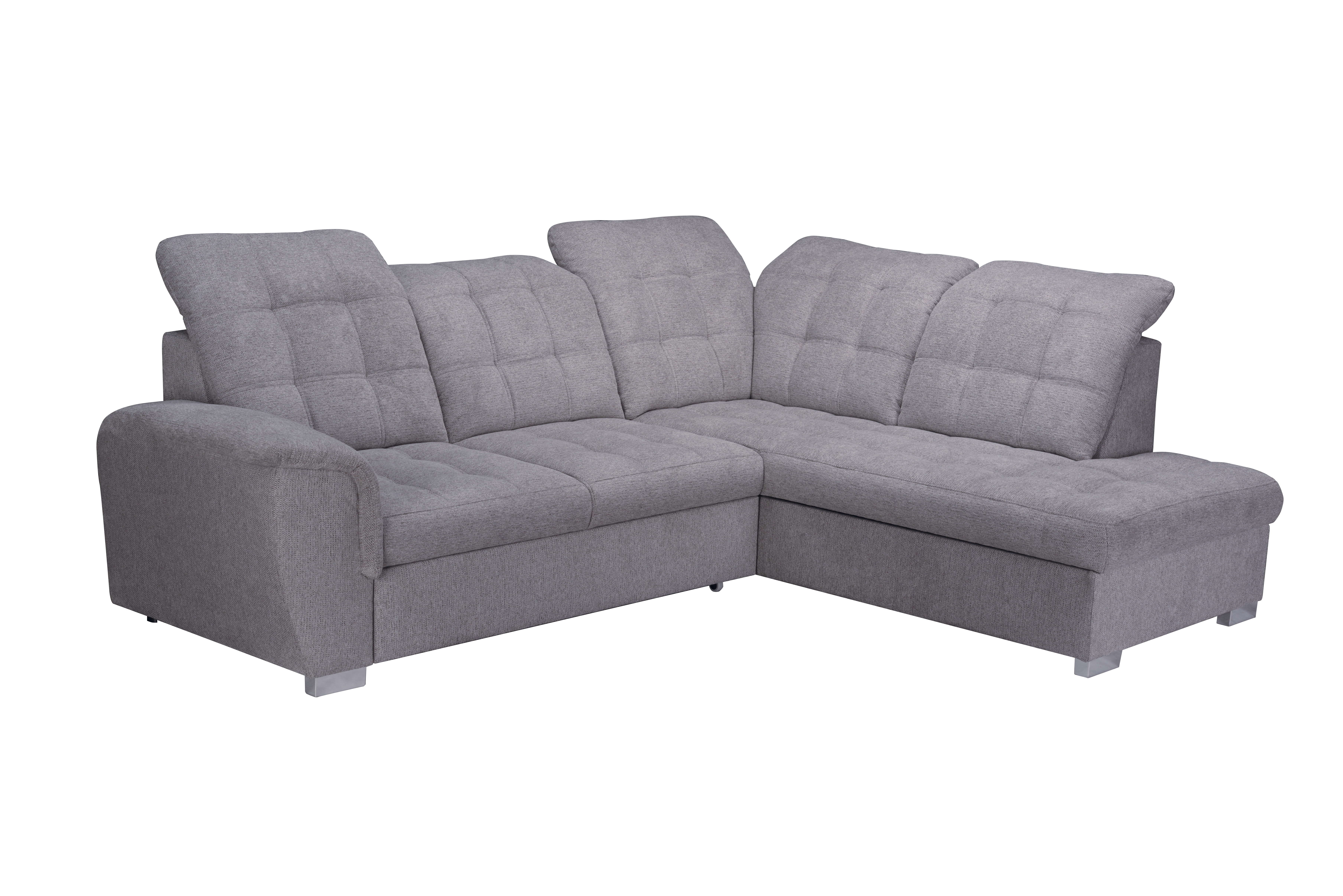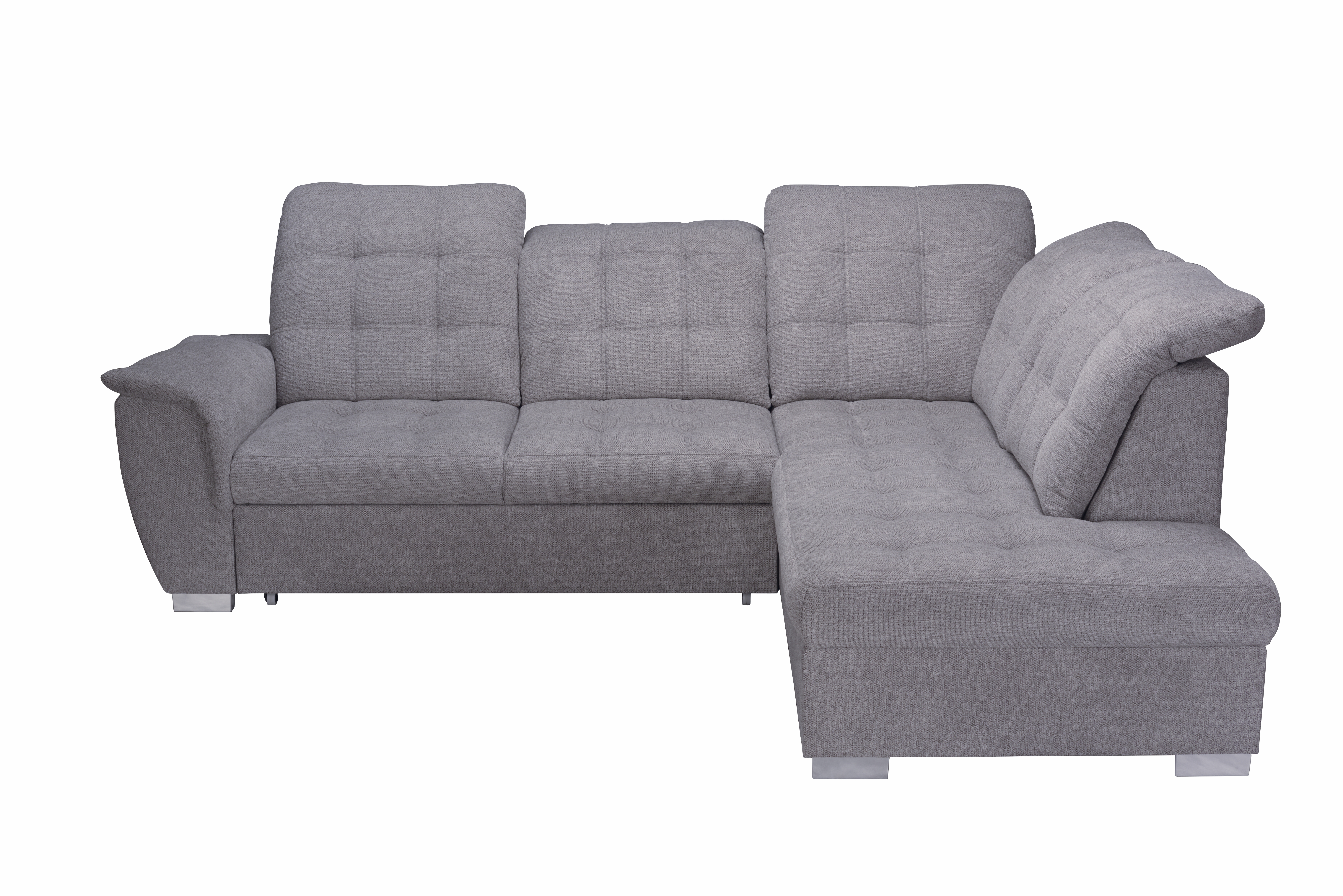 Diese praktische Polsterecke mit Ottomane rechts überzeugt durch ihren funktionalen Aufbau und modernen Bezug in neutralem Grau. Der strapazierfähige Stoff aus Polyester und Nylon ist pflegeleicht und alltagstauglich. Mit integrierter Bettfunktion, großzügigem Bettkasten und fünf verstellbaren Kopfstützen bietet das Sofa hohen Komfort und zusätzlichen Stauraum. Die komfortable Schaumstoffpolsterung auf Wellenunterfederung sorgt für angenehmes Sitzen und Liegen. Ideal für Wohnräume mit begrenztem Platzangebot – ob als gemütliche Sitzecke oder als Gästebett. Die Lieferung erfolgt ohne Dekoration. MEGA Möbel steht für durchdachte Lösungen zum günstigen Preis.