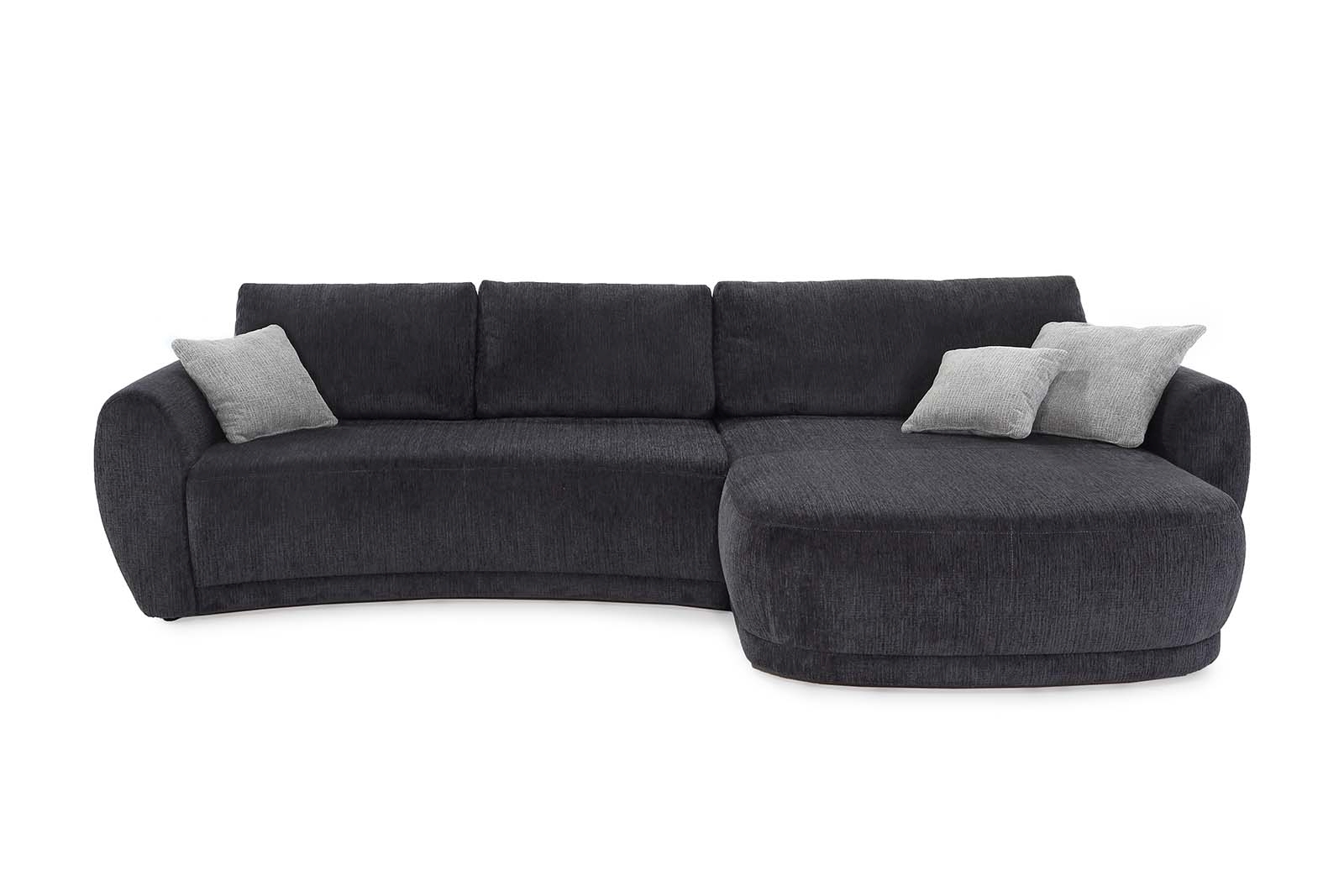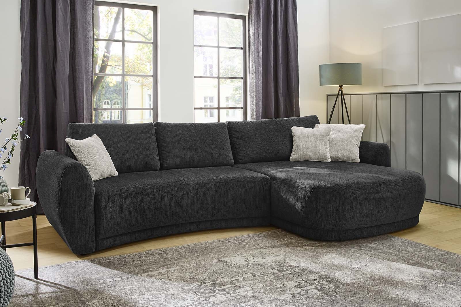 Bezug: Polsterecke in einem Chenille-Stoff 443/06 in der Farbe schwarz aus 100% Polyester; Zierkissen in einem hellgrauen Chenille-Stoff 443/29 aus 100% Polyester