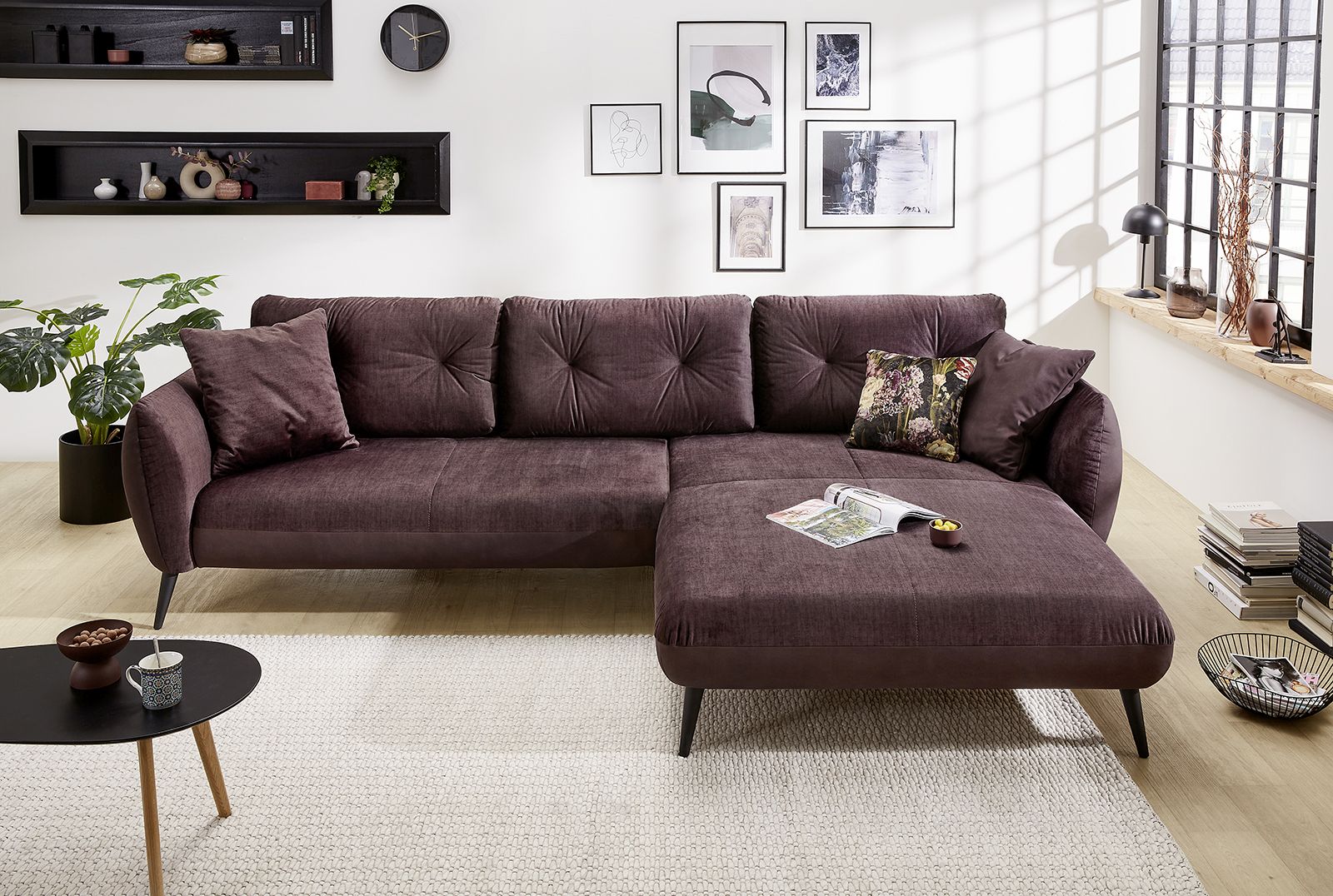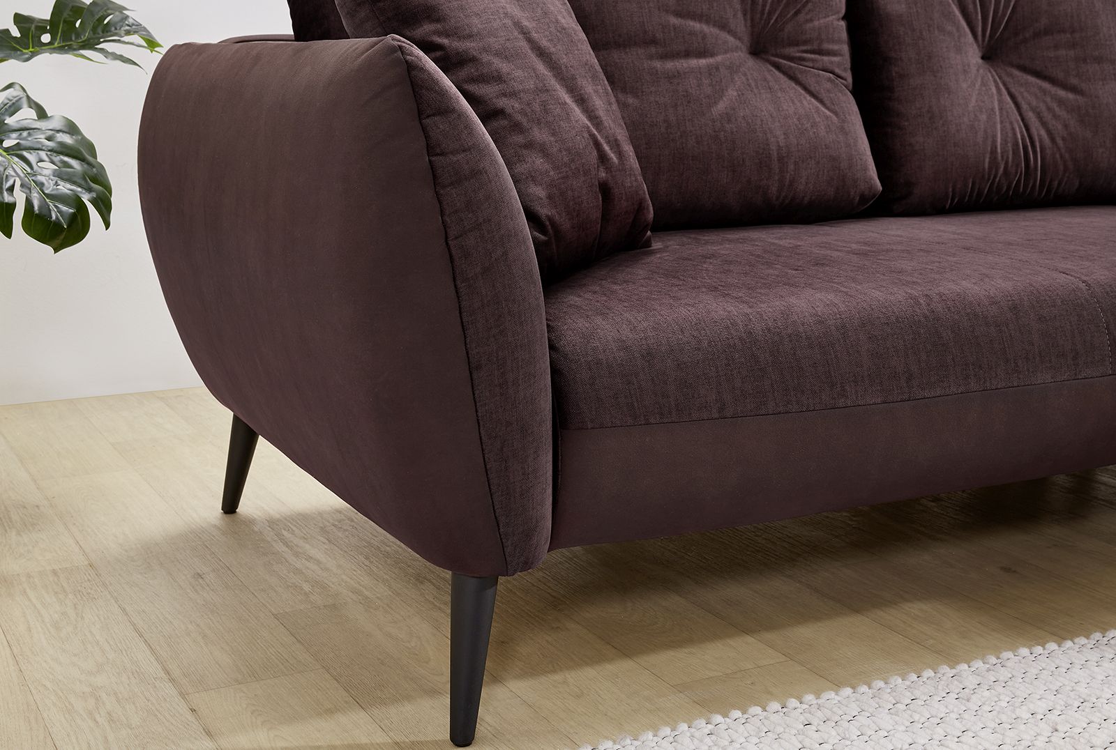 Bezug: Korpus in einer Microfaser in der Farbe aubergine aus 100% Polyester; Sitz, große Kissen und Rückenkissen in einem veloursartigem Stoff in aubergine aus 100% Polyester; Zierkissen in einer floral gemusterten Microfaser aus 100% Polyester