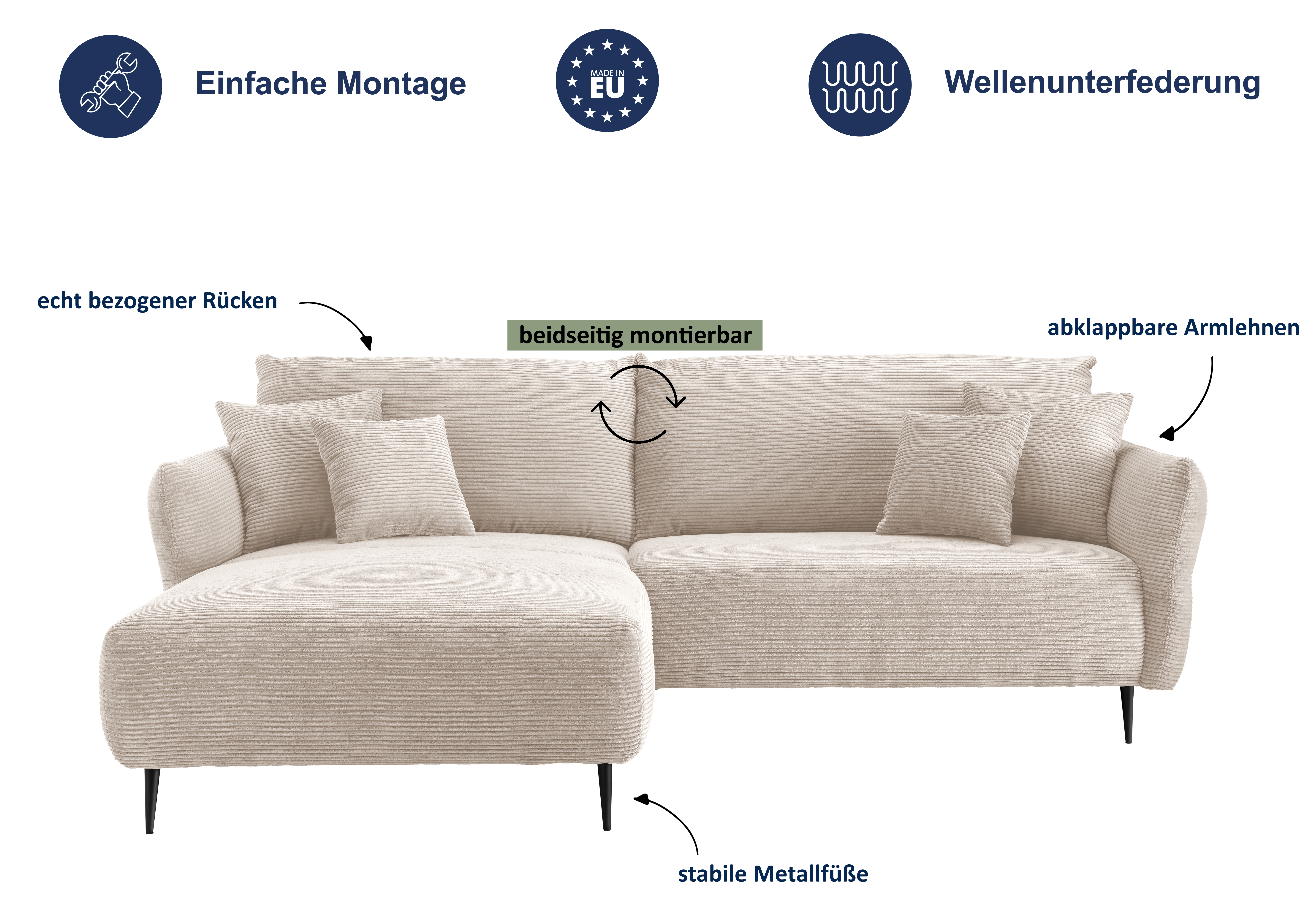 | Ausstattung Polster: | Ottomane rechts links wählbar, inkl. Kissen | ||