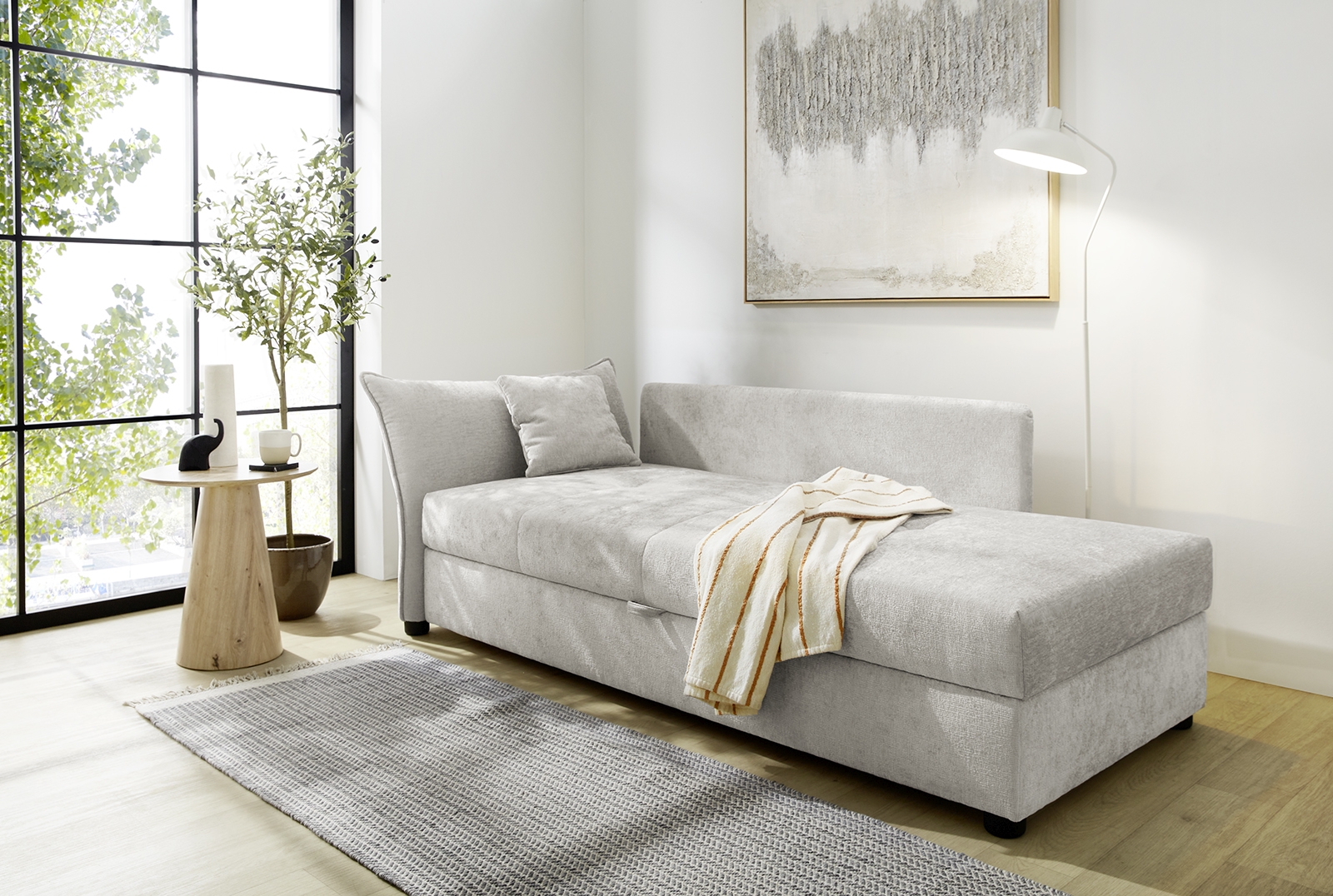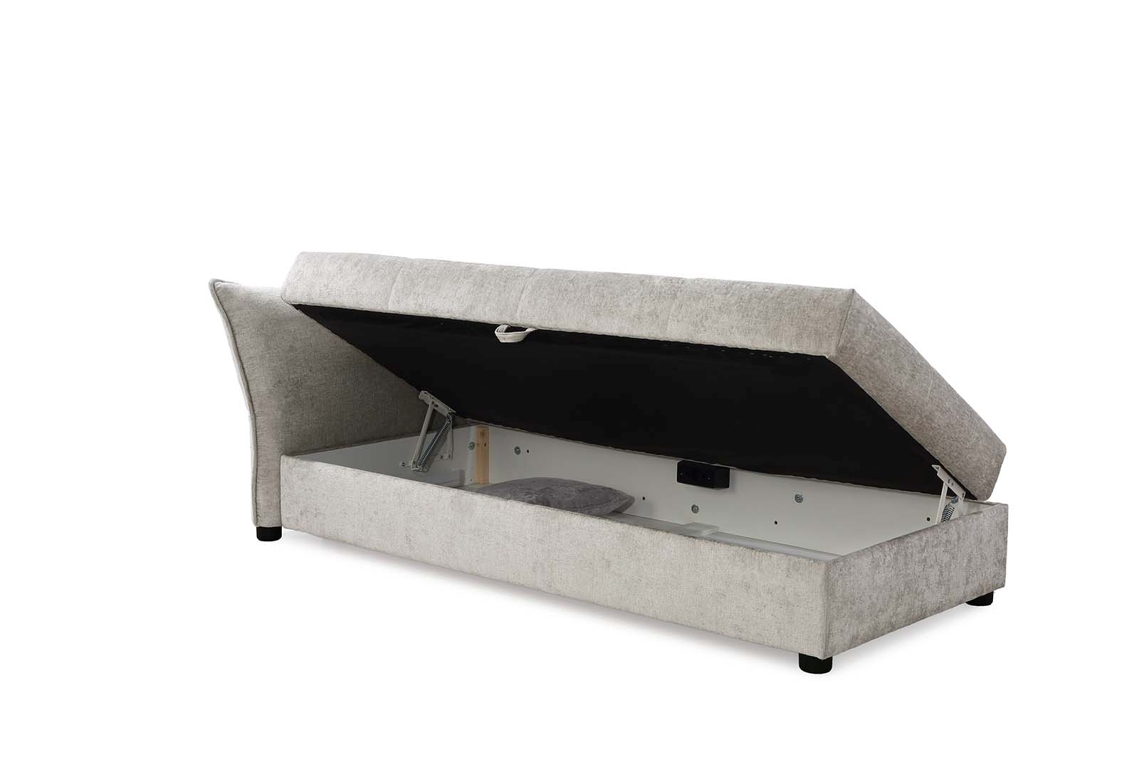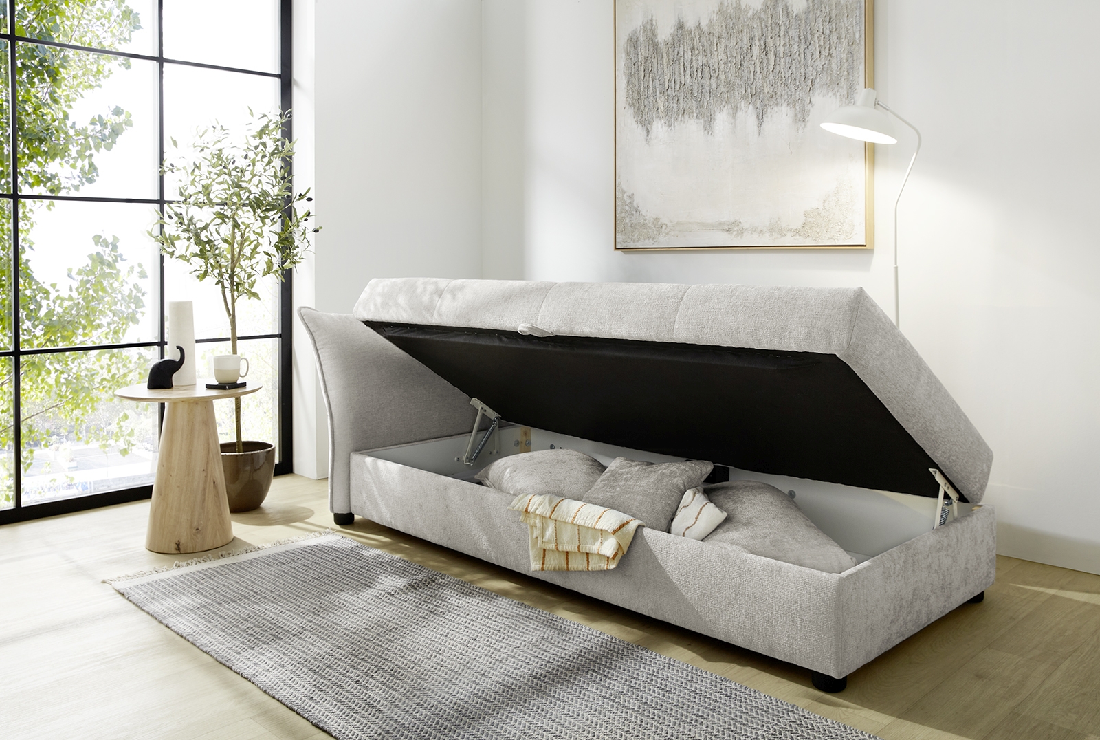 der integrierte Bettkasten bietet ausreichend Stauraum und ist mit Hilfe des Springaufbeschlages mit Zugfedern leicht zu öffnen