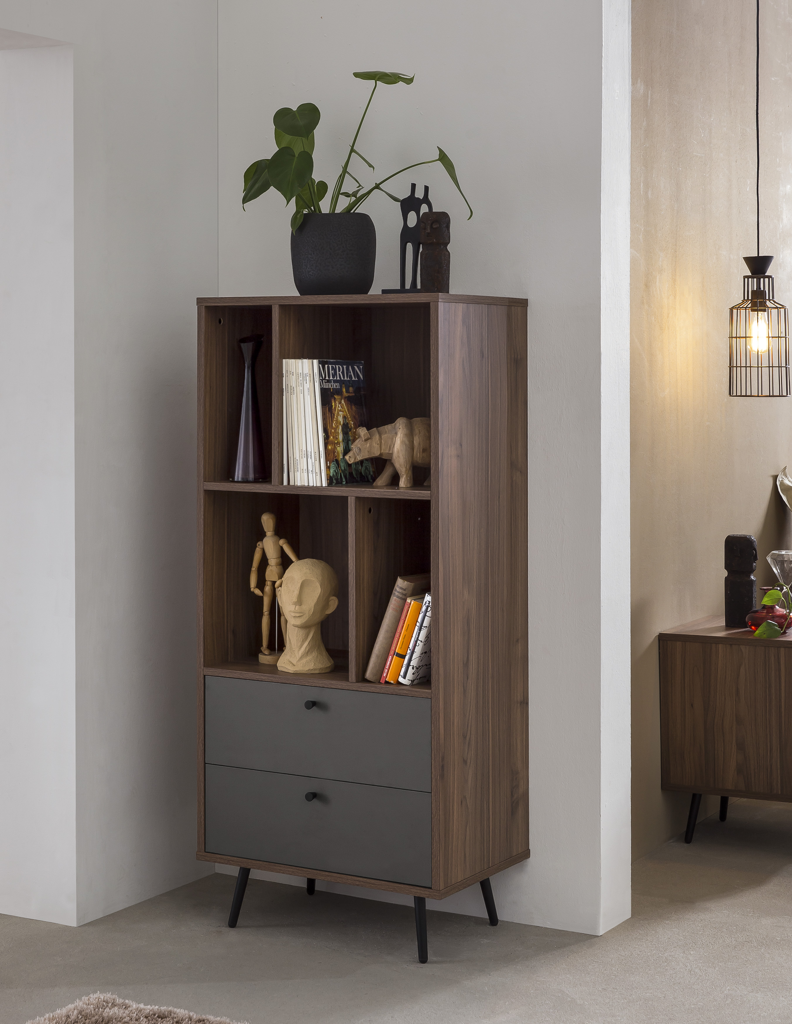 - 4 offene Fächer, 2 Schubladen für genügend Stauraum
