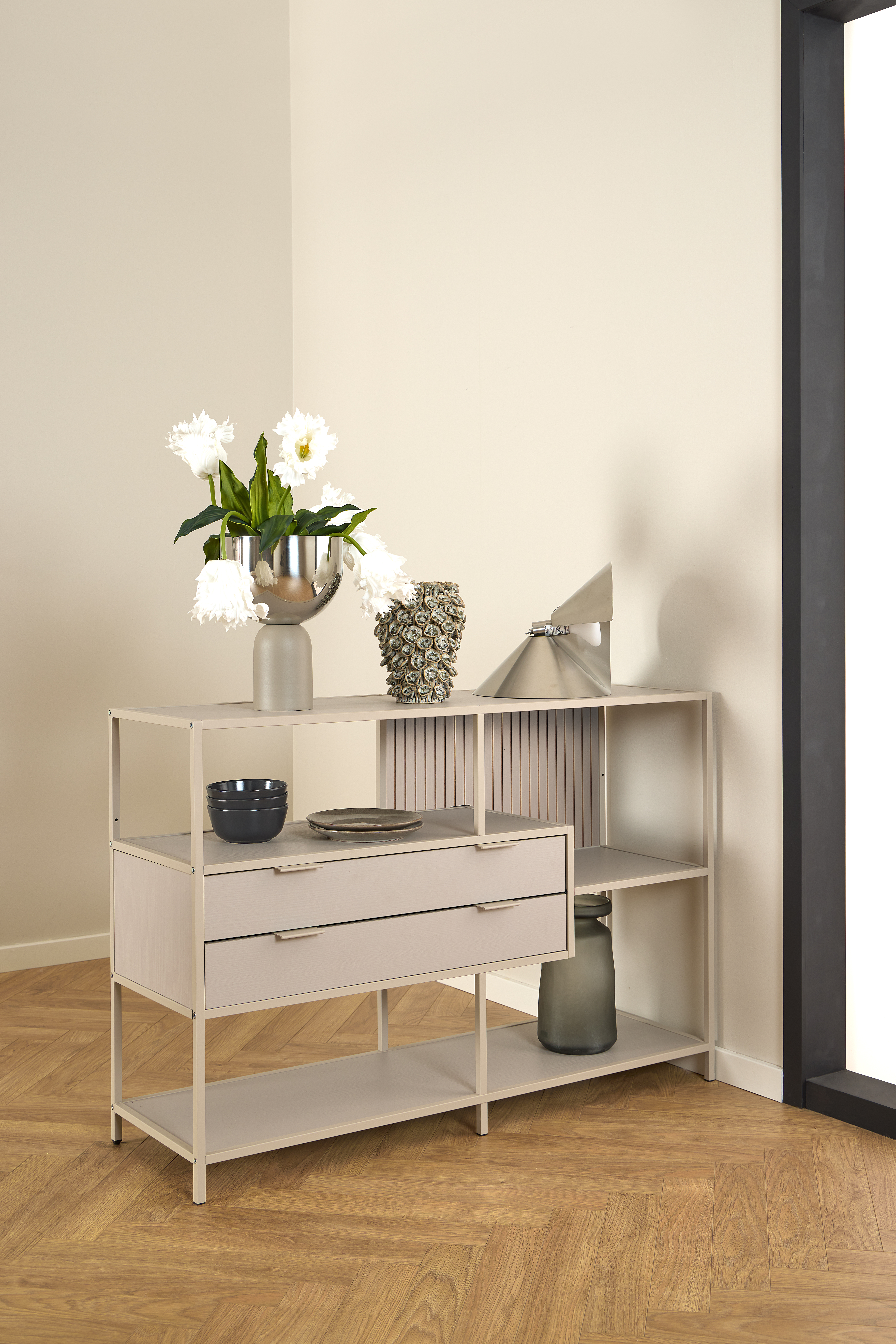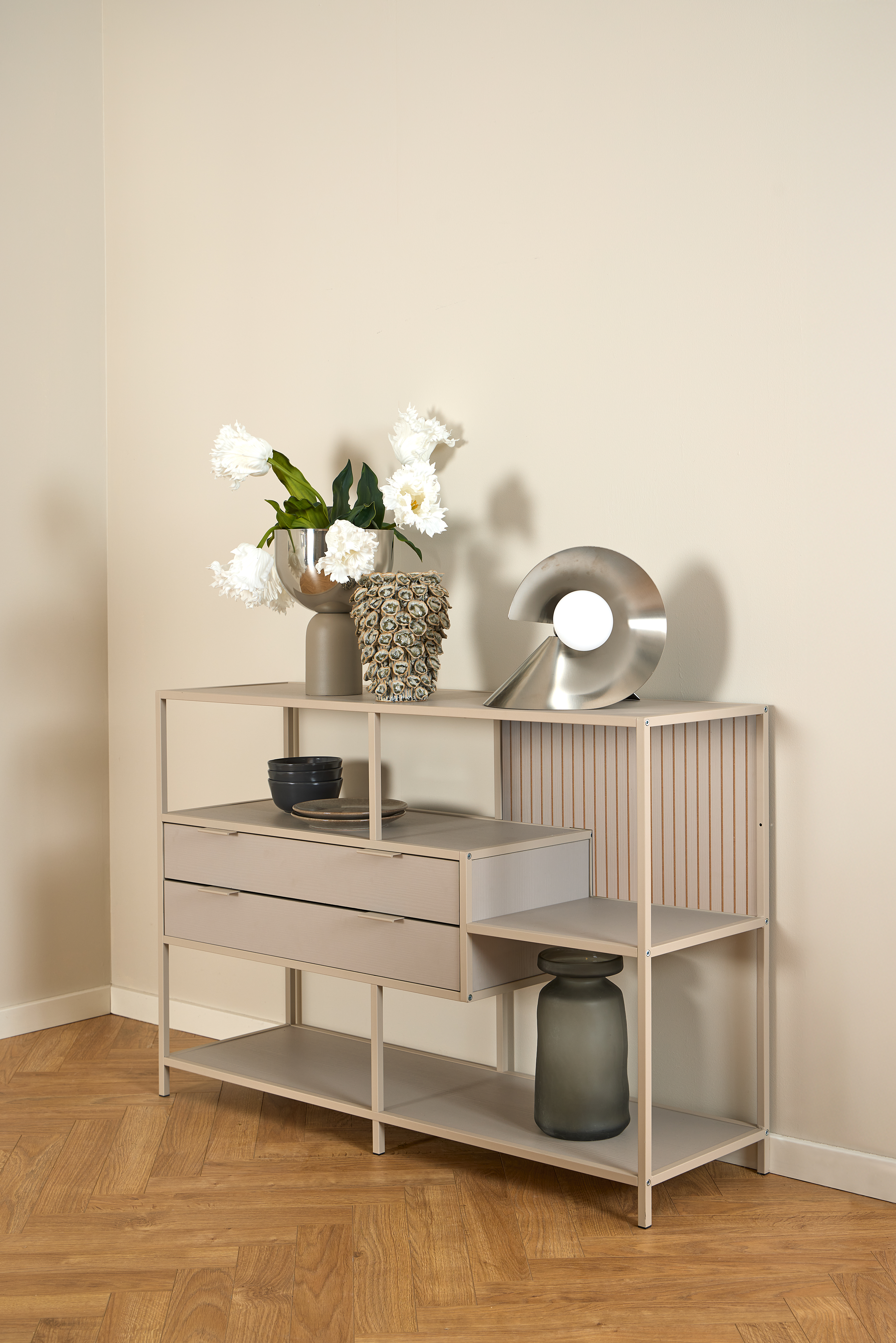 Sein dezentes, mattes Grau harmoniert perfekt mit unterschiedlichen Interieurs, vom klassischen Wohnzimmer über Home Office bis hin zum Flur oder Schlafbereich.