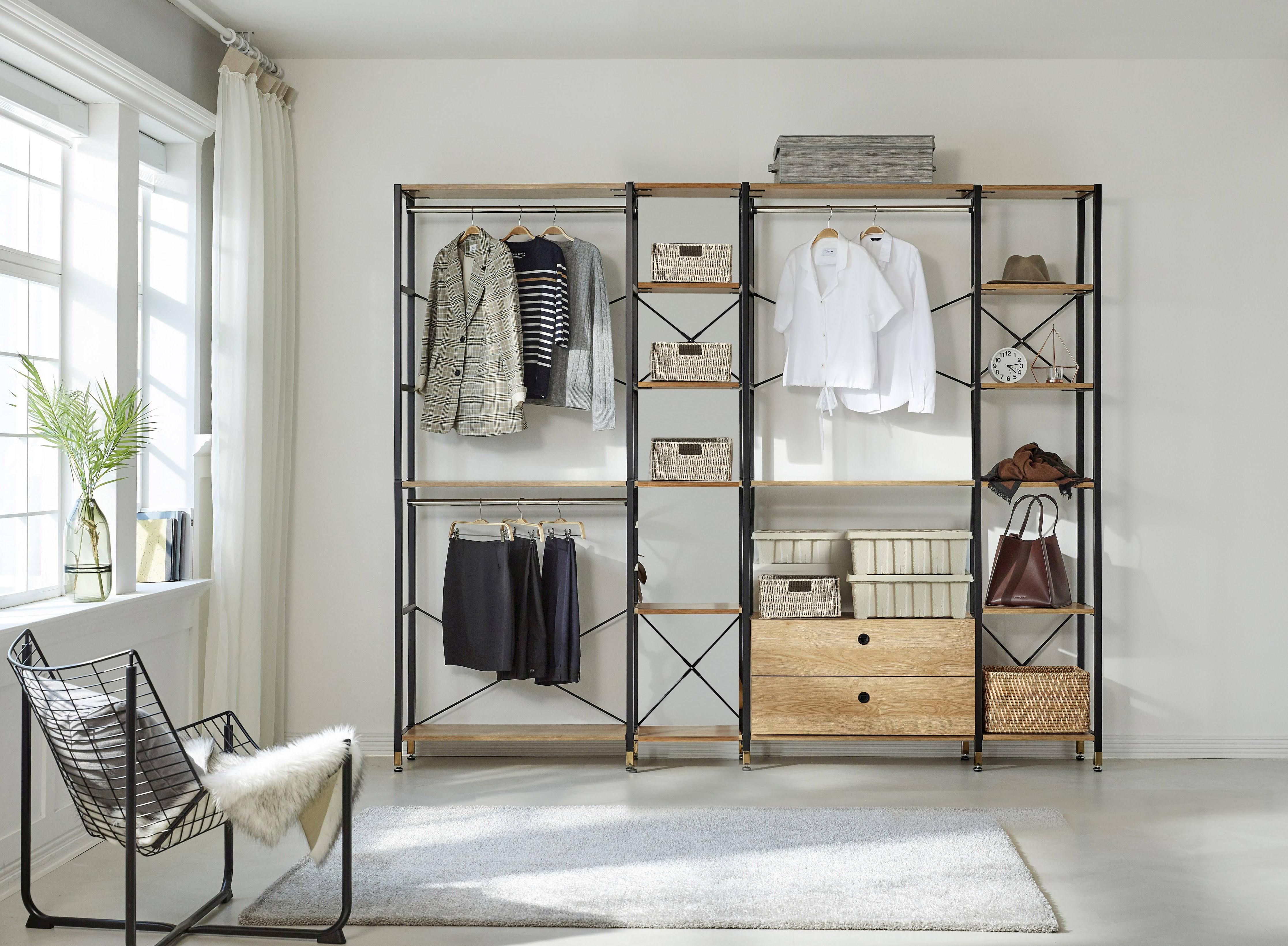 1 breites Regal mit 2 Böden, 1 Kleiderstange und 2 Schubkästen