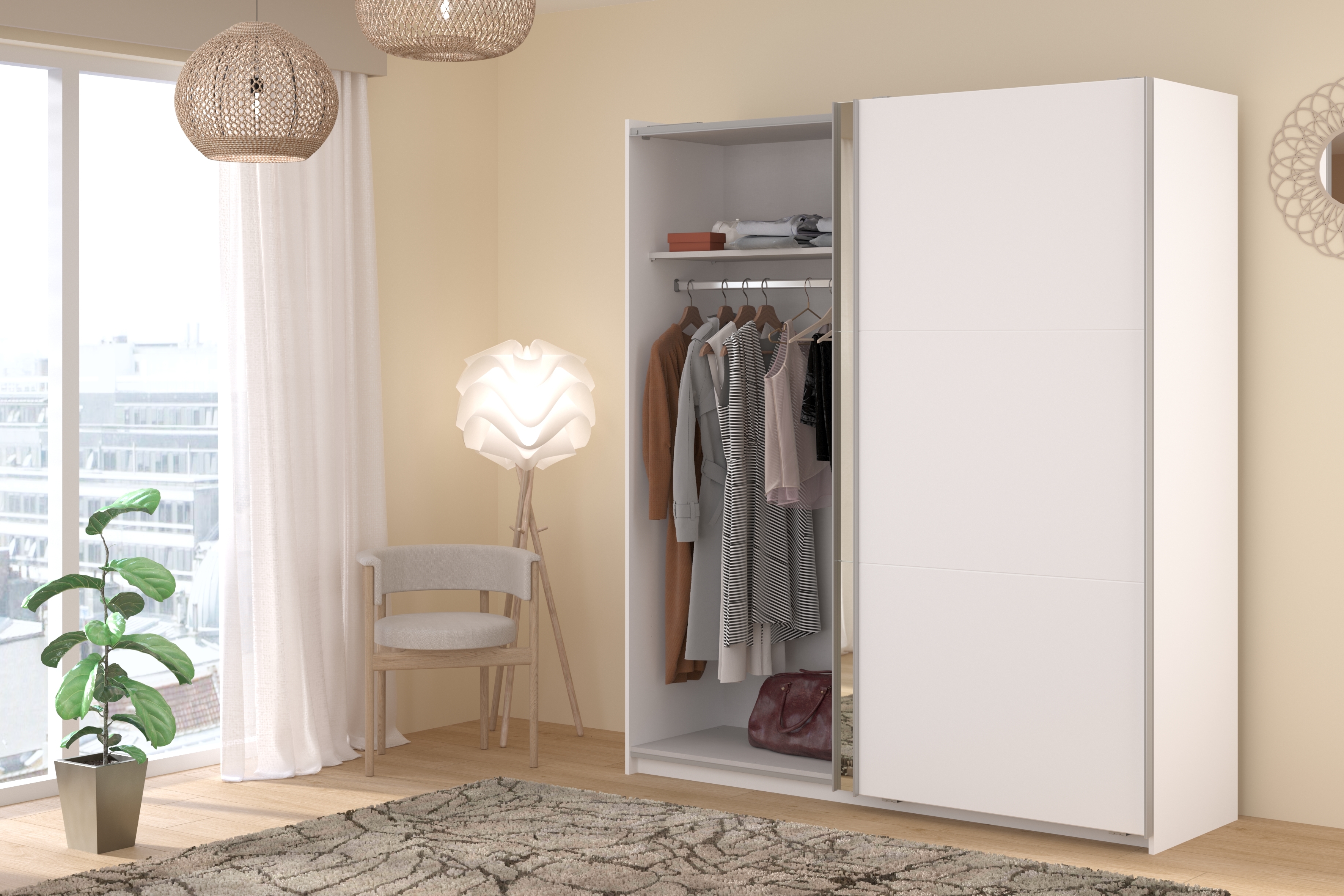 links: 1 Spiegeltür, dahinter 1 Stauraumfach mit 1 Kleiderstange