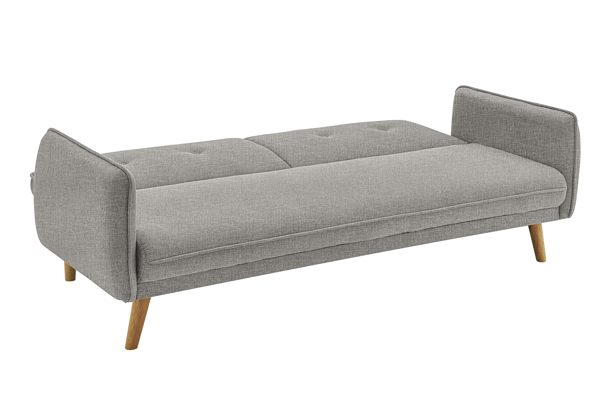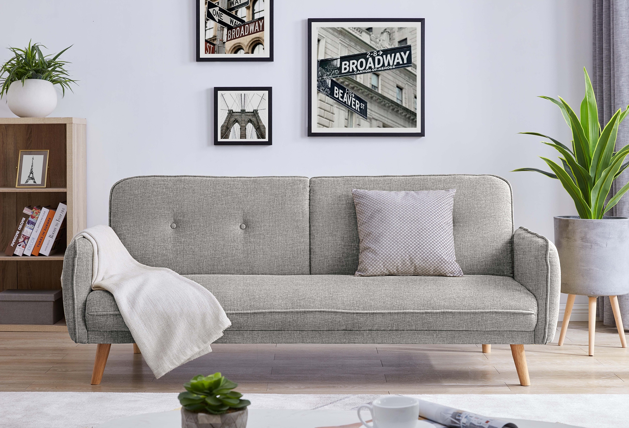 Dieses Sofa ist der ideale Kompagnon für Gäste- und Jugendzimmer oder auch kleine Wohnräume. Mit seinem skandinavischen Design verleiht das Sofa jeder Einrichtung ein modernes Flair. Liebevolle Details, wie die Knopfheftung im Rücken und die abgeschrägten Füße aus massivem Heveaholz, runden den Look gekonnt ab. Die gepolsterten Armlehnen laden zum Loungen und es sich gemütlich machen ein. Das besondere Extra – Das kompakte Sofa hat eine Schlaffunktion. Auf der großzügigen Liegefläche von 170x103x38 cm finden Übernachtungsgäste bequem Platz. Durch die Unterfederung wird der Sitz- und Liegekomfort optimal unterstützt. Der Bezug im feinen Strukturstoff ist nicht nur topaktuell und spiegelt den Look des Scandi Styles charakteristisch wieder – Er ist auch besonders robust und pflegeleicht. Ein echtes Allround-Talent im modernen Gewand.