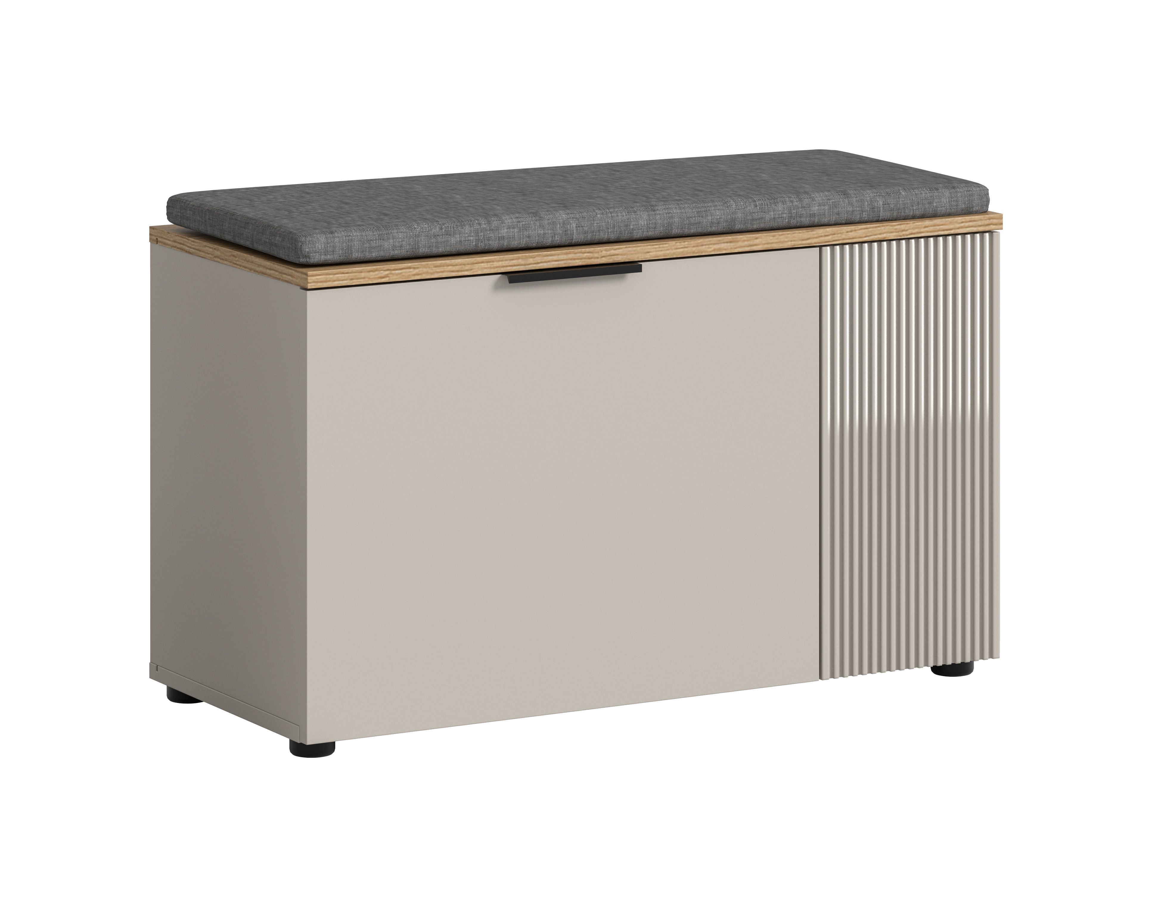 Diese stilvolle Sitzbank aus hochwertiger Kaschmir-Nachbildung vereint Komfort und Funktionalität. Mit den Maßen 80x48x36 cm bietet sie ausreichend Platz zum Sitzen und Verstauen. Zwei Türen und vier großzügige Fächer schaffen praktischen Stauraum, ideal für Ordnung im Eingangsbereich oder Wohnzimmer. Die Front mit eleganter Längstfräsung verleiht der Bank eine moderne, ansprechende Optik. Belastbar bis 90 kg – perfekt für den täglichen Gebrauch. Abgerundet wird diese Sitzbank mit einem grauen passendem Sitzkissen.