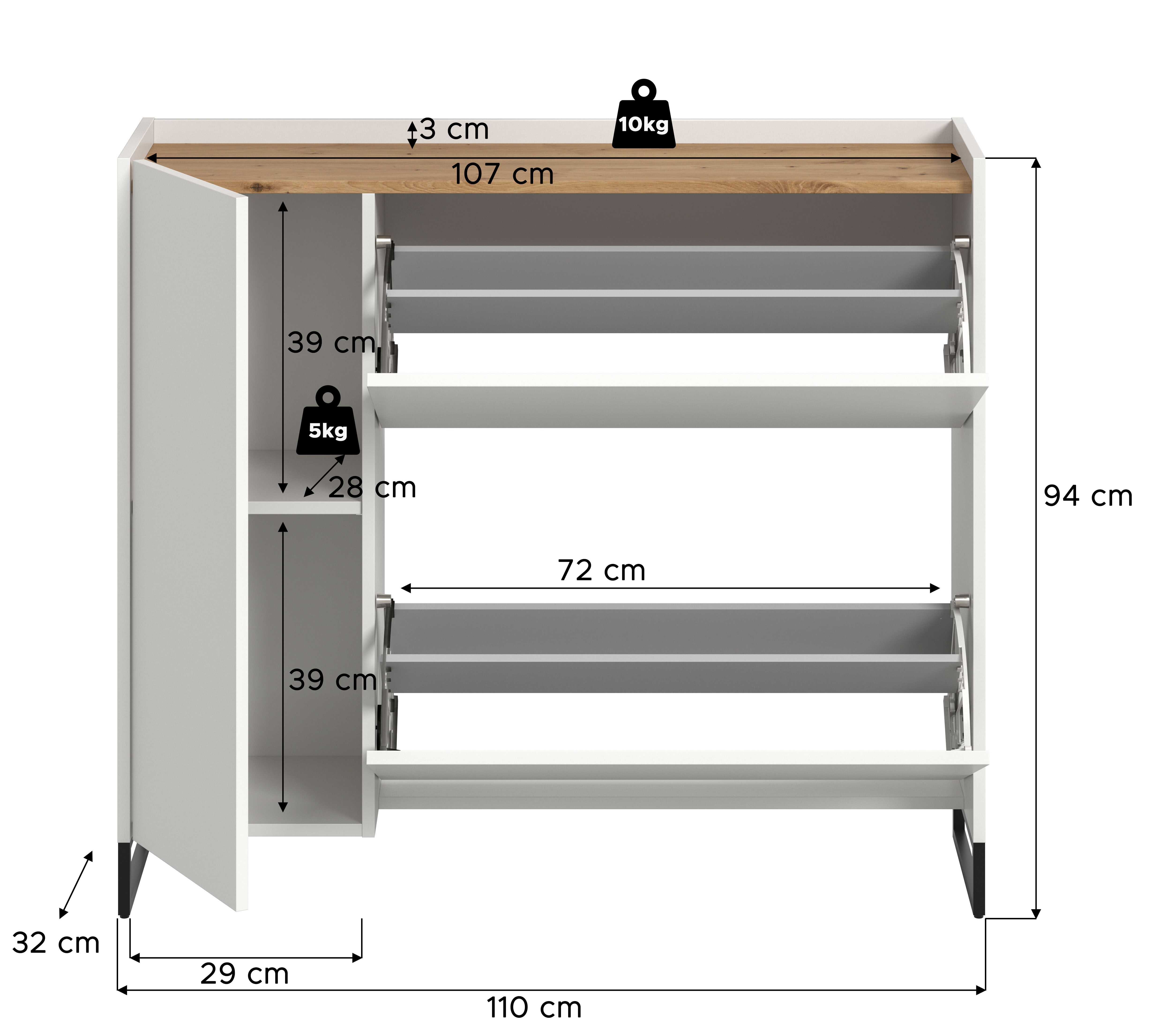 - 1 Tür, 1 höhenverstellbarer Einlegeboden, 2 Fächer, 2 Schuhwalzen, Platz für ca. 12 Paar Schuhe