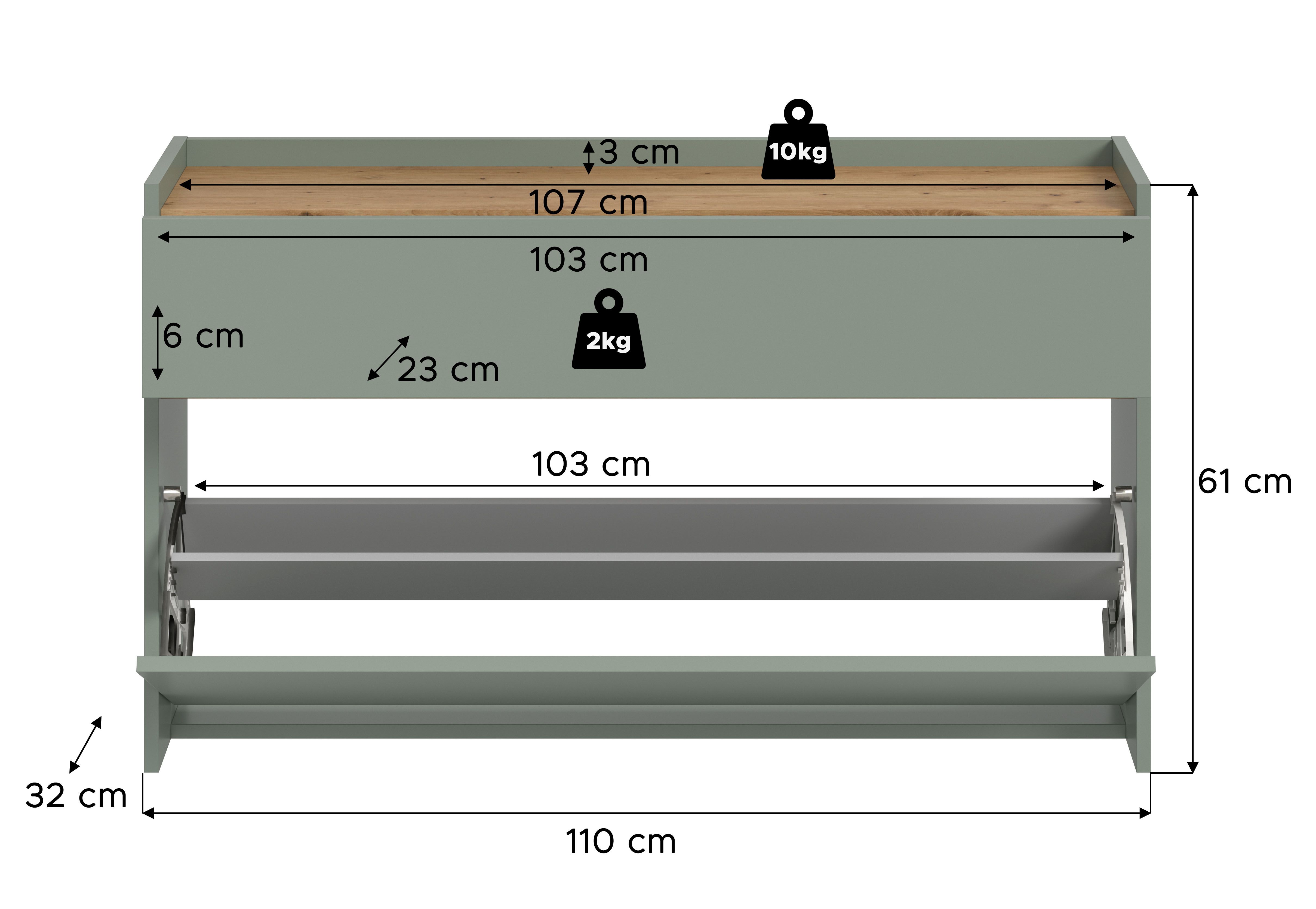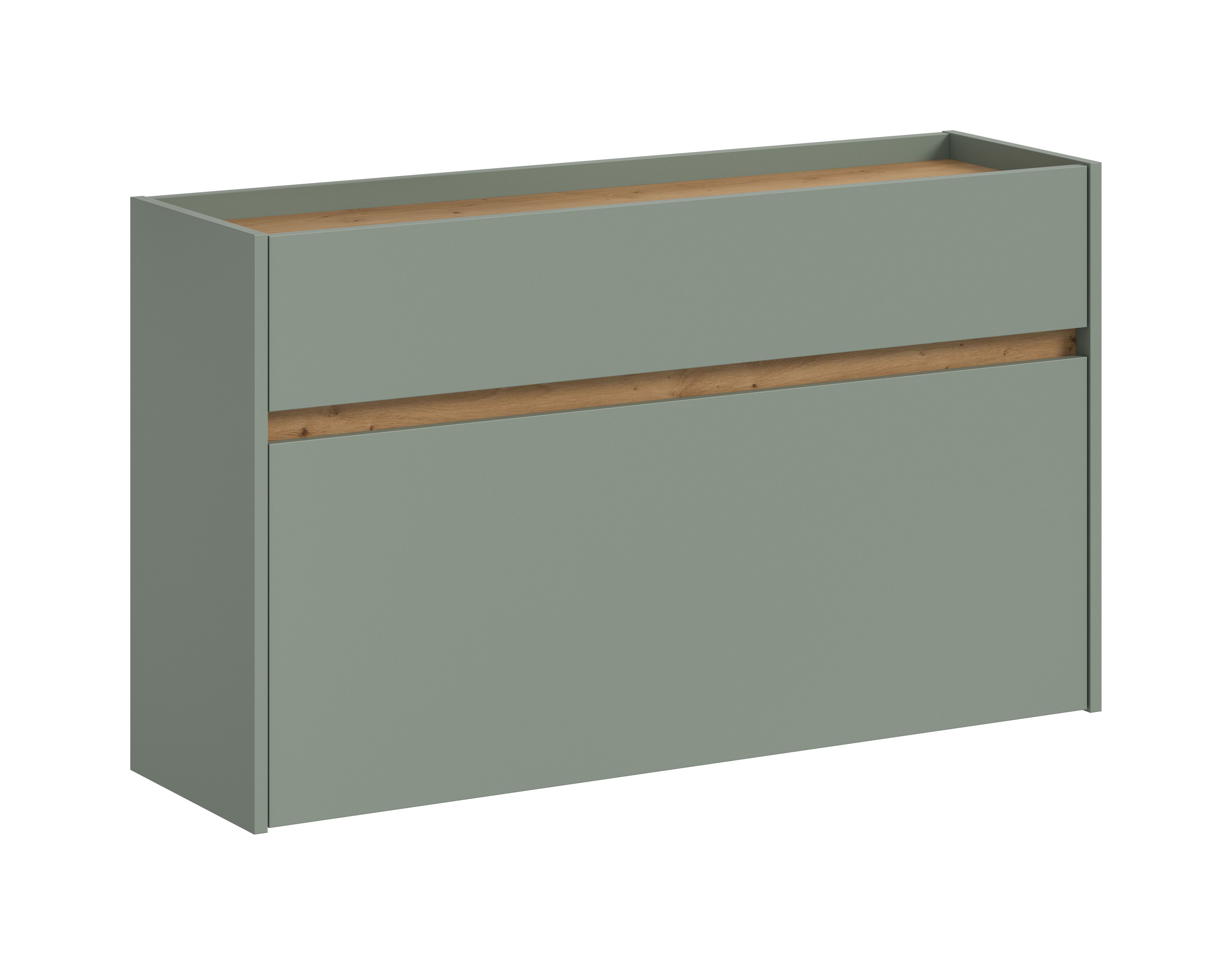 Die Schuhkommode 110x61x32 cm in Salbei und Artisan Oak Nachbildung mit 1 Schubkasten, 1 Schuhwalze bietet Platz für ca. 8 Paar Schuhe. FSC®-zertifizierter Holzwerkstoff steht für Nachhaltigkeit. Die pflegeleichte Oberfläche und schnelle Montage machen sie besonders nutzerfreundlich. Erweitere dein Zuhause flexibel mit weiteren Artikeln der Serie. Für mehr Ordnung und Stil.