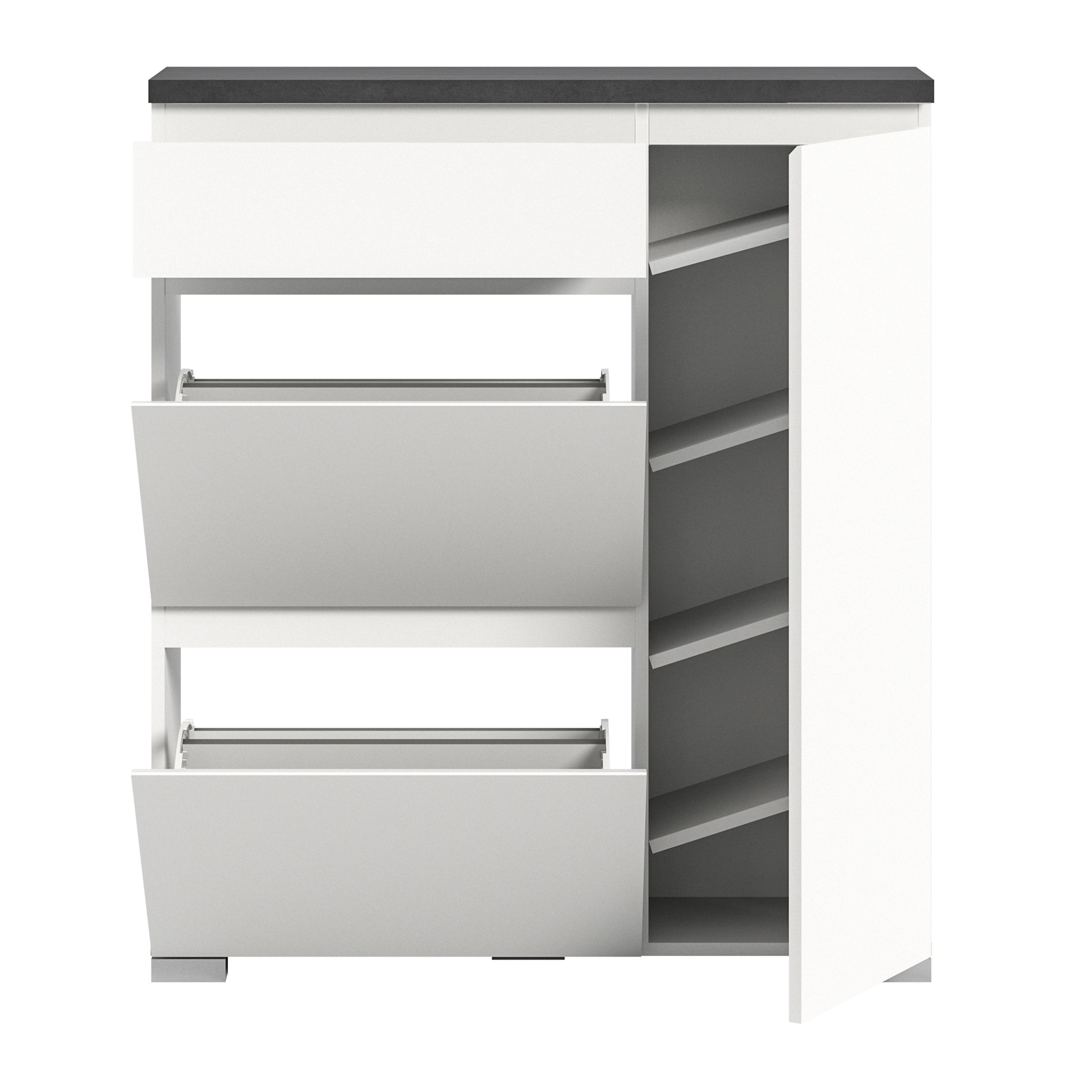 In unserer HADERO Serie präsentieren wir einen kombinierbaren Schuhschrank in stilvollem und zeitlosem Weiß mit einem Oberboden in Industrial Grau, der deinem Eingangsbereich einen modernen Touch verleiht. Mit seiner vielseitigen Gestaltung kannst du ihn nach deinen Bedürfnissen anpassen und so deine Schuhsammlung stilvoll organisieren. Entdecke die perfekte Symbiose aus Funktionalität und Design mit diesem flexiblen Schuhschrank.