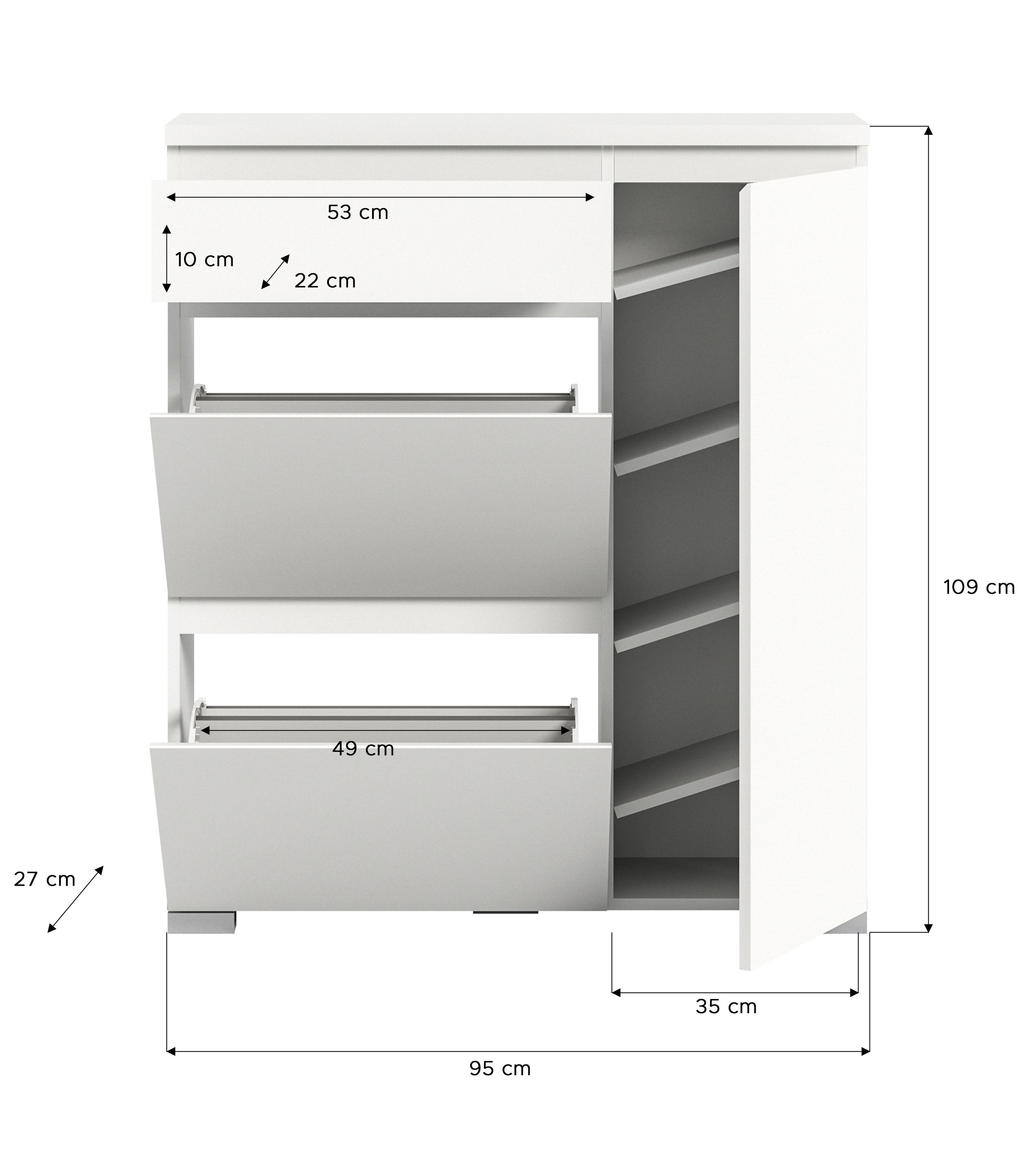 - Funktionalität: Mit seinen kompakten Abmessungen bietet der Schuhschrank ausreichend Stauraum für Schuhe und andere Accessoires, während er gleichzeitig Platz spart und den Raum optimal nutzt, was zu einer effizienten Organisation beiträgt.