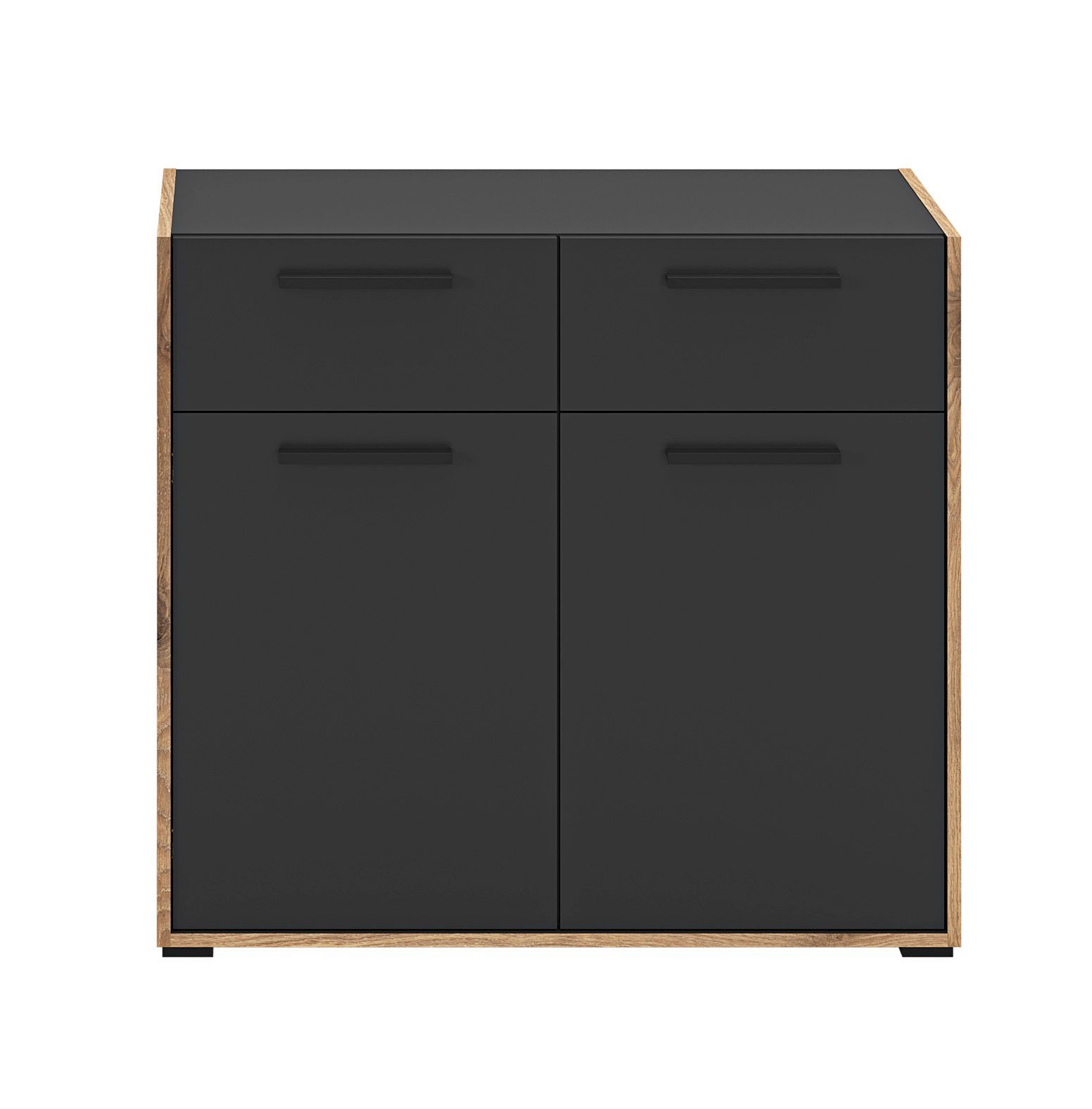 Diese Kommode bietet Ihnen nicht nur großzügigen Stauraum, sondern sorgt auch für mehr Ordnung und Übersichtlichkeit in Ihrem Zuhause – so wird Ihr Alltag spürbar leichter und angenehmer. Stellen Sie sich vor, wie Ihre Wohnräume mit diesem stilvollen Möbelstück an Eleganz gewinnen und eine Wohlfühlatmosphäre entsteht, die zum Verweilen und Entspannen einlädt. Gefertigt aus hochwertigem Basalt Melamin besticht die Kommode durch ihr modernes, zeitloses Design und ihre robuste Verarbeitung. Zwei Schubkästen mit praktischem Vollauszug ermöglichen Ihnen einen leichten Zugriff auf Ihre Utensilien, während zwei Türen zusätzlichen Stauraum verbergen. Die pflegeleichten Oberflächen lassen sich mühelos reinigen, sodass die Kommode auch im täglichen Gebrauch stets makellos bleibt. Mit den Maßen von 95 cm Breite, 86 cm Höhe und 37 cm Tiefe passt sie perfekt in unterschiedlichste Räume – ob im Wohnzimmer, Schlafzimmer oder Flur. Nutzen Sie die Schubkästen für Kleidung oder Bürobedarf, die Türen für Bücher, Schuhe oder Dekorationsgegenstände und schaffen Sie so ein aufgeräumtes Umfeld, das Ihren persönlichen Stil unterstreicht.