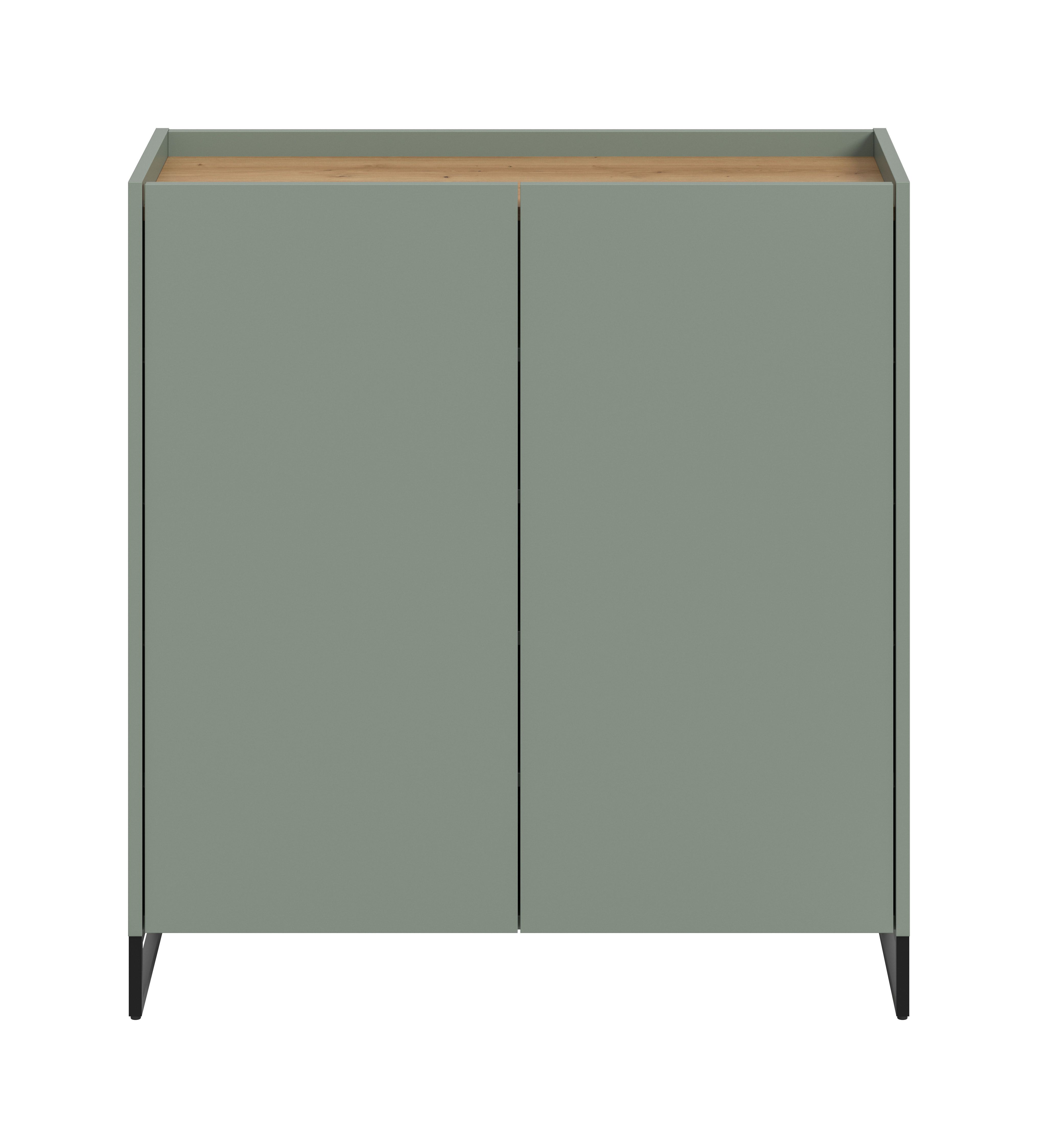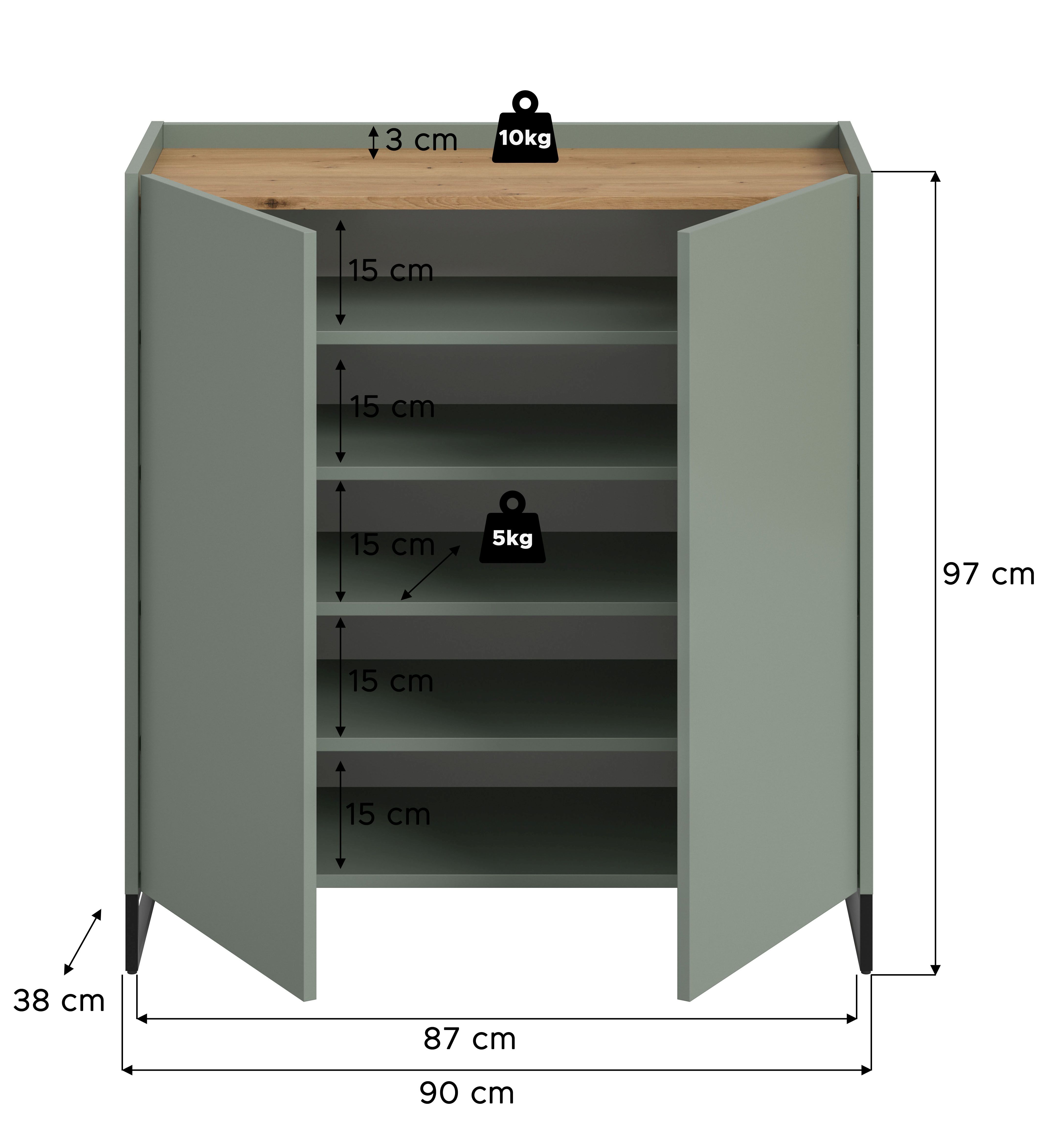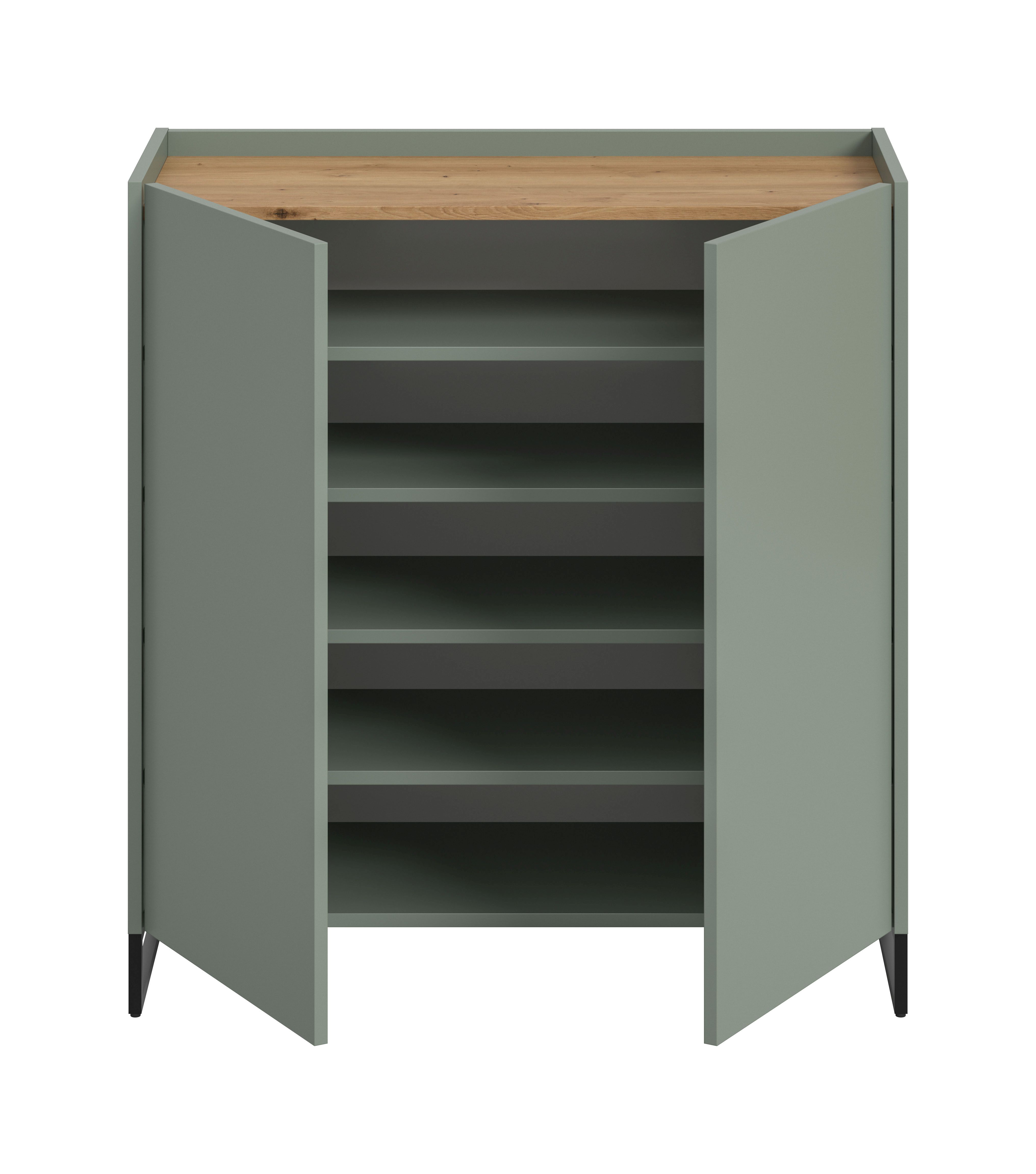 Die Schuhkommode 90x97x38 cm in Salbei und Artisan Oak Nachbildung bietet mit 2 Türen, 4 höhenverstellbaren Einlegeböden und 5 geschlossenen Fächern Platz für ca. 18 Paar Schuhe. FSC®-zertifizierter Holzwerkstoff steht für Nachhaltigkeit. Die pflegeleichte Oberfläche und schnelle Montage machen sie besonders praktisch. Erweitere dein Zuhause flexibel mit weiteren Artikeln der Serie. Für Ordnung und Stil im Flur.