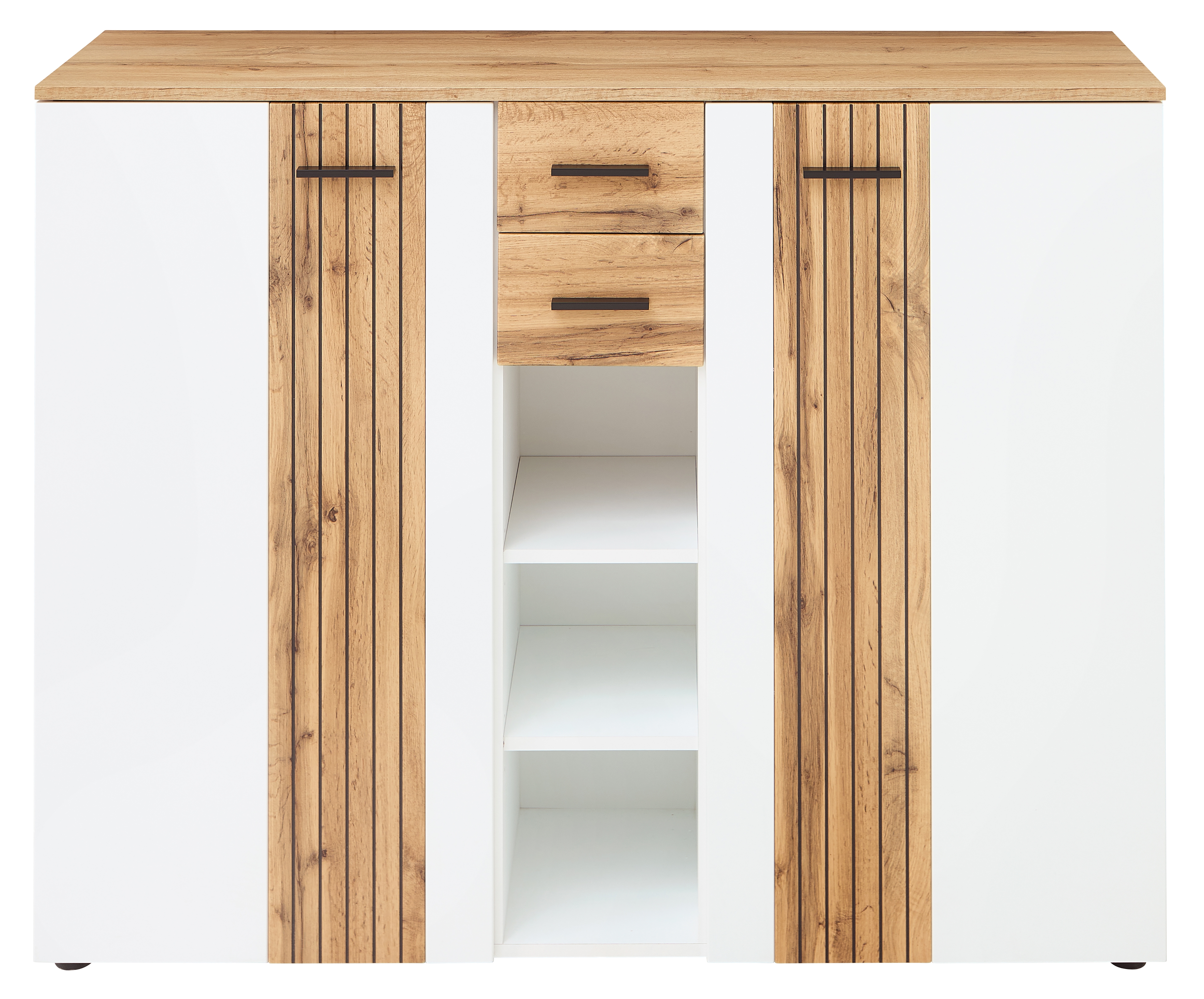 Front: MDF (Mitteldichte Holzfaserplatte) in Weiß supermatt mit Absetzungen in Eiche Altholz MDF in Leistenoptik