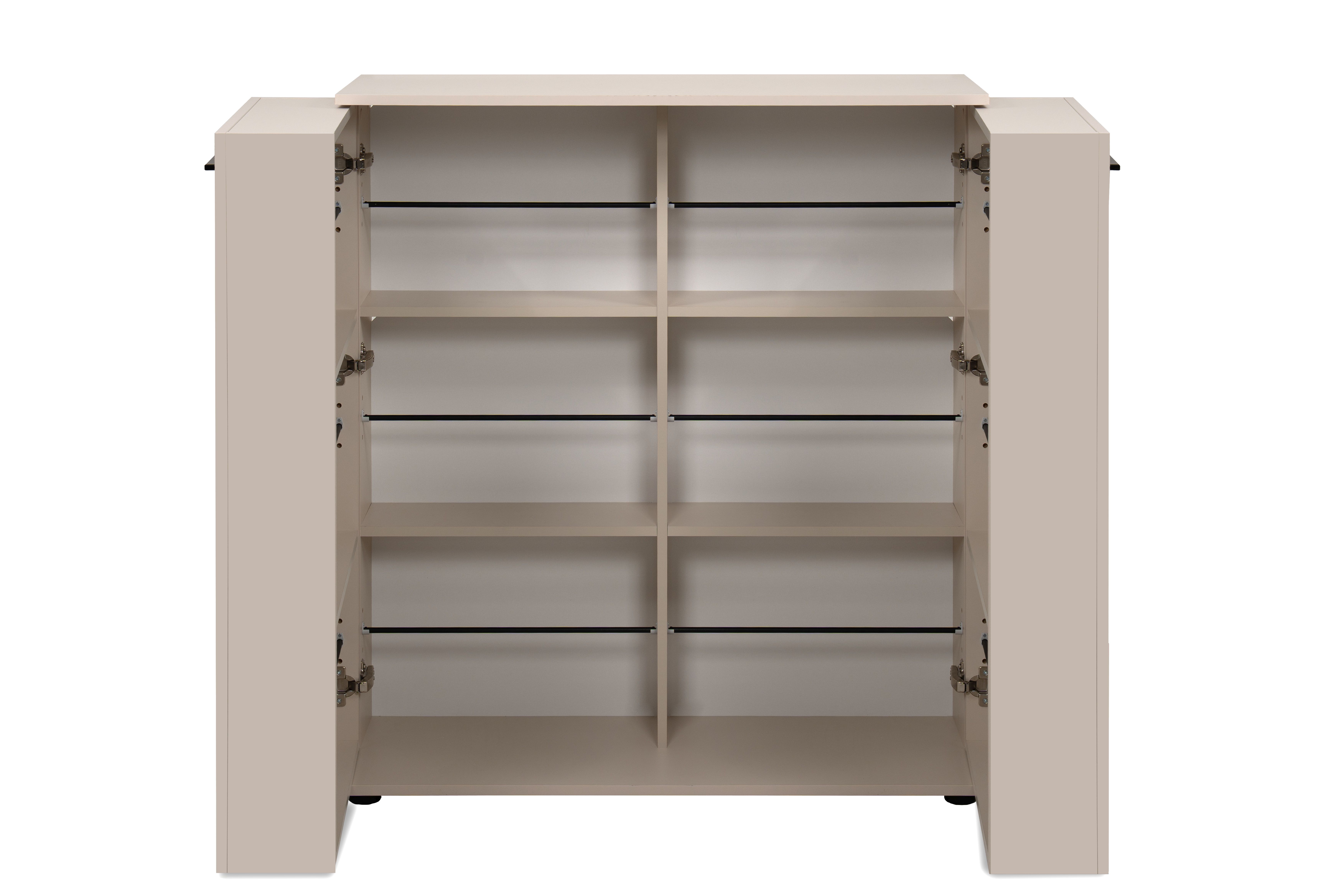 2 Türen mit jeweils 2 Einlegeböden und 3 Kunststoffstangen zur Schuhfixierung